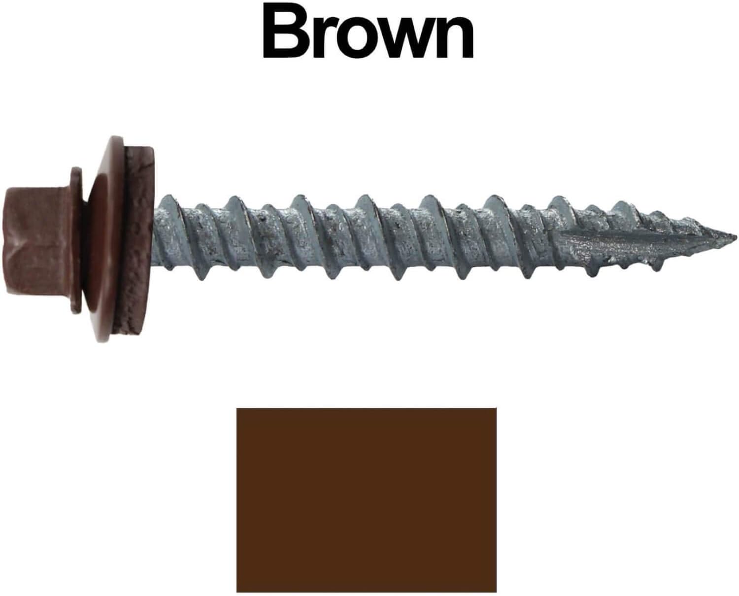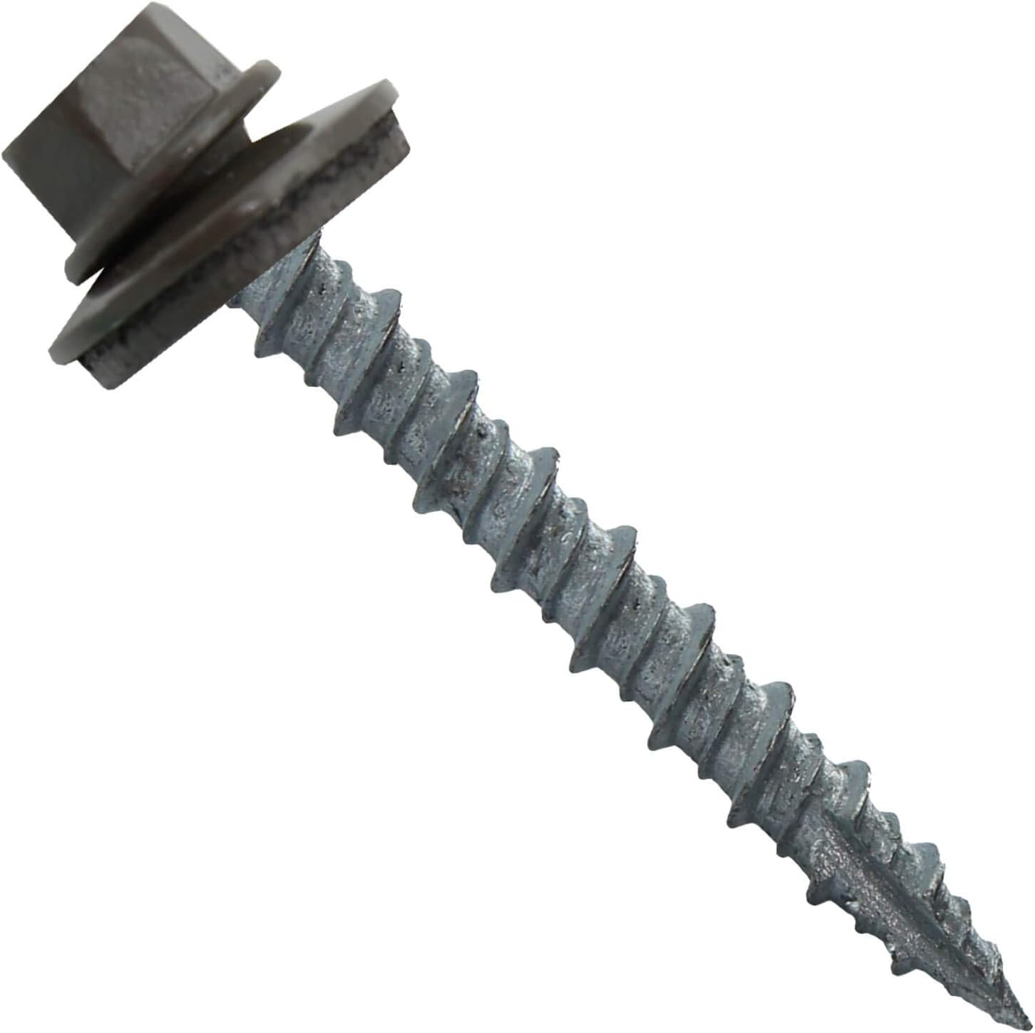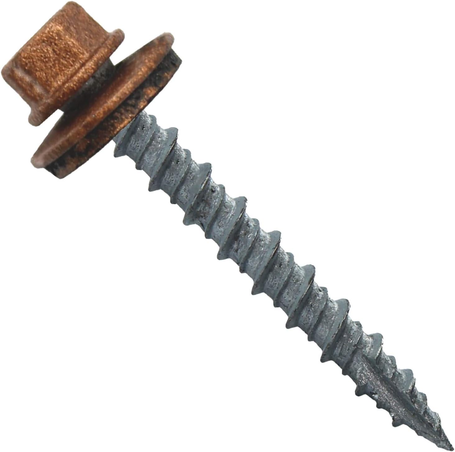 #10 BURGUNDY x 1 1/2 Inch Long Sheet Metal Roofing Screws (1000 Count) with hex washer head.