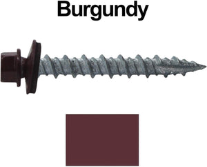 **Roofing Screw COLOR MATCH : BURGUNDY = Mill Steel - Valspar - Berry; A B Martin - Burgundy; Global Metal Manufactures - Burgundy; Graber Post Buildings - Burgundy; Harlan Steel Building - Burgundy; Hixwood Metal Roofing - Burgundy; Ideal Roofing - Burgundy; Integrity Metals - Burgundy; Interstate Metals - Burgundy; J & L Metal - Burgundy; Longreach Steel - Burgundy; Metro Metals - Burgundy; Mid Park Metals - Burgundy; Mill Steel - AkzoNobel - Burgundy; Miller Metal - Burgundy; Neo Metals - Burgundy; North Star Metals - Burgundy; Paramount Coils - Burgundy; Piedmont Door Service - Burgundy; Qualiform Metals - Burgundy; Quality Metal Roofing - Berry; Sheffield Metals - Burgundy; Slabaugh Metal Sales - Burgundy; Tri-State Components (NC) - Vintage Burgundy; Union Steel - Burgundy; United Steel Supply - Berry; Weatheredge - Burgundy; World Class Corrugating - Burgundy; WV Metal - Burgundy. Please keep in mind when choosing the best screw color to match your roofing that differences in computer screens, in sheet metal roofing production and roofing screw production, the color you order and the color of your roofing may vary to some degree."