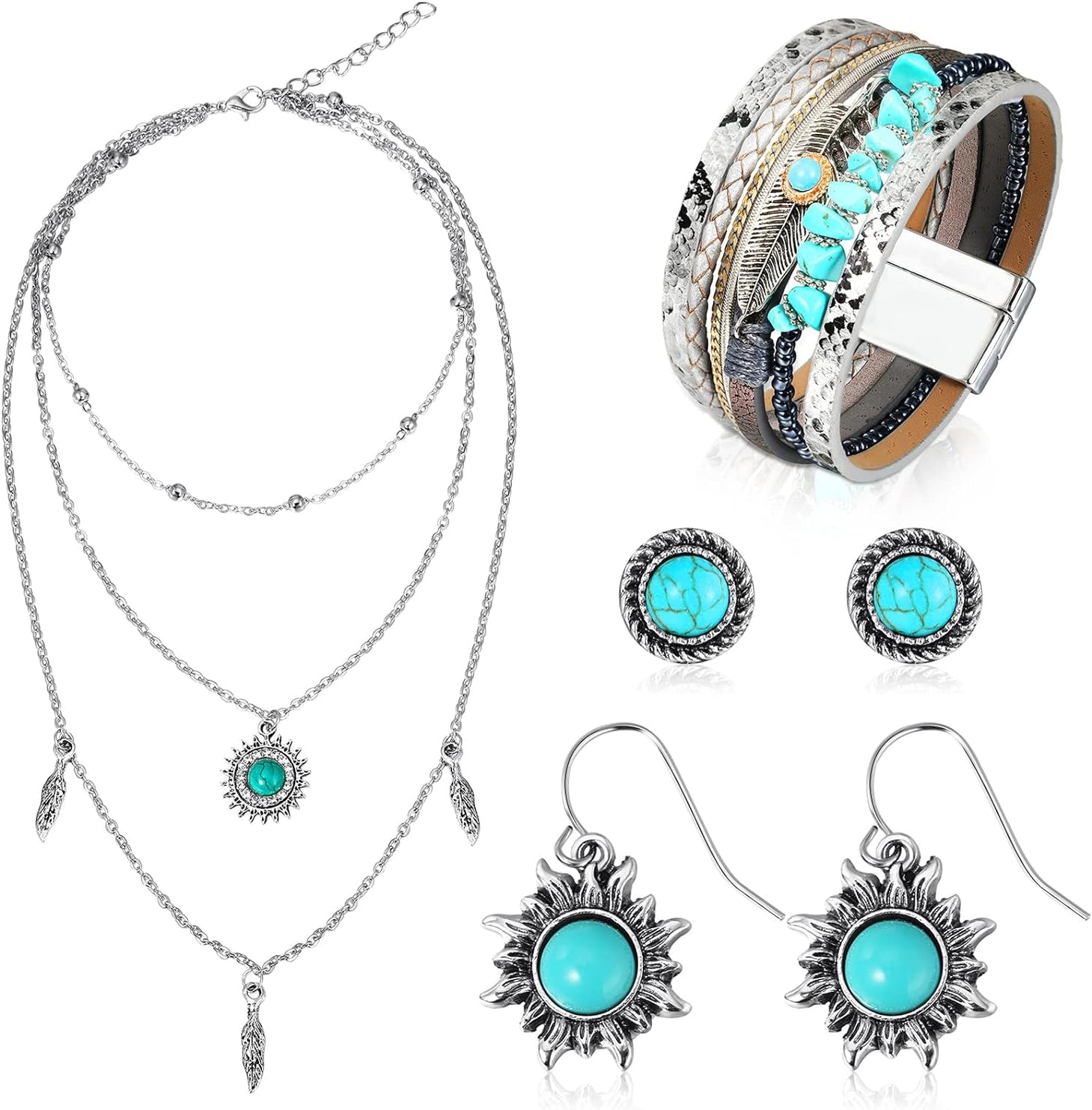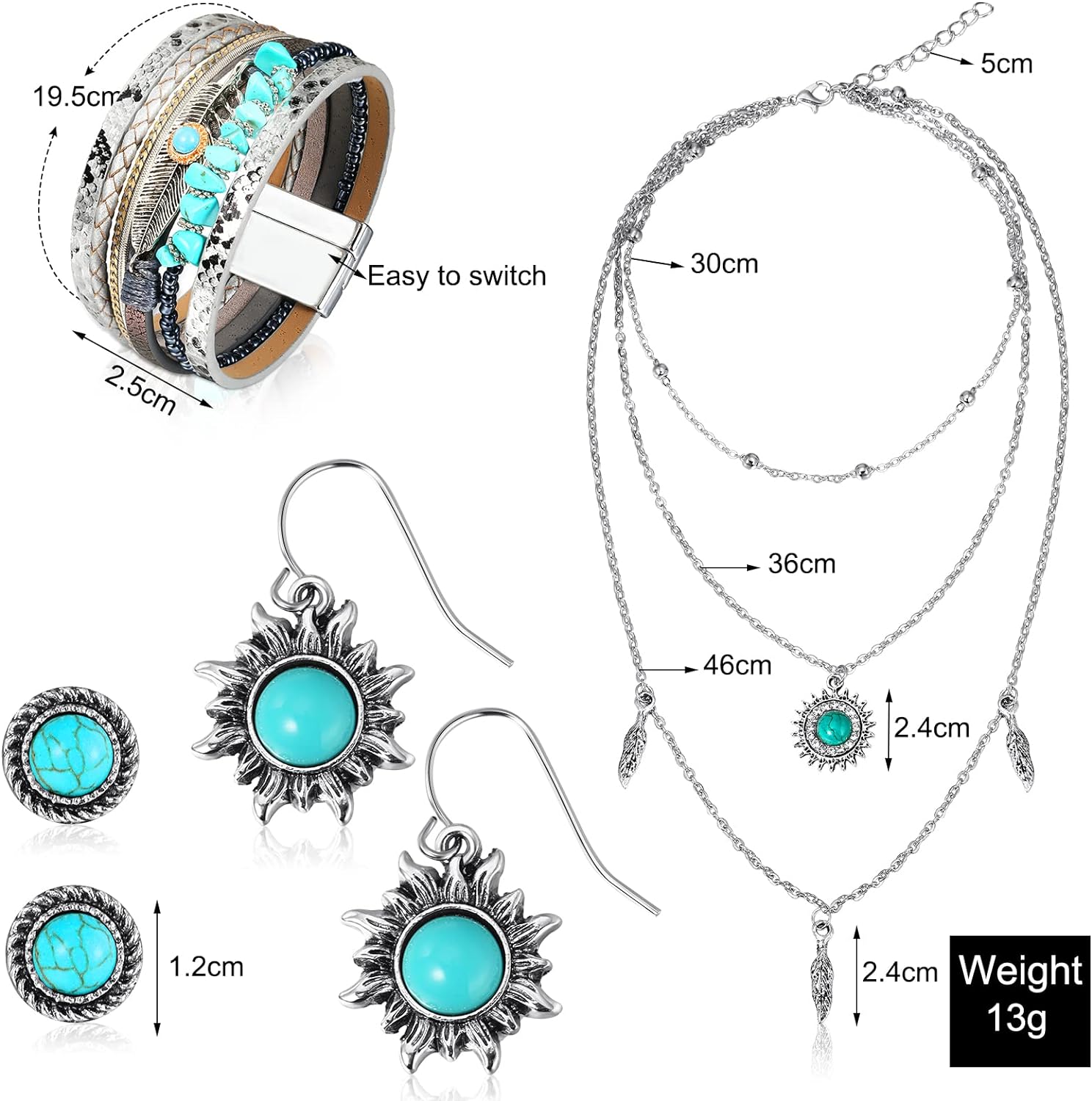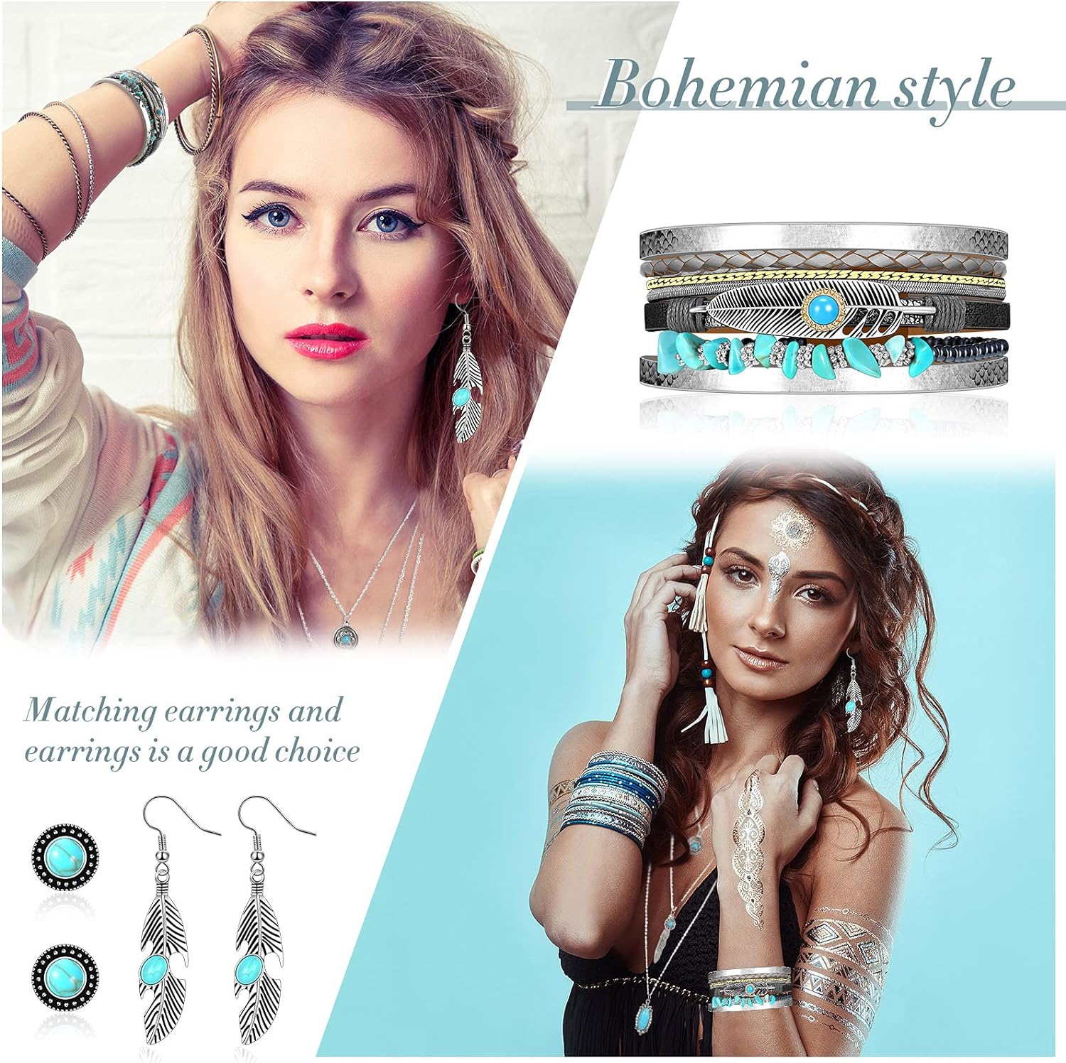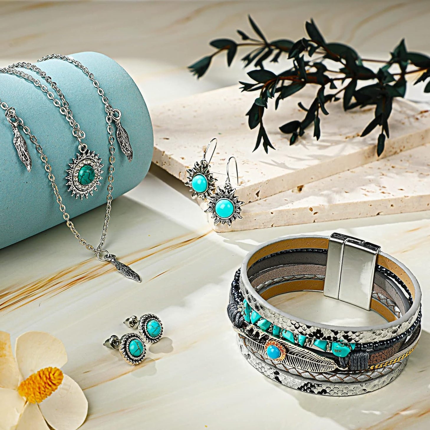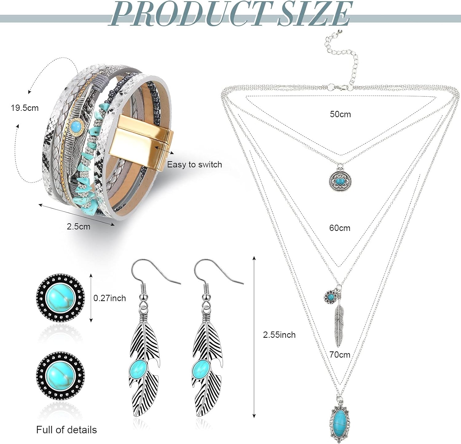6 Pcs Western Jewelry for Women Boho Turquoise Necklace Bracelet Earring Jewelry Set Bohemian Dangle Earrings Multi Strand Feather Wrap Bracelet for Women