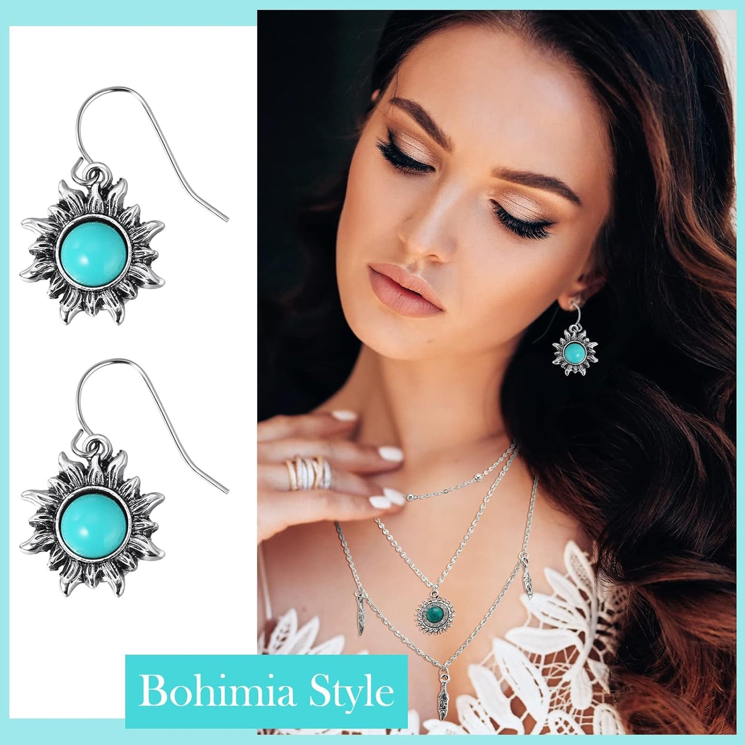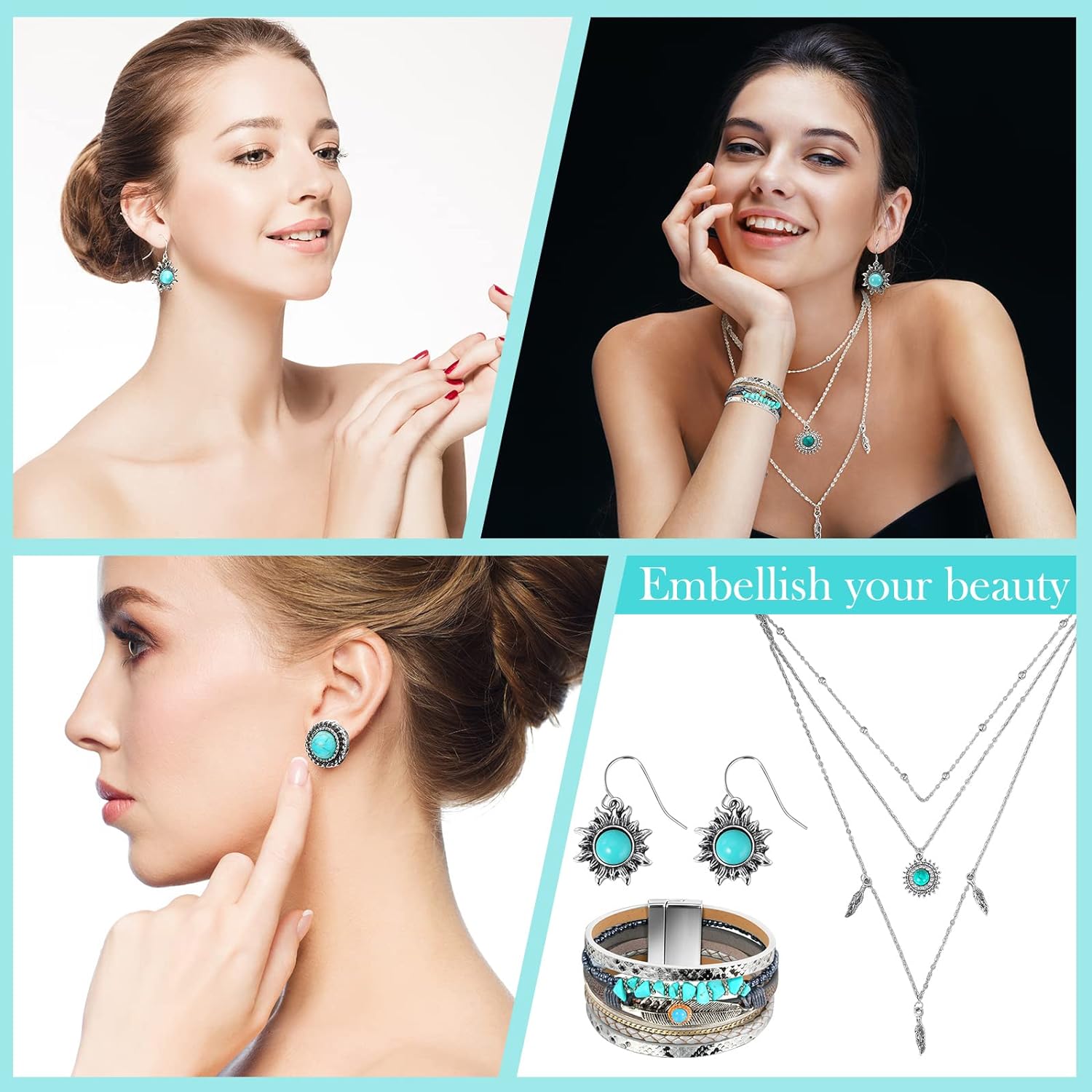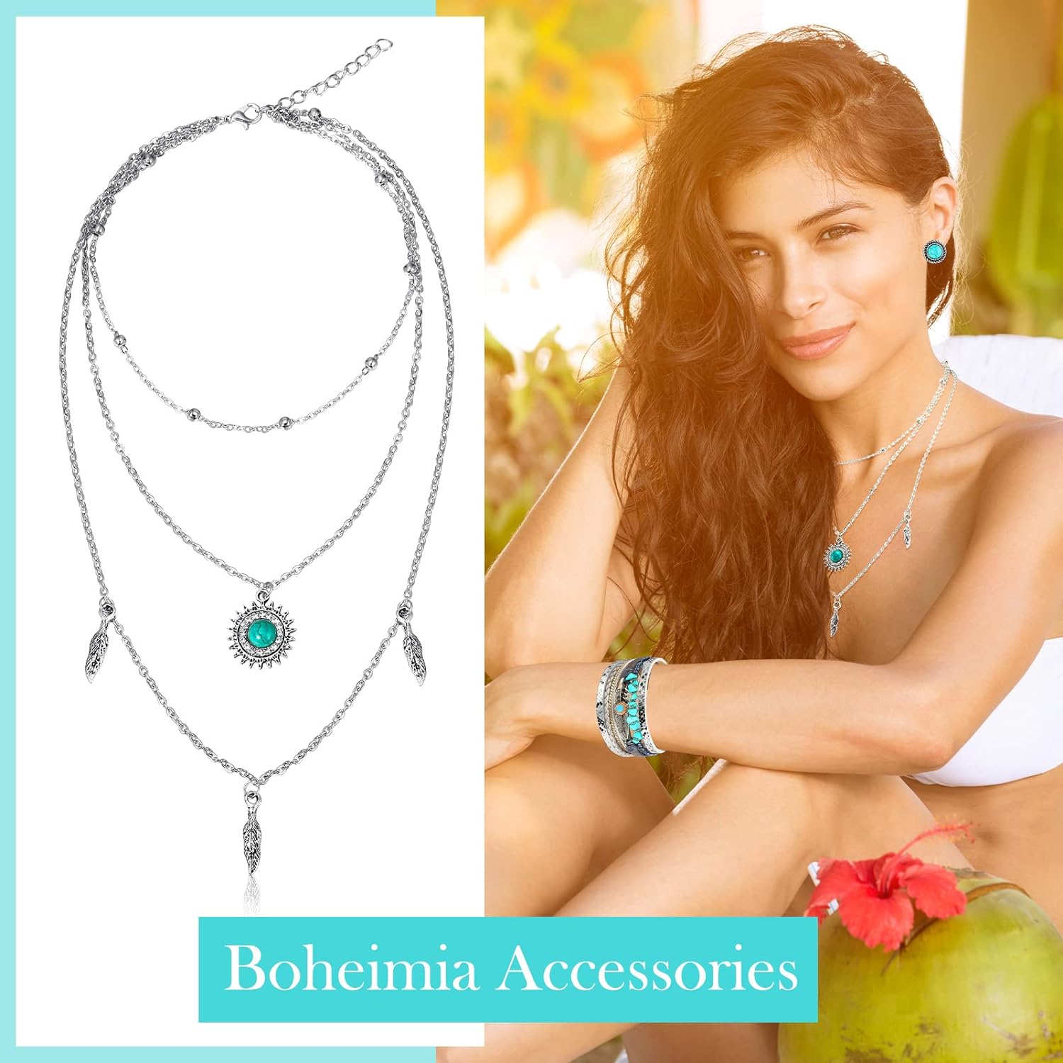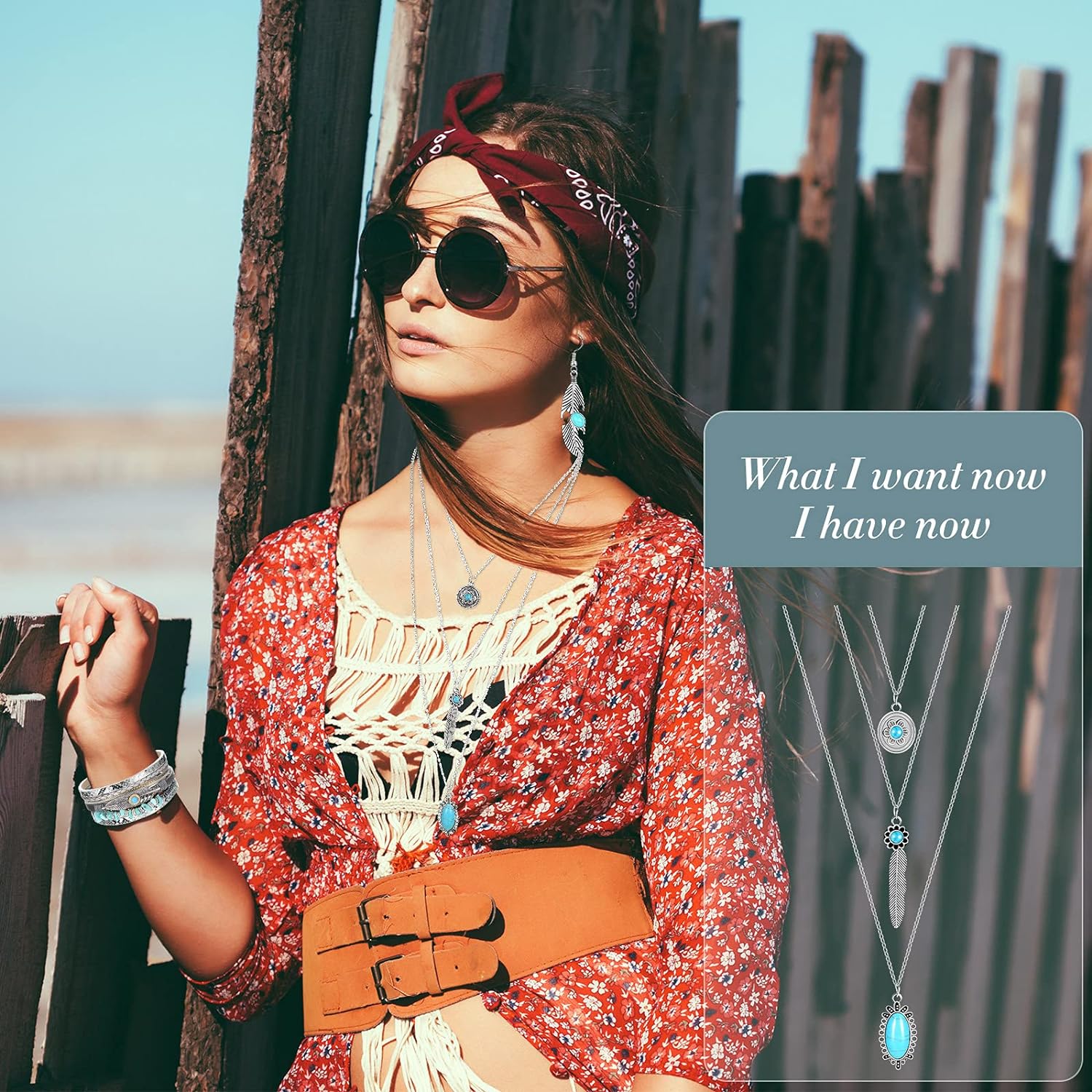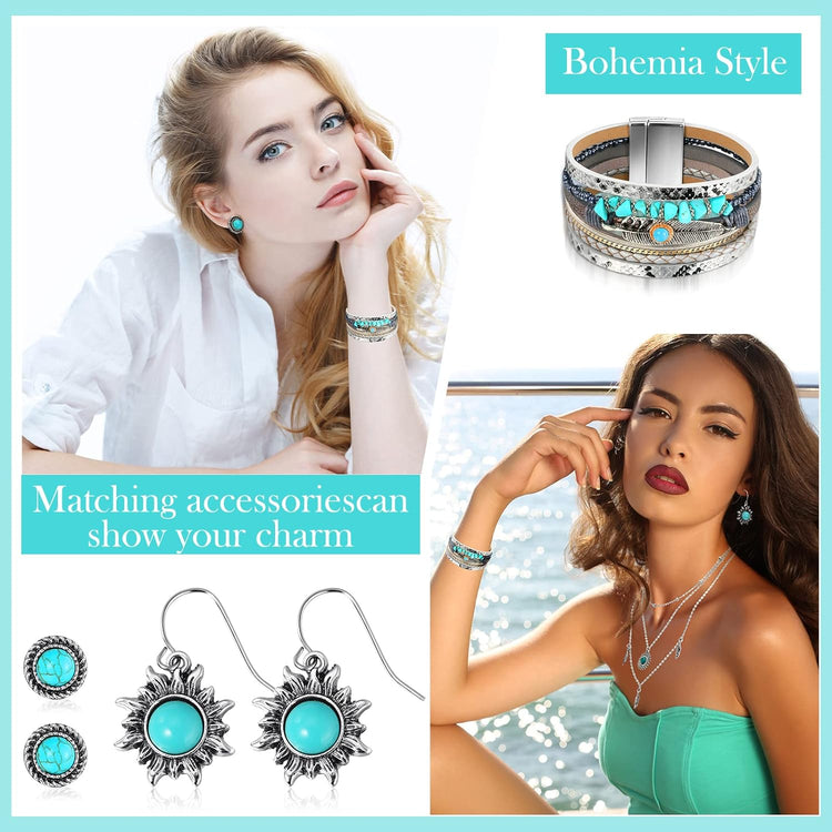 6 Pcs Western Jewelry for Women Boho Turquoise Necklace Bracelet Earring Jewelry Set Bohemian Dangle Earrings Multi Strand Feather Wrap Bracelet for Women