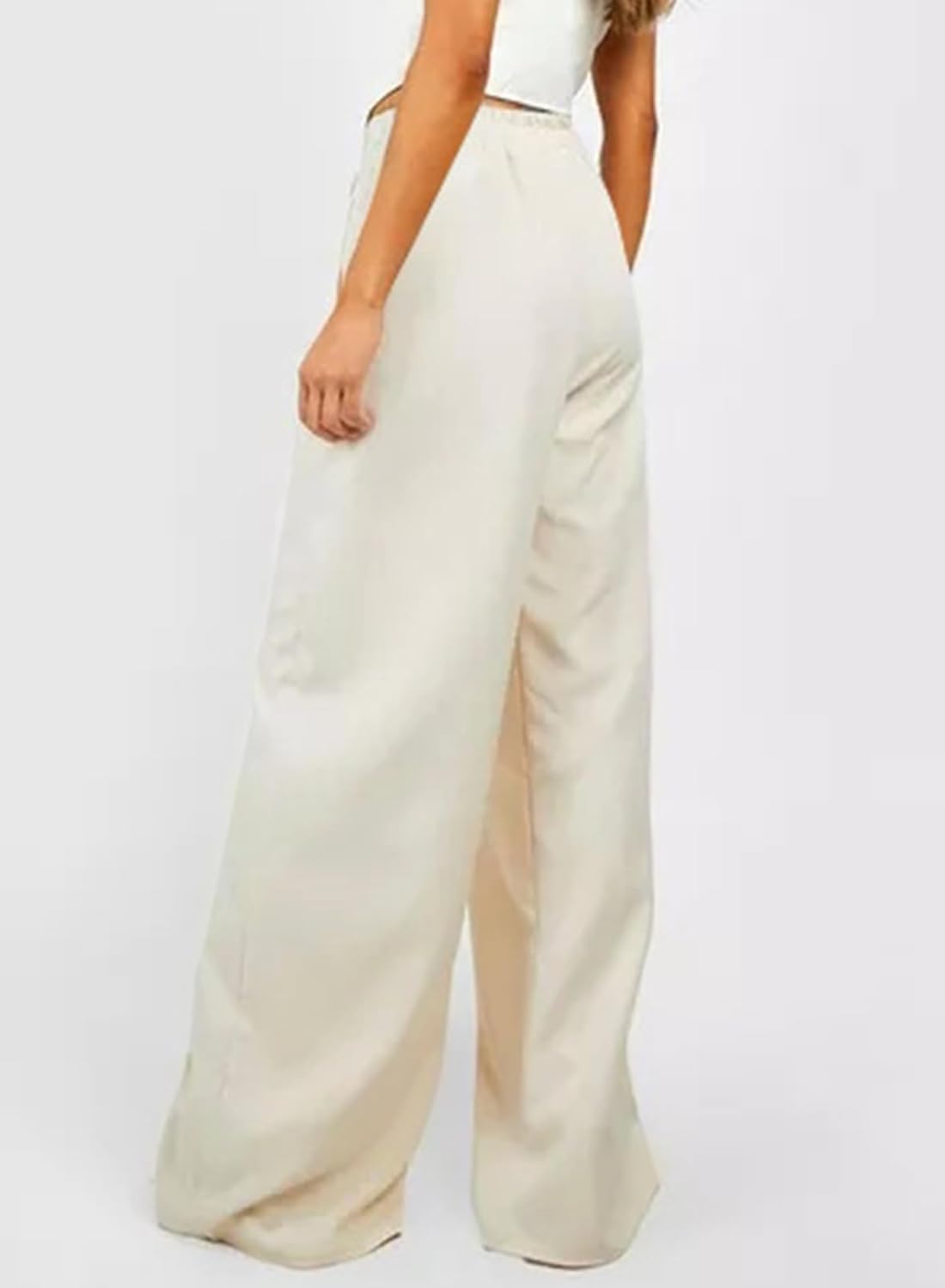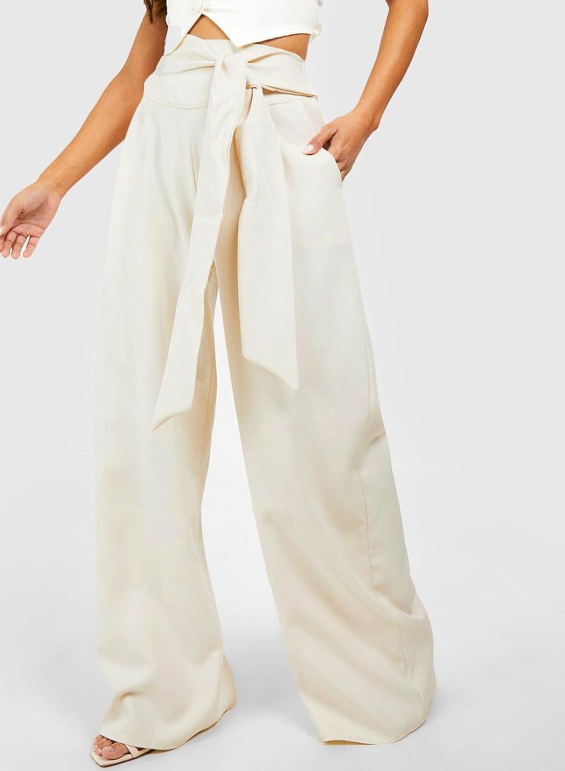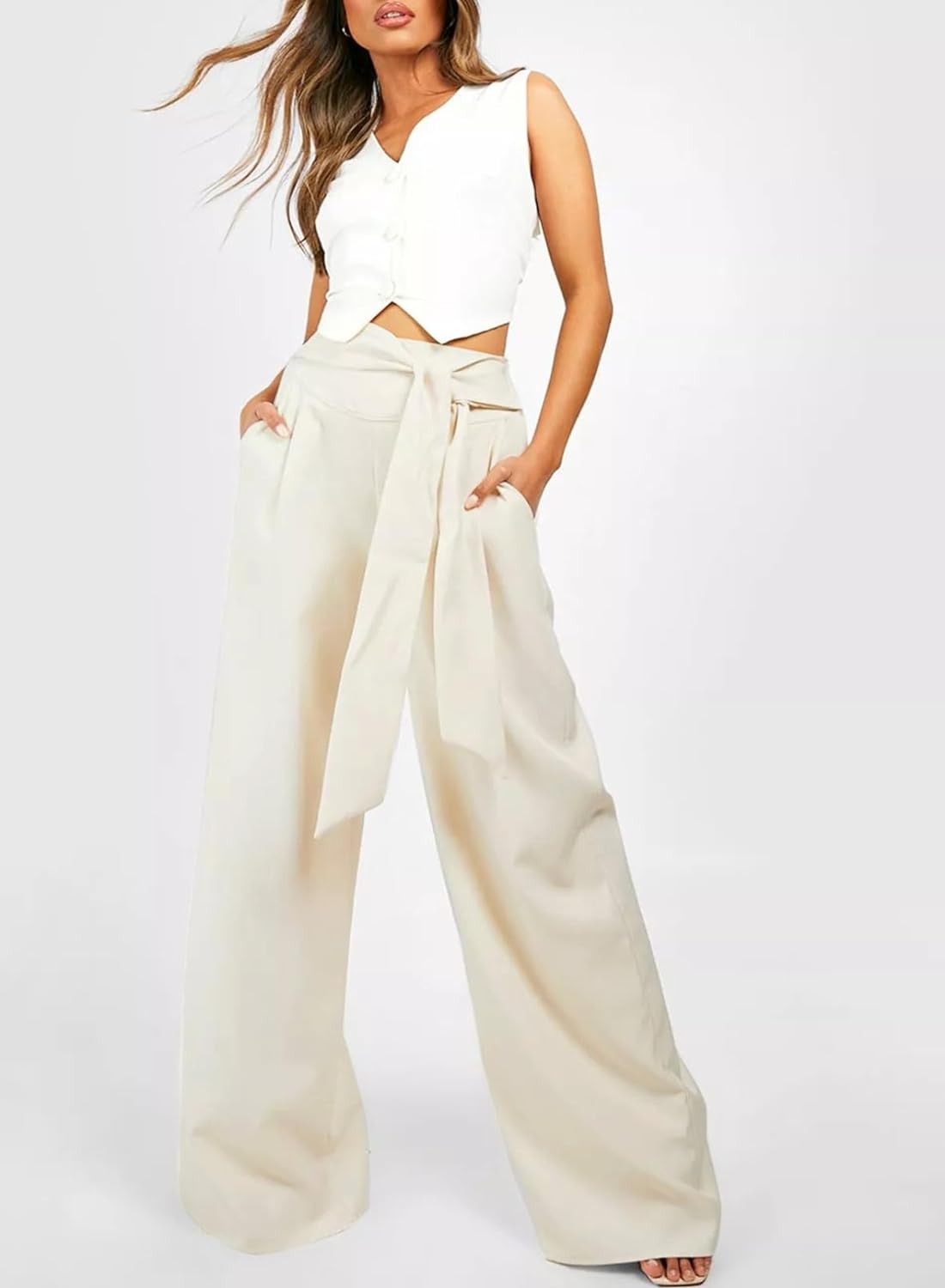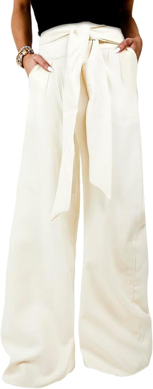 Acelitt Women Casual Wide Leg Pants Belted Elastic Waist Y2K Pants with Pockets, S-XXL