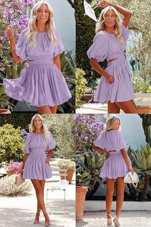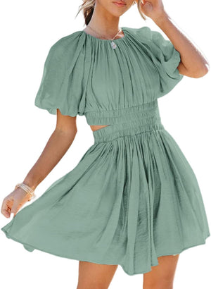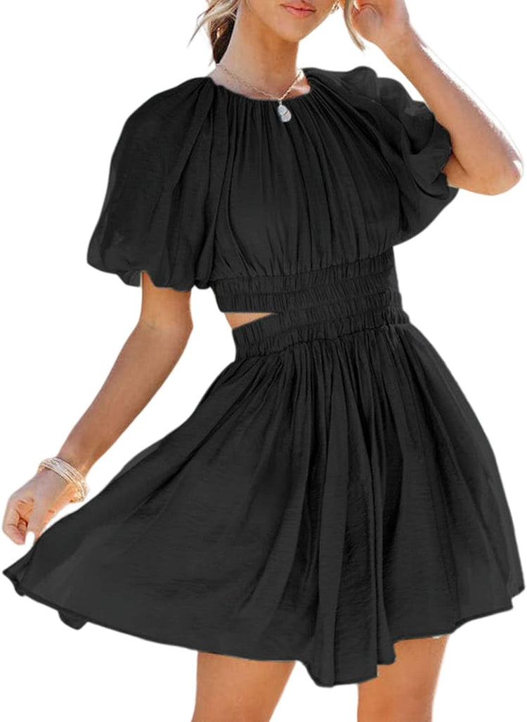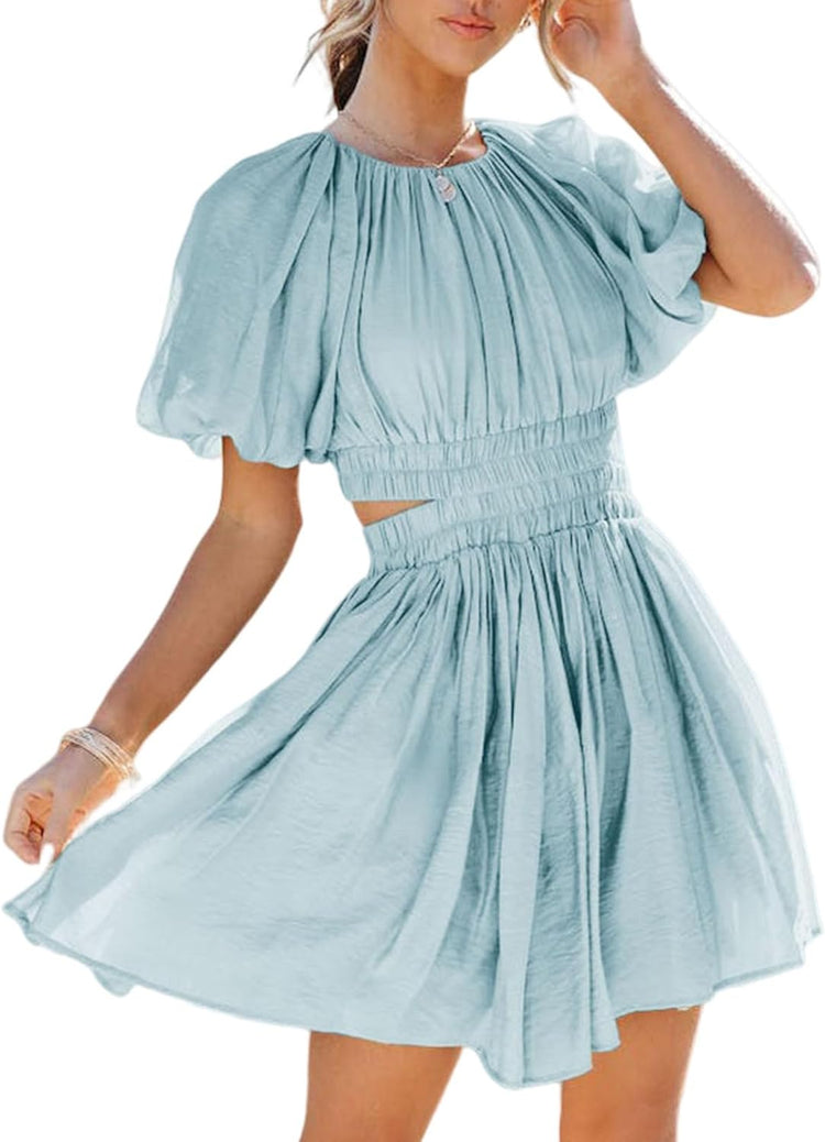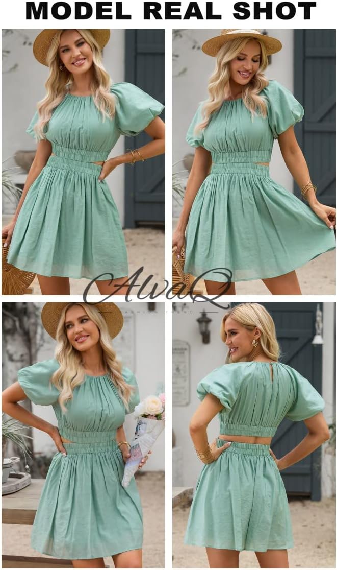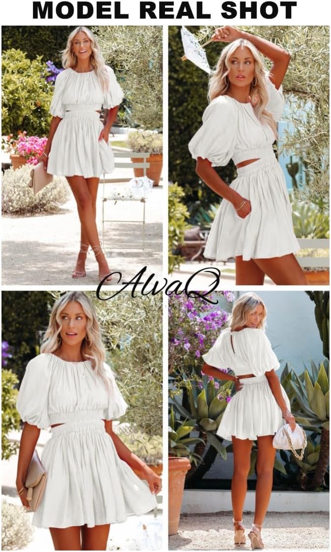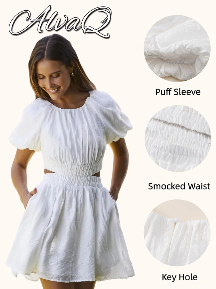 AlvaQ Women Summer Crewneck Cut Out Dresses Casual Puff Sleeve Swing A Line Short Mini Dress with Pockets