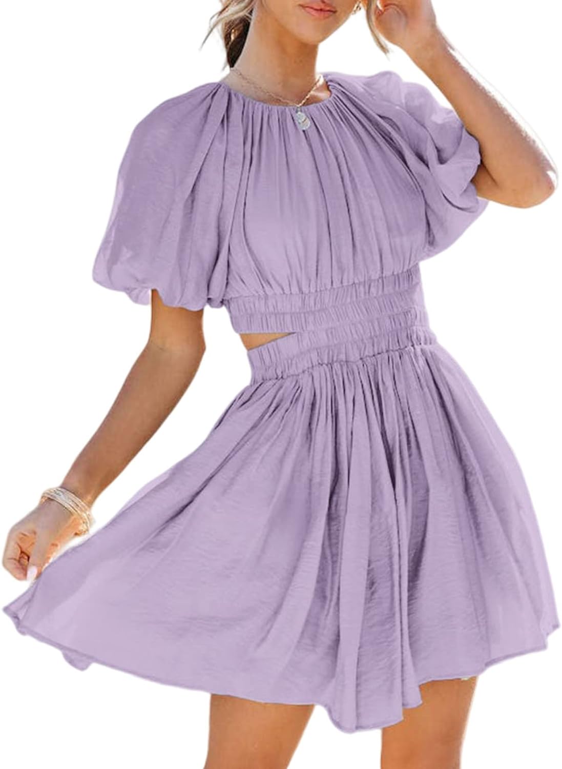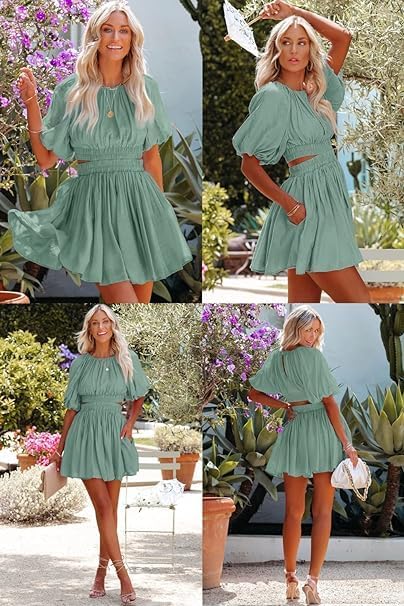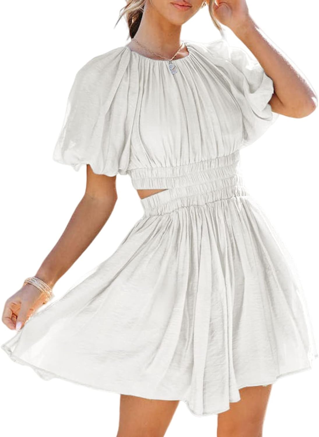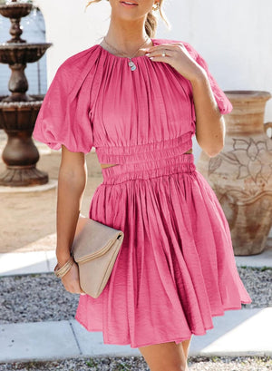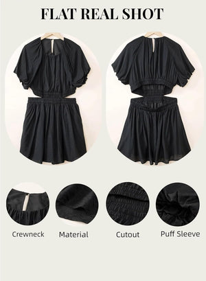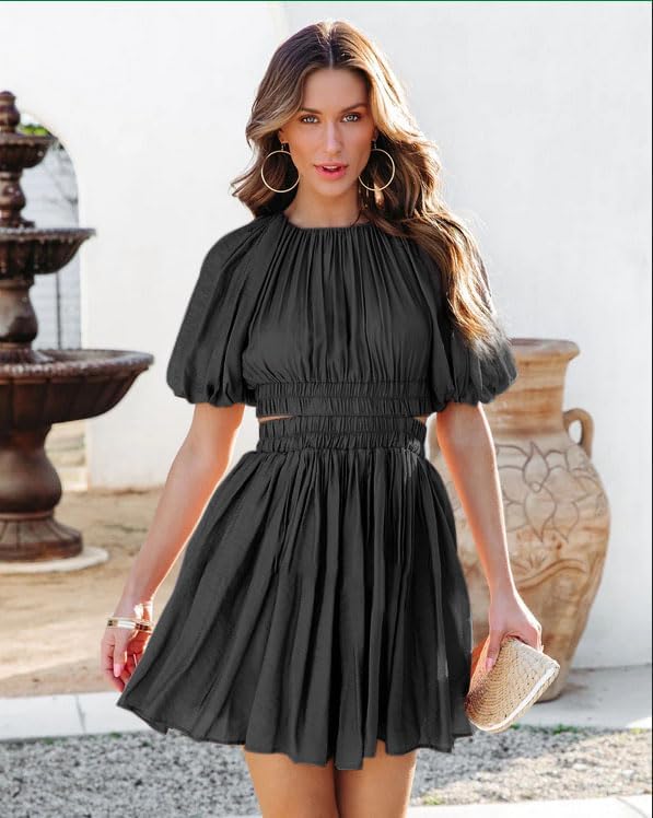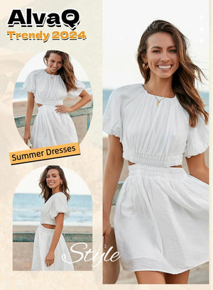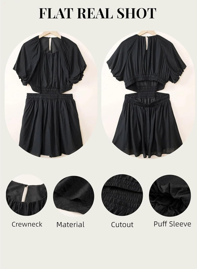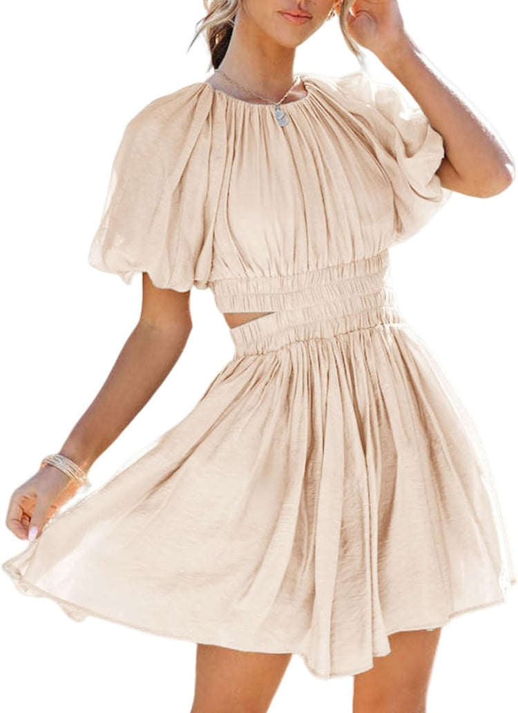 AlvaQ Women Summer Crewneck Cut Out Dresses Casual Puff Sleeve Swing A Line Short Mini Dress with Pockets