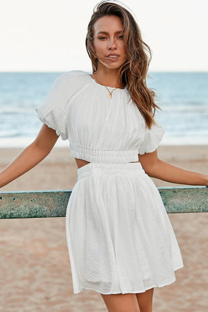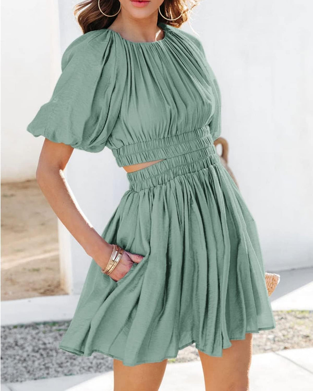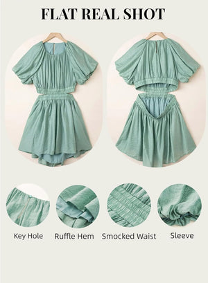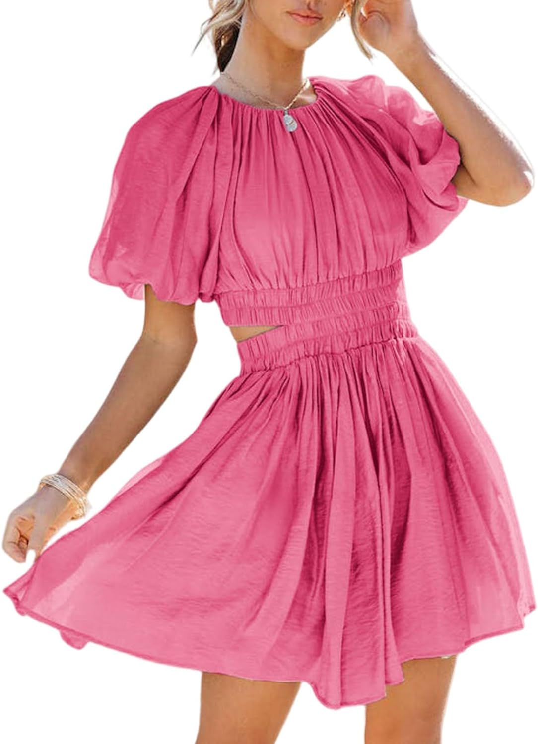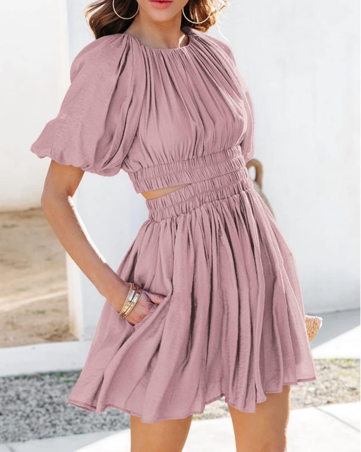AlvaQ Women Summer Crewneck Cut Out Dresses Casual Puff Sleeve Swing A Line Short Mini Dress with Pockets