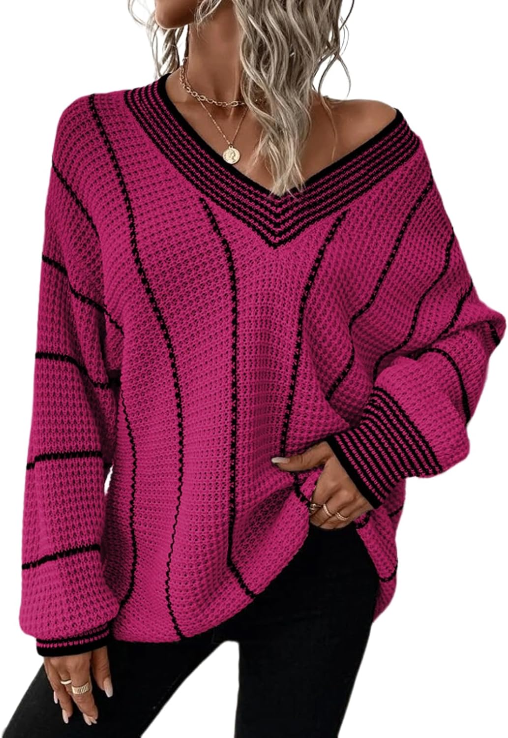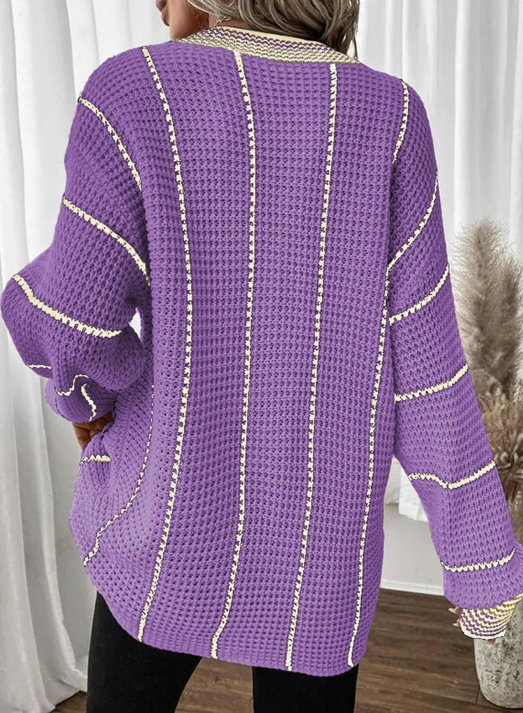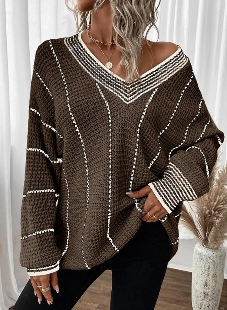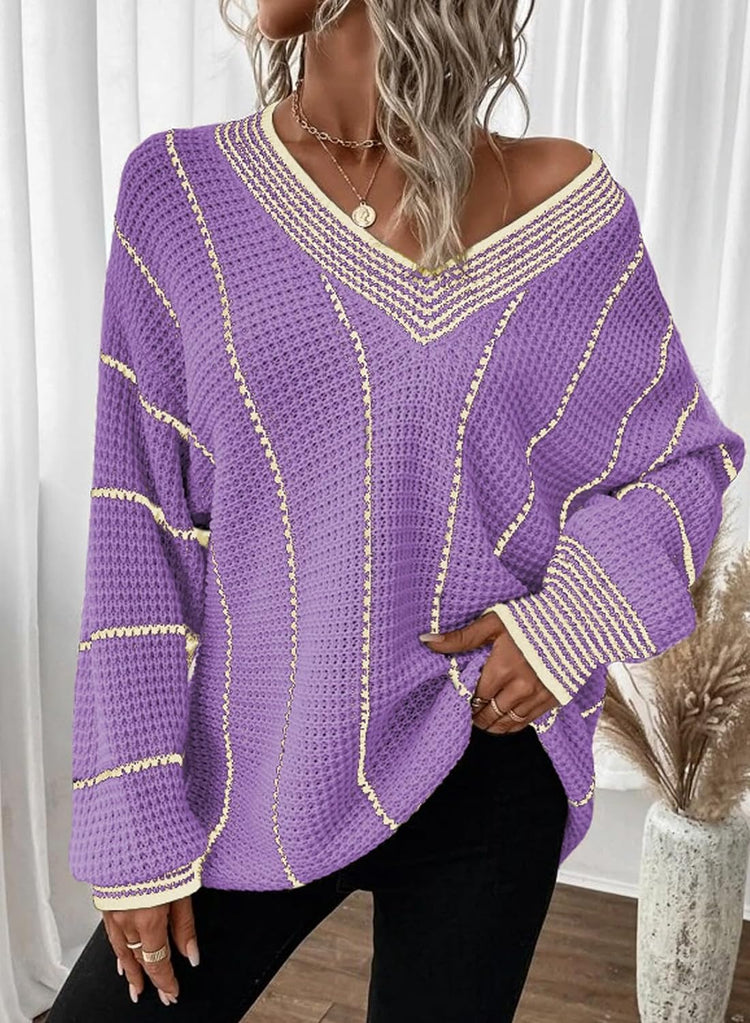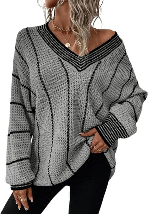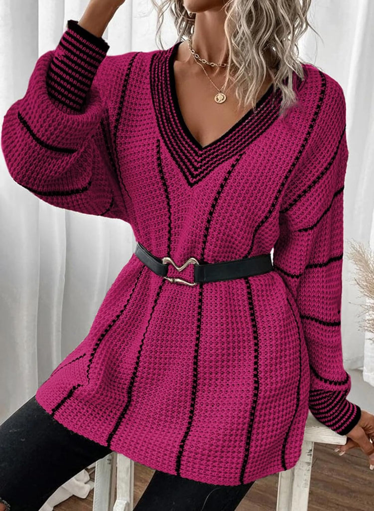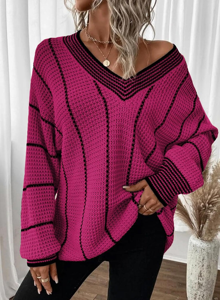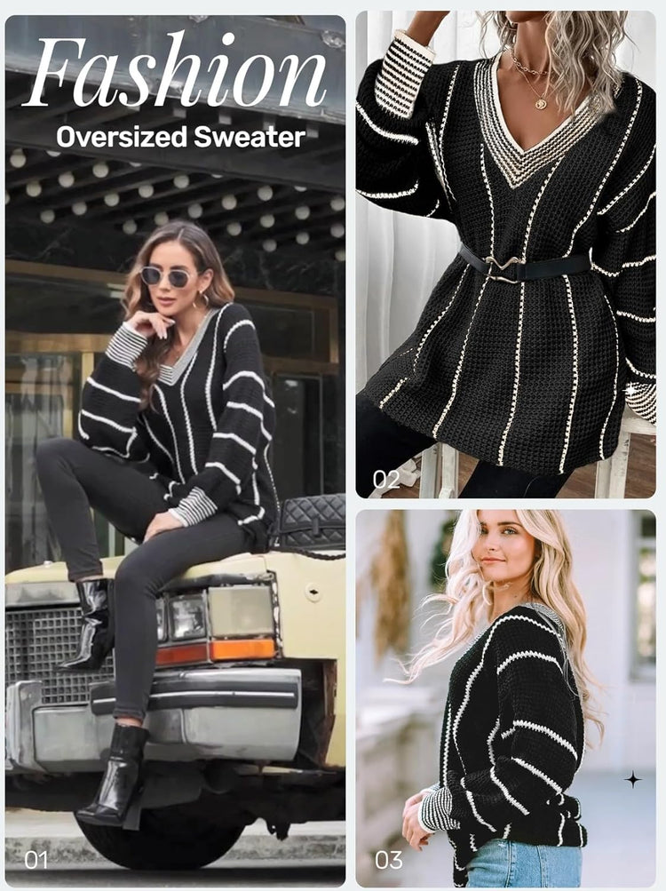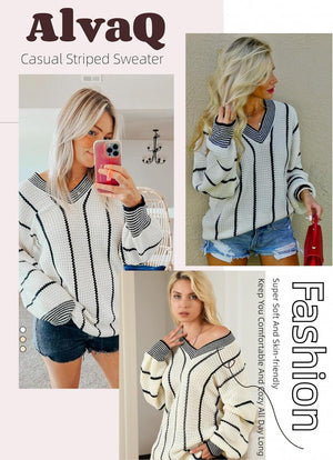 AlvaQ Women Winter Long Sleeve V Neck Color Block Striped Sweater Casual Oversized Pullover Knitted Jumper Tops