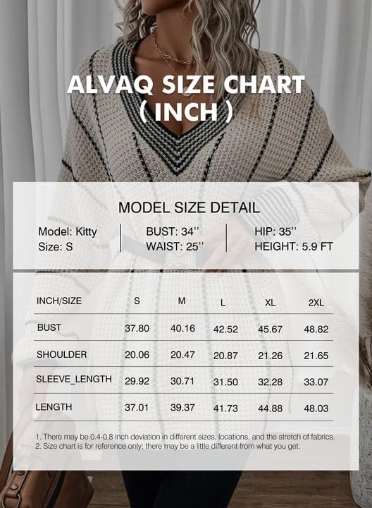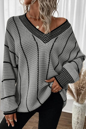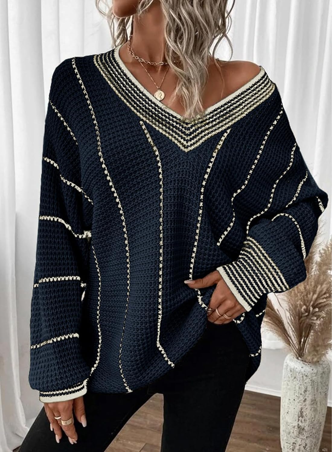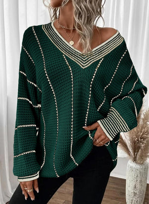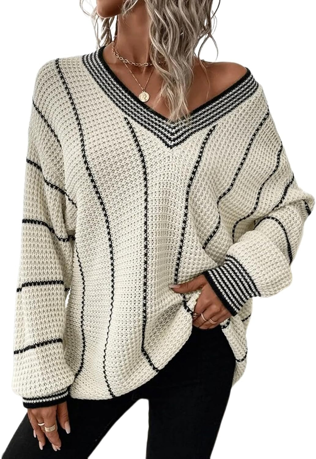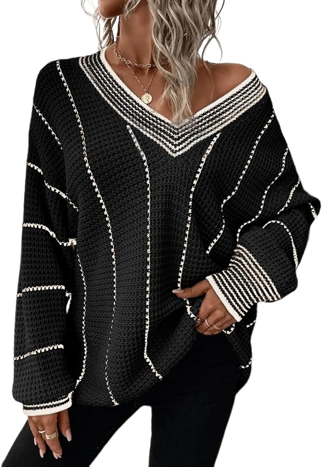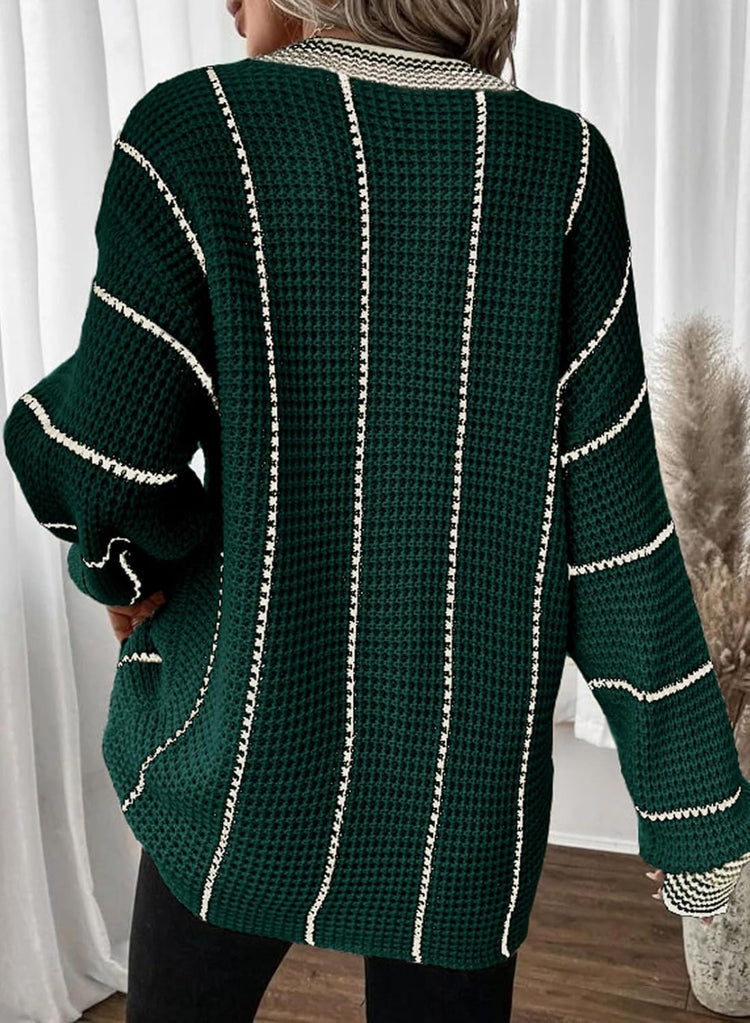 AlvaQ Women Winter Long Sleeve V Neck Color Block Striped Sweater Casual Oversized Pullover Knitted Jumper Tops