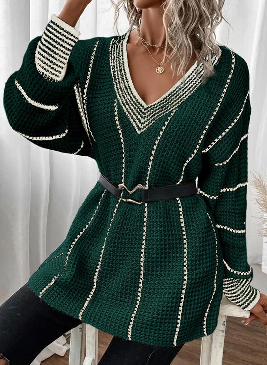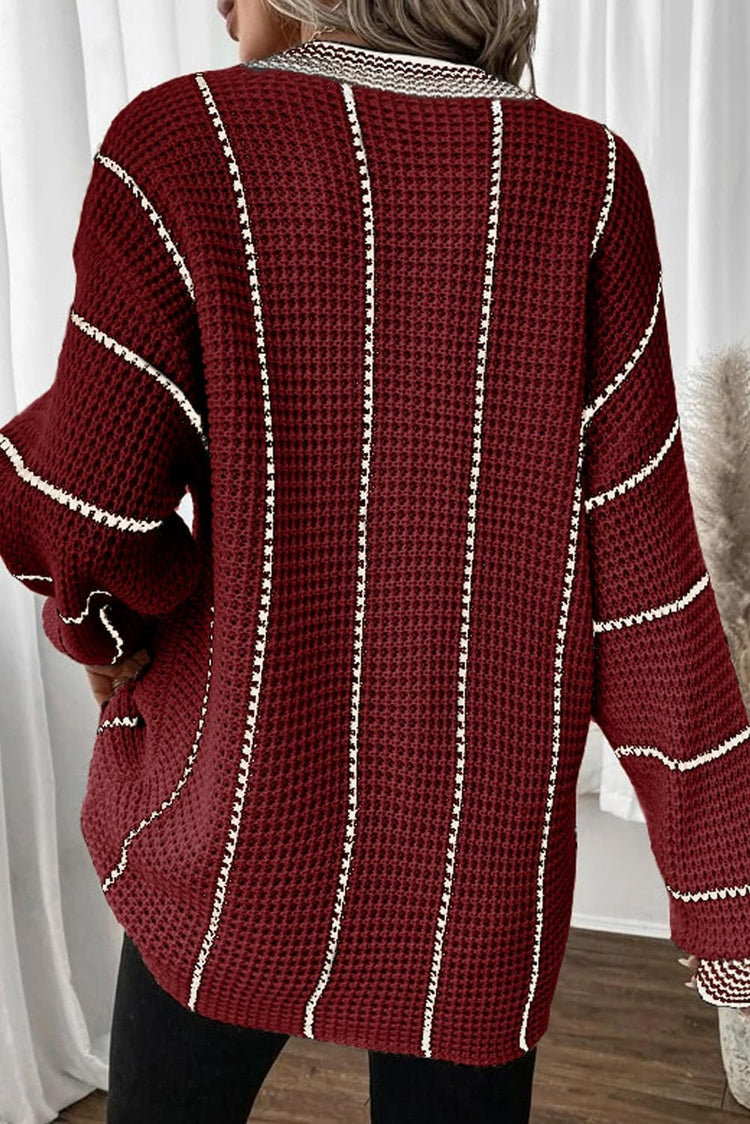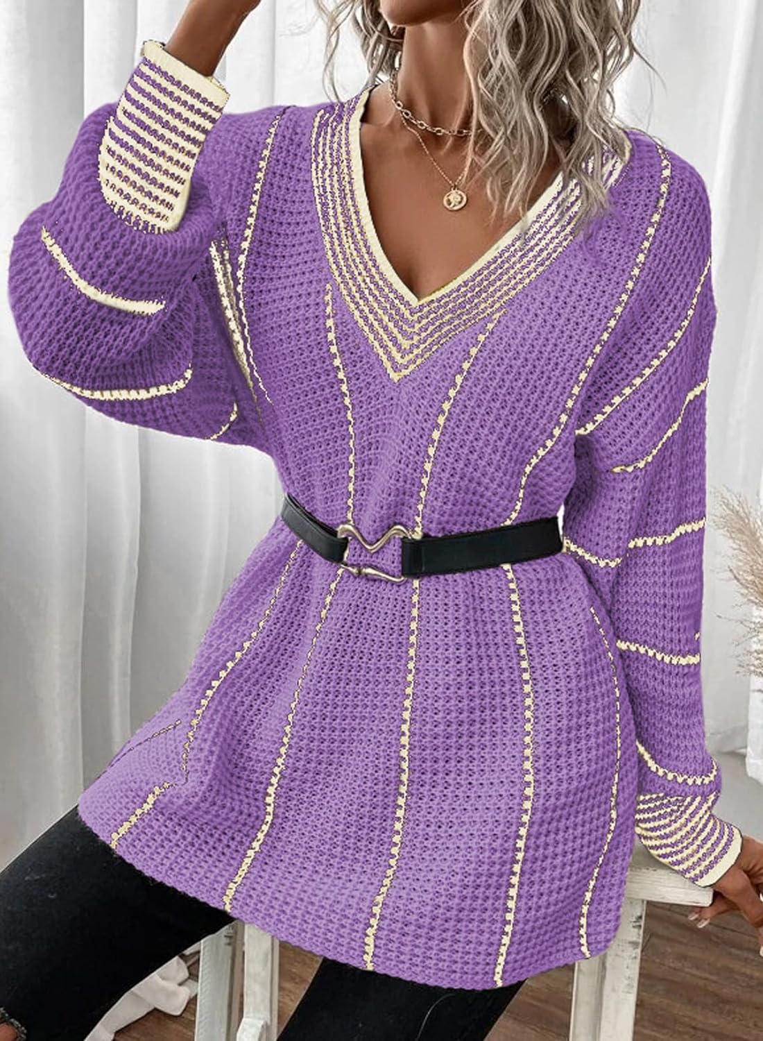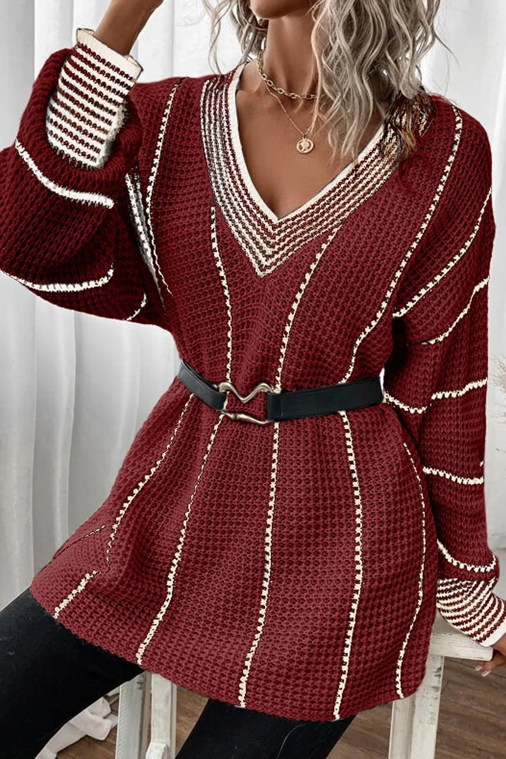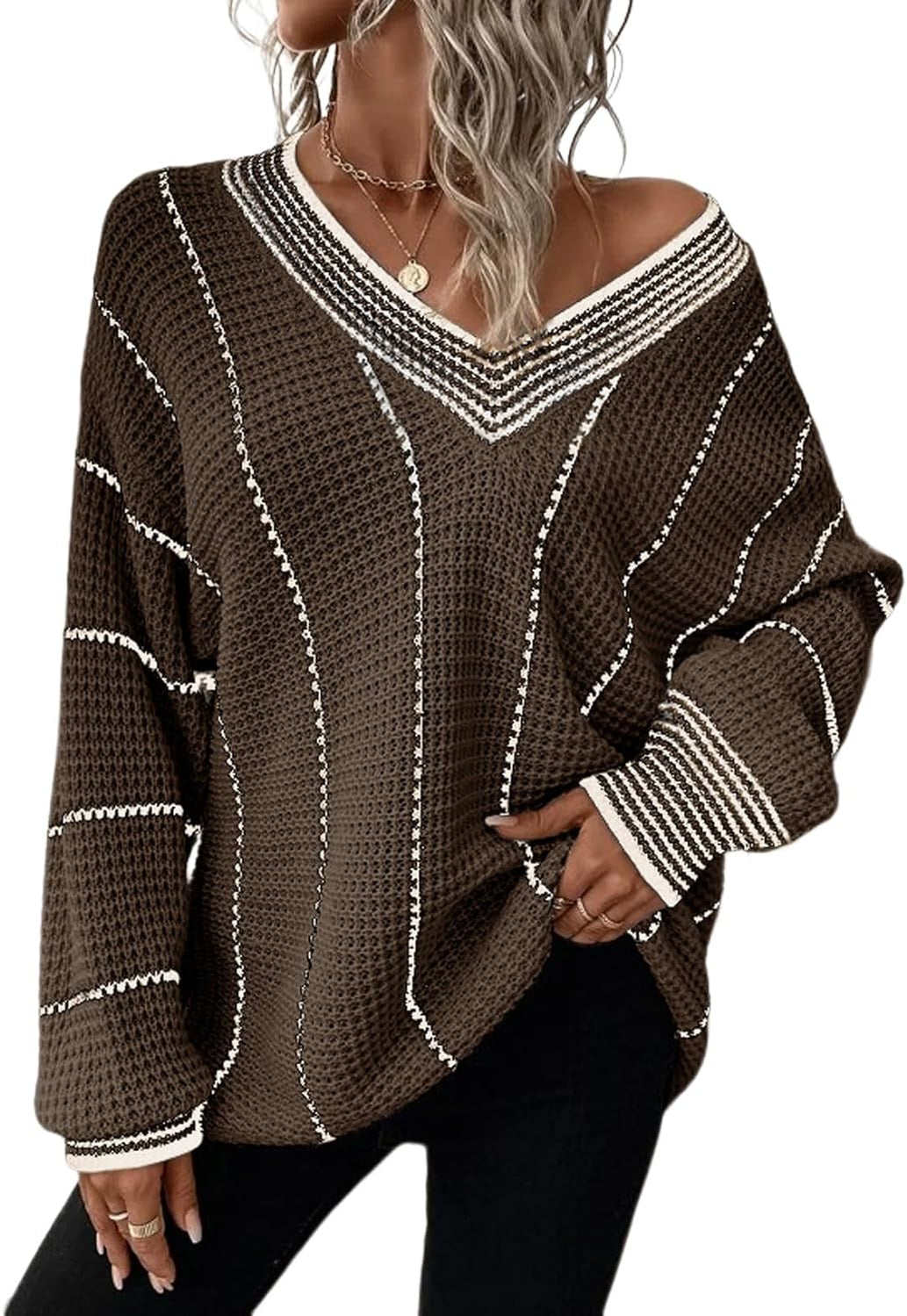 AlvaQ Women Winter Long Sleeve V Neck Color Block Striped Sweater Casual Oversized Pullover Knitted Jumper Tops