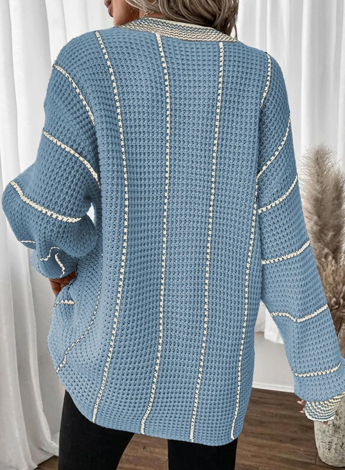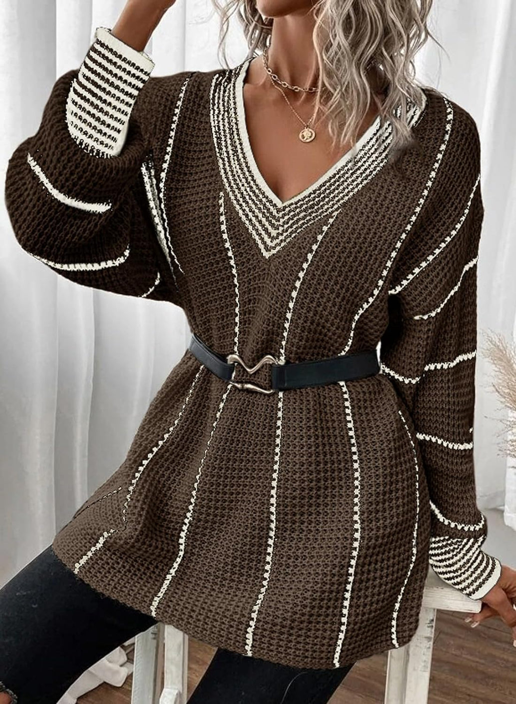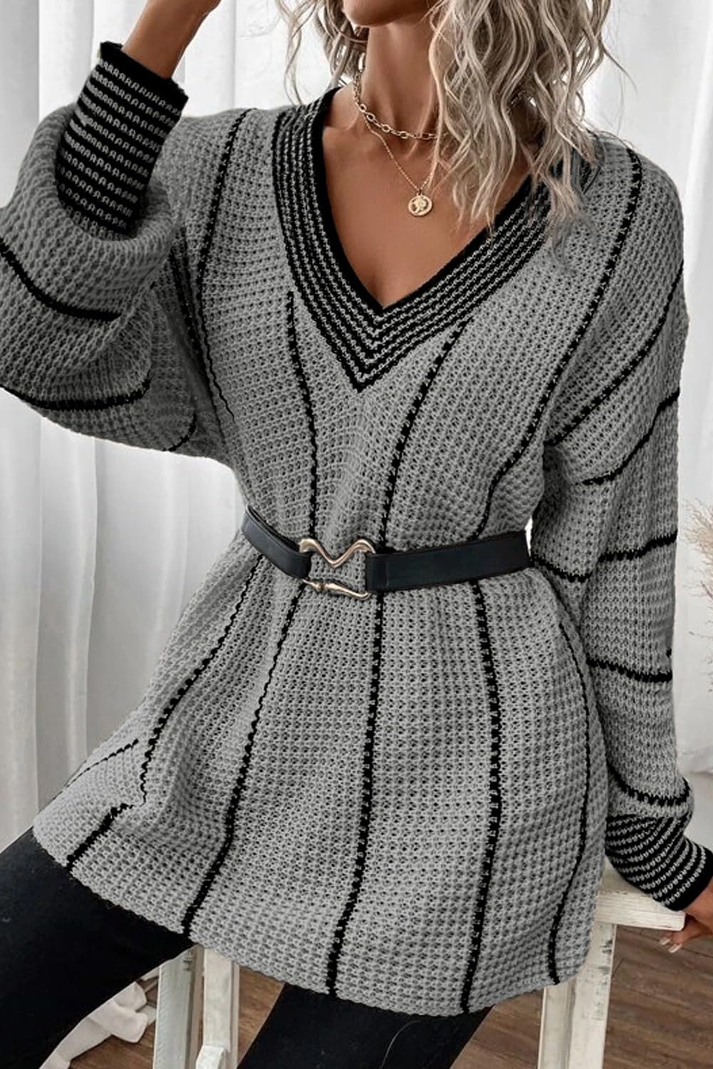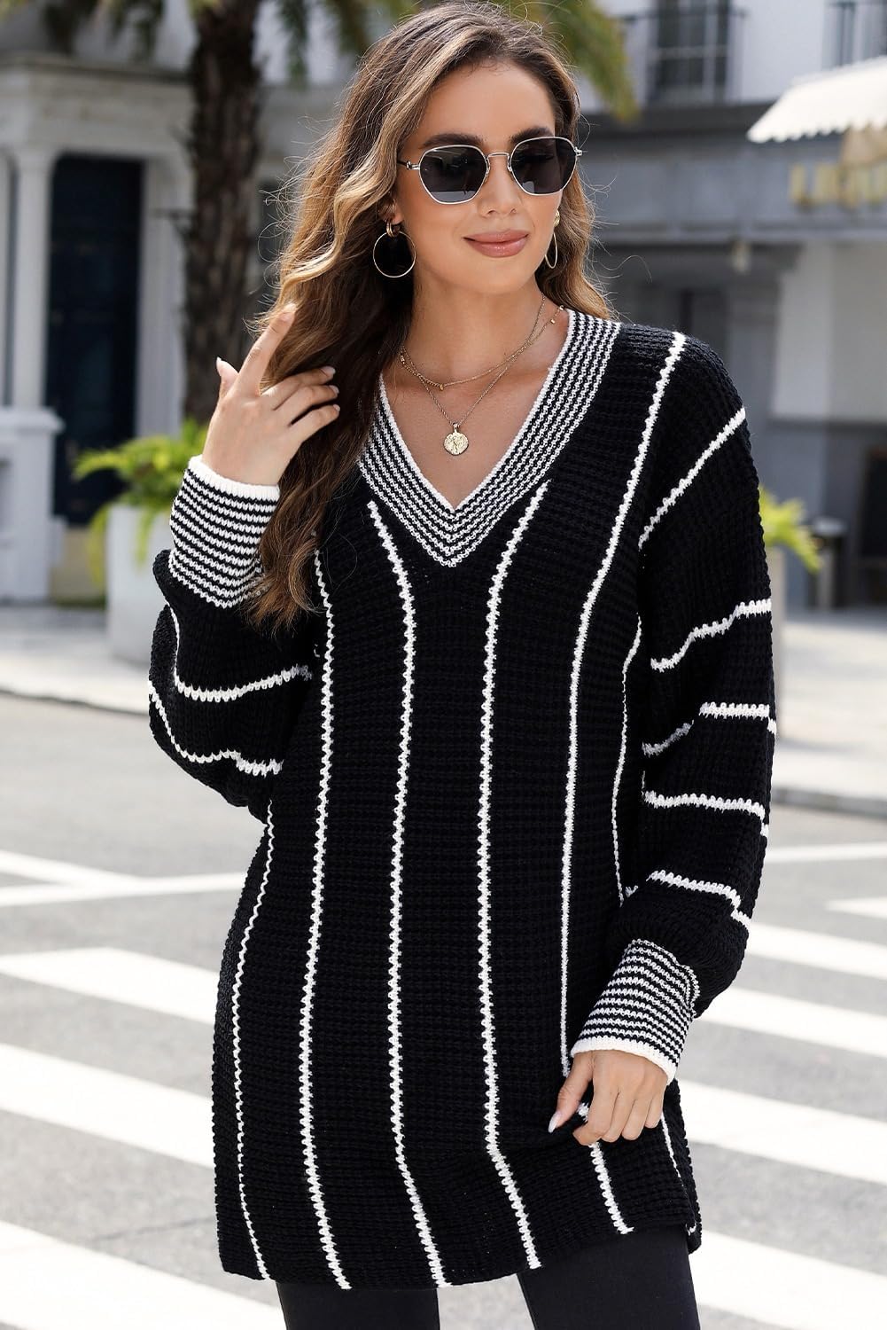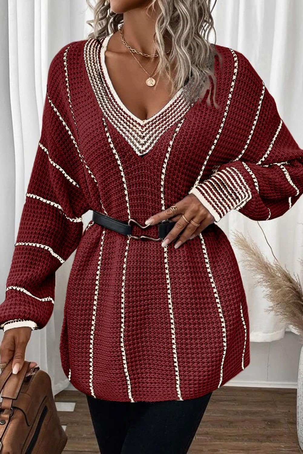 AlvaQ Women Winter Long Sleeve V Neck Color Block Striped Sweater Casual Oversized Pullover Knitted Jumper Tops