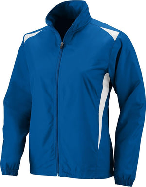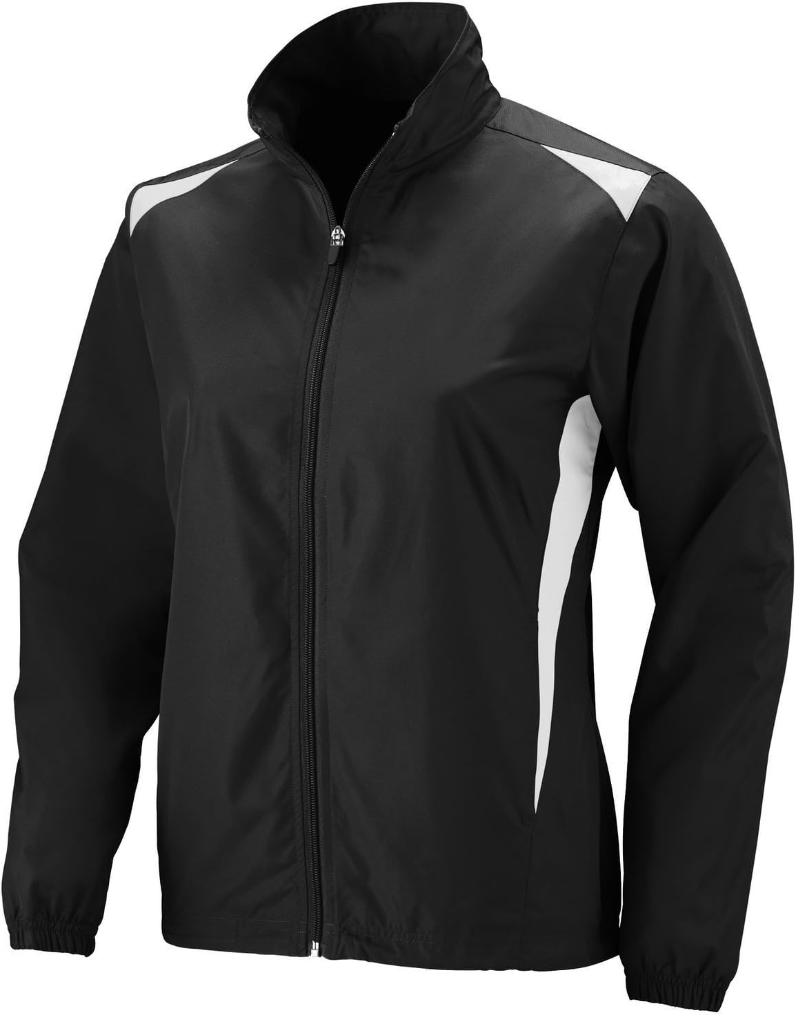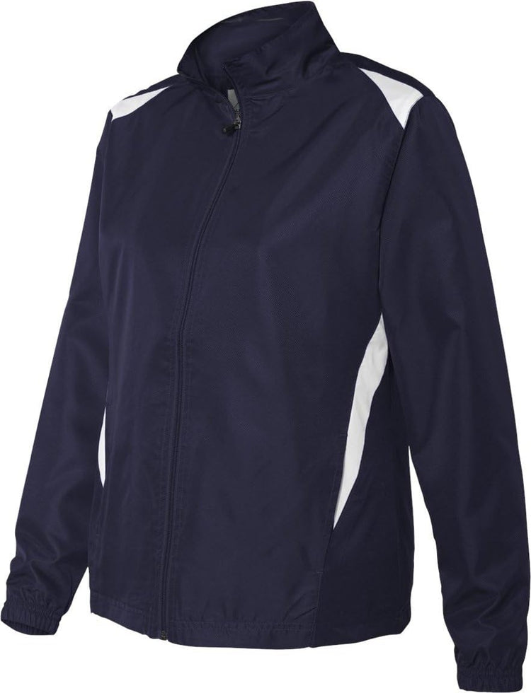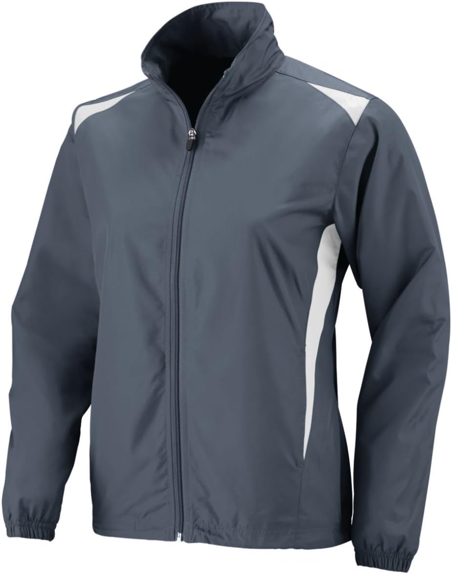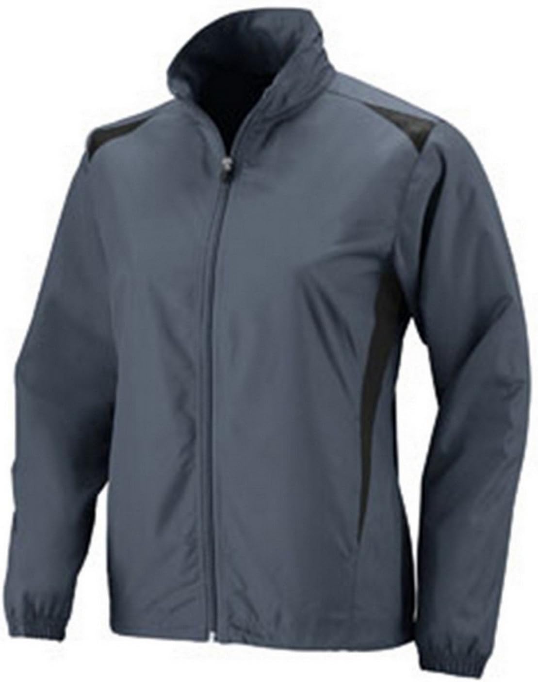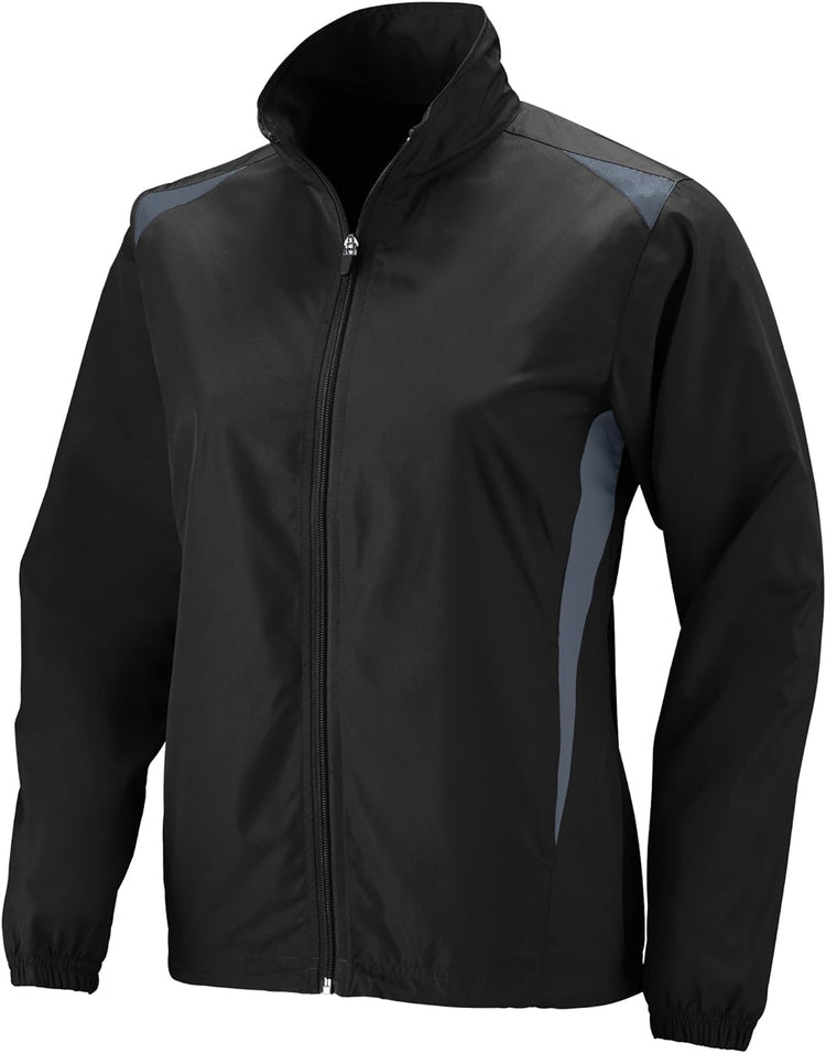 Outer shell of 100% polyester diamond tech * Lined with 100% polyestertaffeta * Ladies fit * Center front zipper * Contrast color shoulderand front inserts * Set-in sleeves * Front pockets * Elastic cuffs * Open bottom * Water-resistant * Machine-washable * Individually polybagged