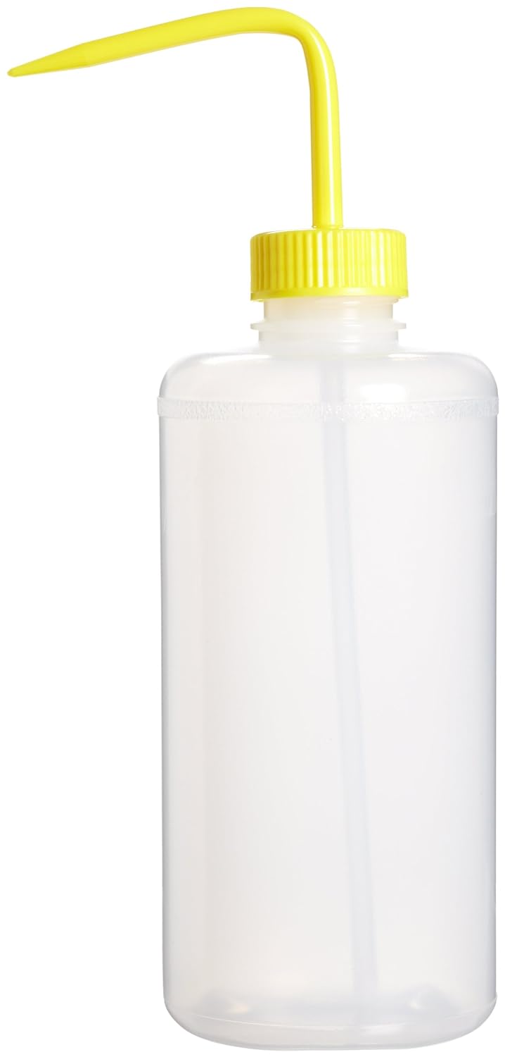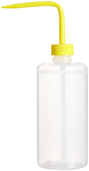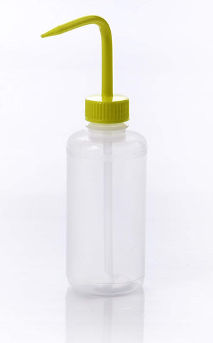 Yellow Narrow-Mouth Wash Bottle, (bag of 6) Low-Density Polyethylene/Polypropylene 500ml (8oz) Low-density polyethylene wash bottles offer different colors of polypropylene closures for quick, at-a-glance identification of contents. Choose from Natural, Red, Yellow, Blue and Green. Bulk quantities by special order.