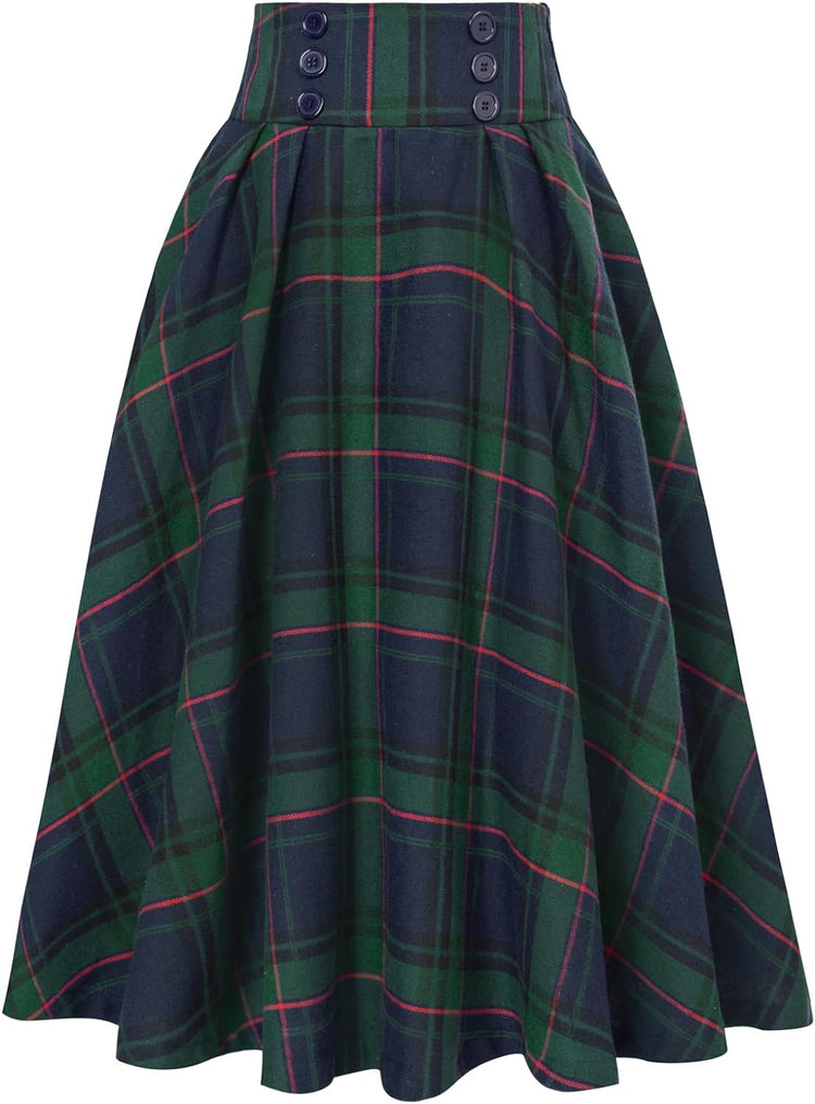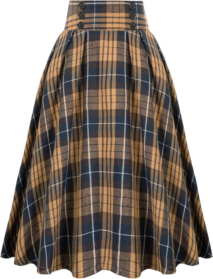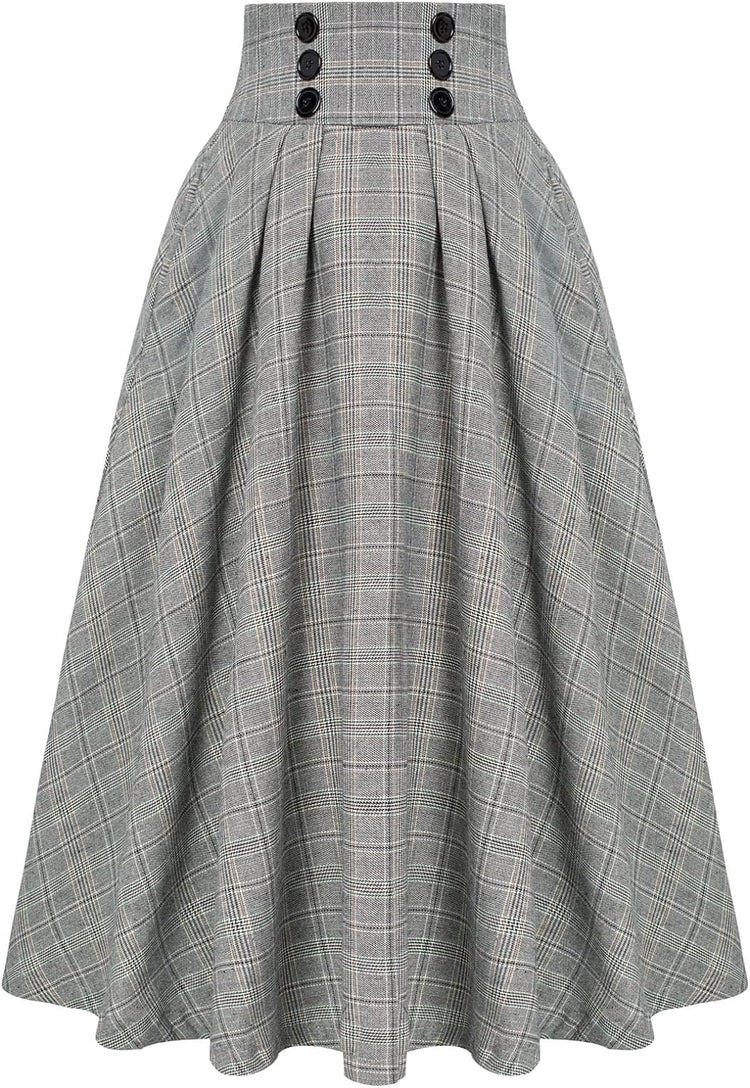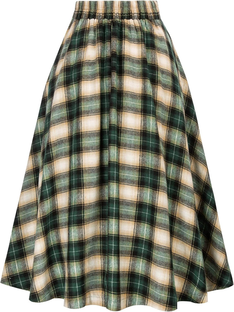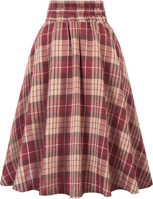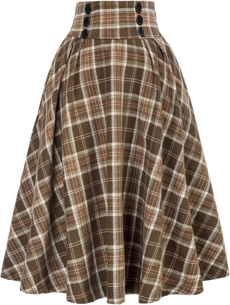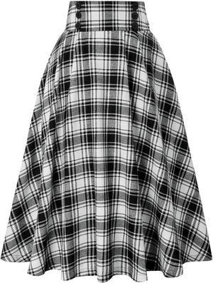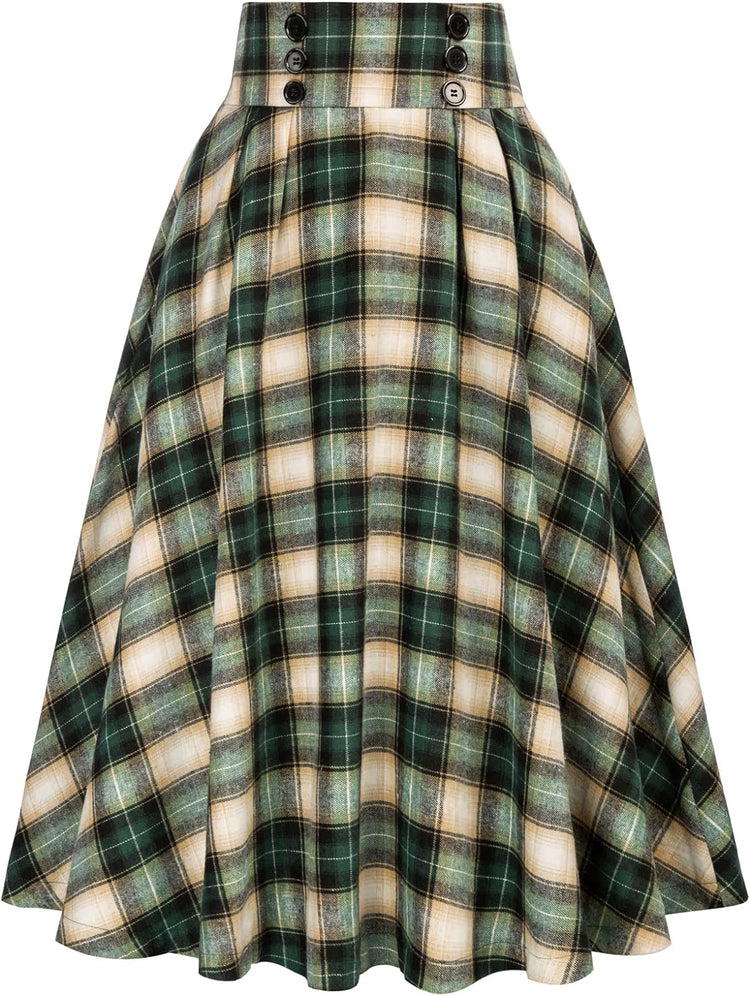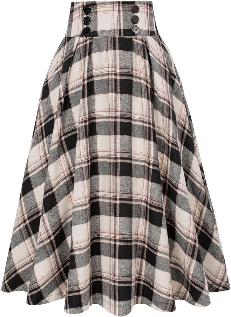 Belle Poque Women Plaid Skirt Vintage High Waist Pleated Skirt with Pockets BPA020