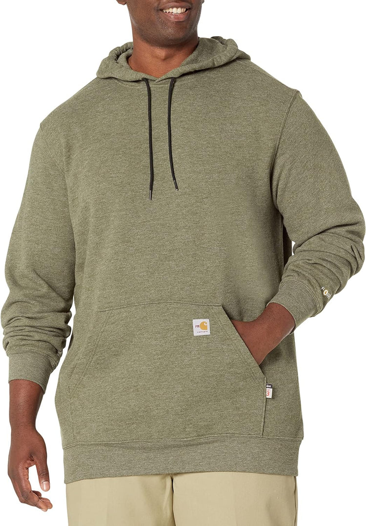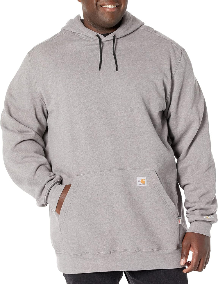This men's sweatshirt is made to stand up under tough conditions. Flame-resistant fleece protects against dangerous arcs and flames. Sweat-wicking and quick-drying for comfort on long days at the job site. Original fit is Carhartt's roomiest. 10.5-ounce, 40% cotton / 35% modacrylic / 15% viscose / 8% aramid / 2% antistat FR fleece. Meets the performance requirements of NFPA 70E and ASTM F1506. UL® classified to NFPA 2112. Built with Force technology to wick sweat and dry fast. FastDry® technology keeps you cool for all day comfort. Original fit . Attached three-piece hood with flame-resistant drawcord-adjustable closure. Rib-knit cuffs and waist help keep out the cold. Locker loop for easy hanging. Carhartt FR and NFPA 2112 / CAT 3 labels sewn on pocket. Front handwarmer pocket with inner media pocket. Imported