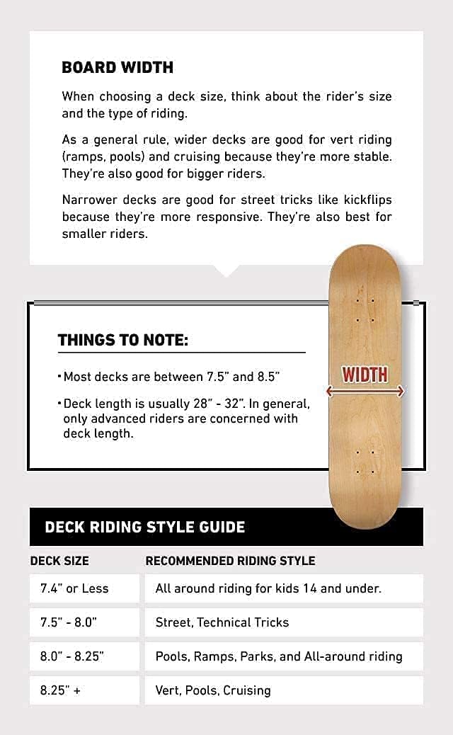 → With its classic shape, the board is great for cruising and tricks. The maple wood is high quality and gives you the right mix of flex and stiffness. → From first timers to seasoned vets, this deck is for you. → Deck only - does not include grip. → Wood Type: Canadian 7 Ply Maple → The top of the decks have varying stain colors. When you grip the deck, the stain is covered so it doesn't affect the style of the board.