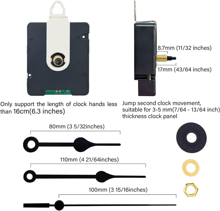 - The Length Shaft of Movement : Total Shaft length : 0.67 inch(17mm) , Screw thread length : 0.34 inch (8.7mm),Fit about 0.12-0.2 inches (3-5mm) thickness clock panel. With golden hex nut, golden metal washer, black rubber washer.