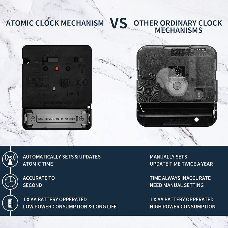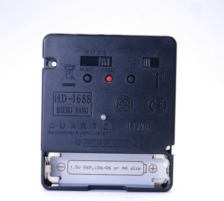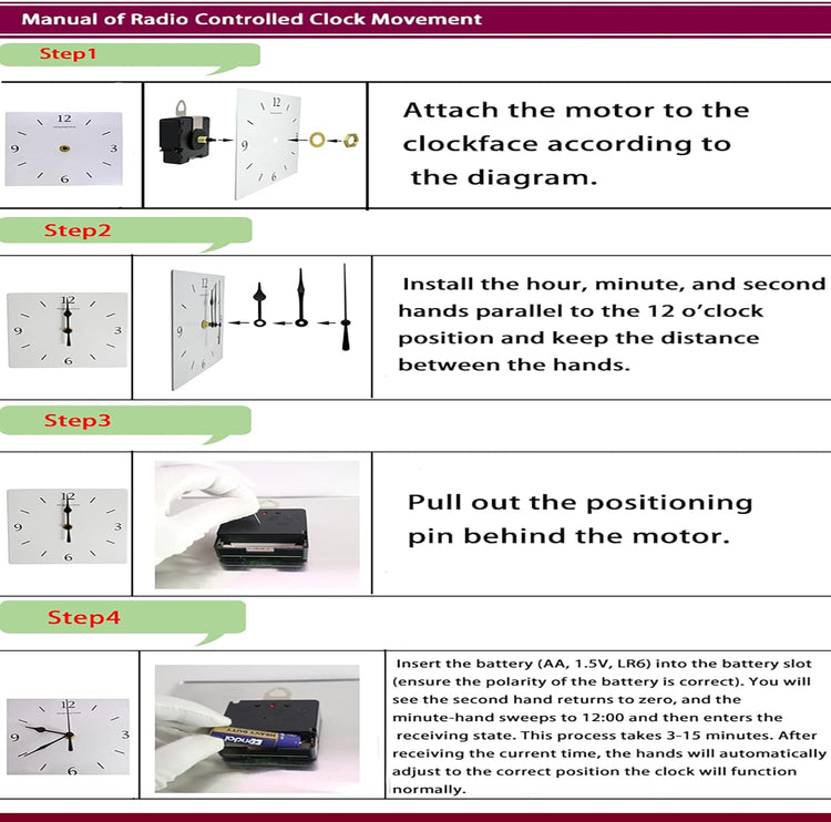 - Radio Controlled Clock Movement Size:2.6*2.2*0.74 inch (66*56*19mm), Installation tips: 1. First fix the movement to the main body of the middle case. 2. Put the hour, minute, and seconds hands to 12 o'clock parallelly. 3. Pull out the positioning pin on the back of the movement. (Recommend saving the pin if you need to restart clock movement) 4. Install the battery, it automatically searches for local signals.