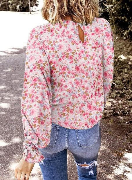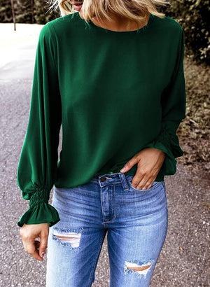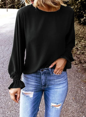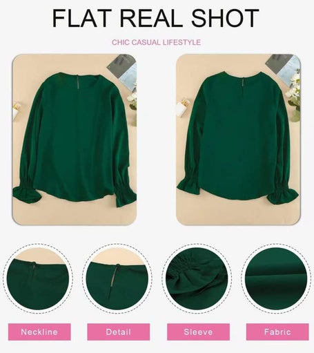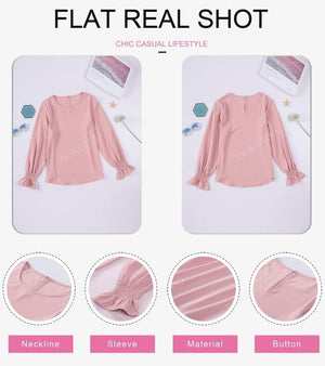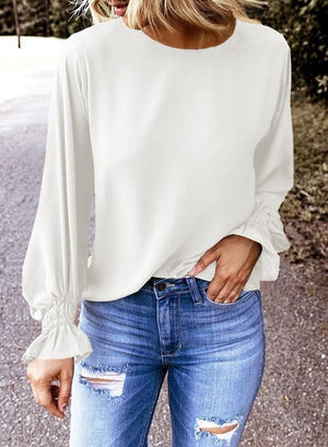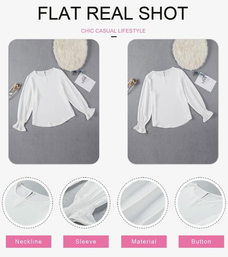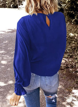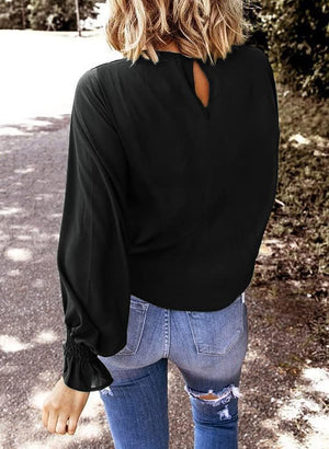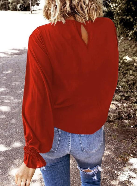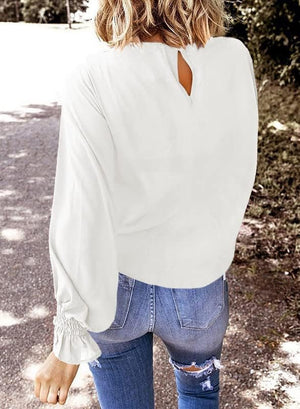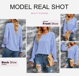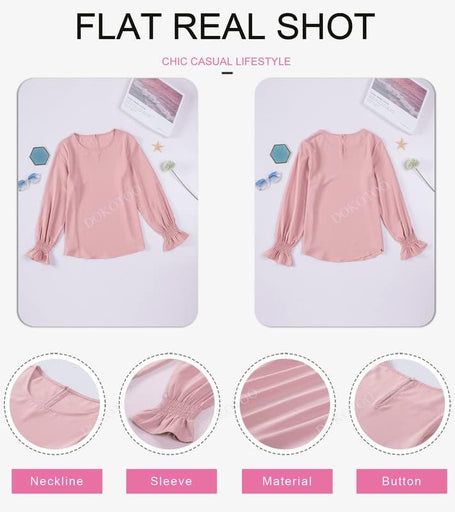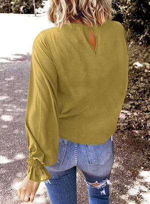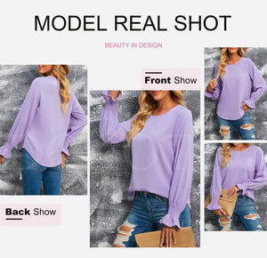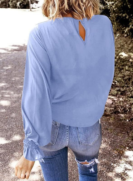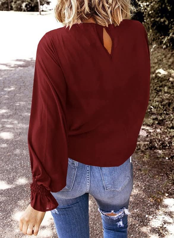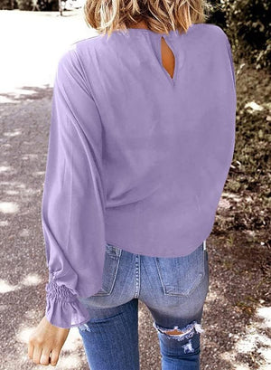 Solid Color Spring Lightweight Crewneck Keyhole Casual Long Bell Sleeve Tops for Women