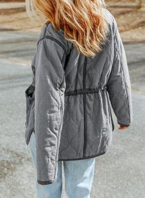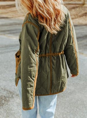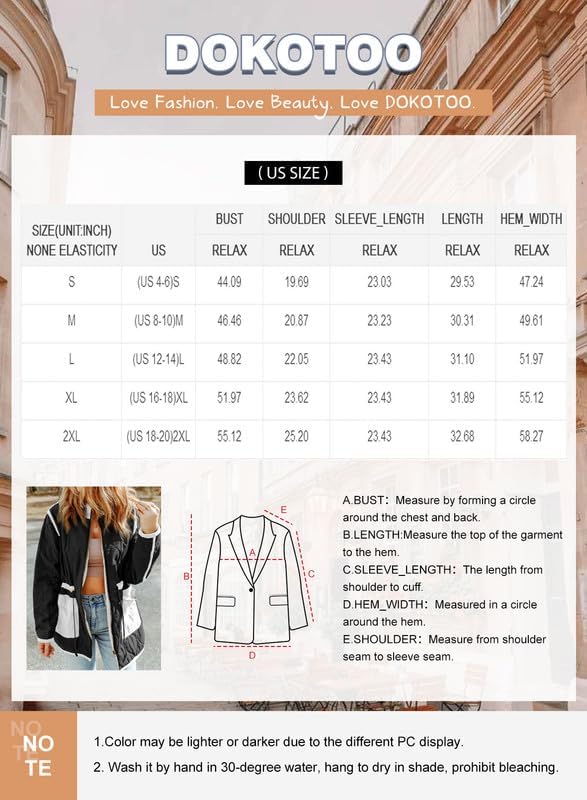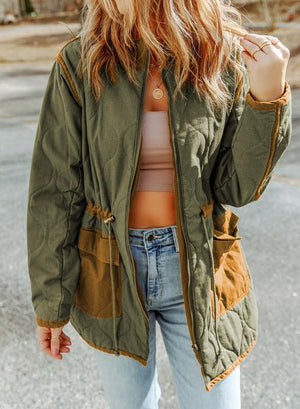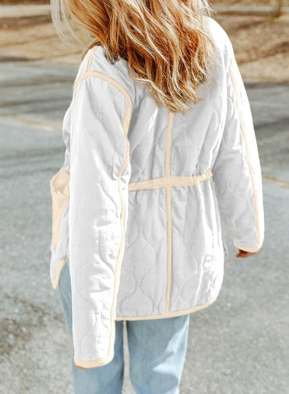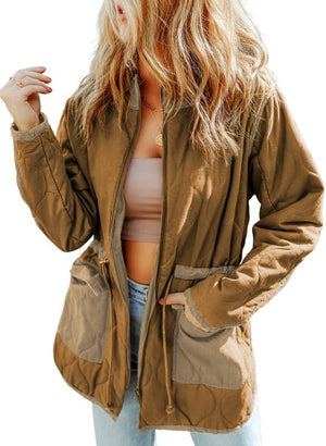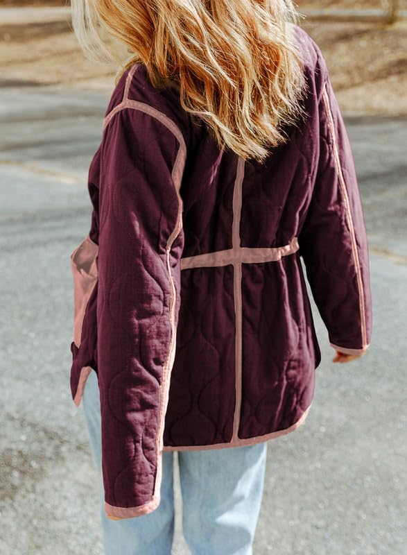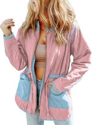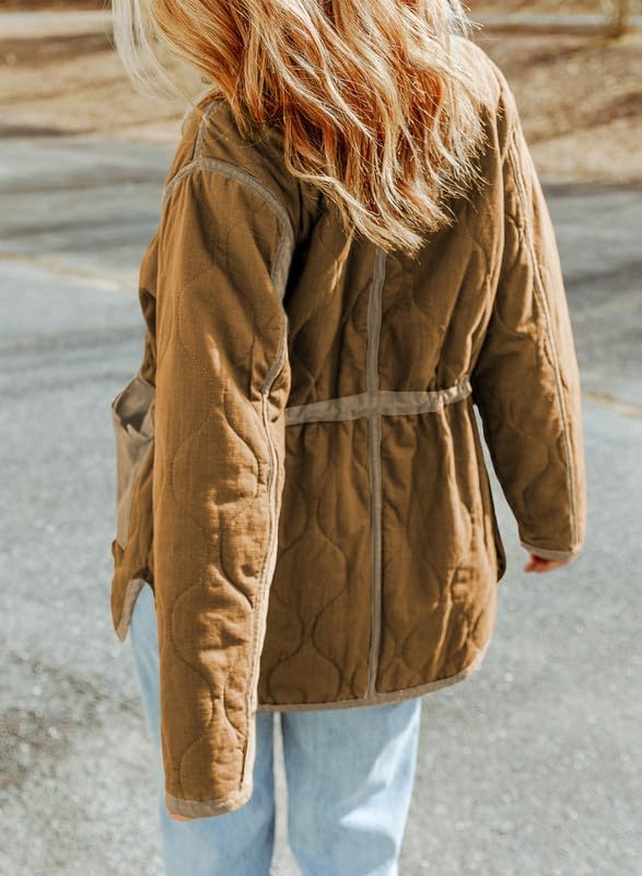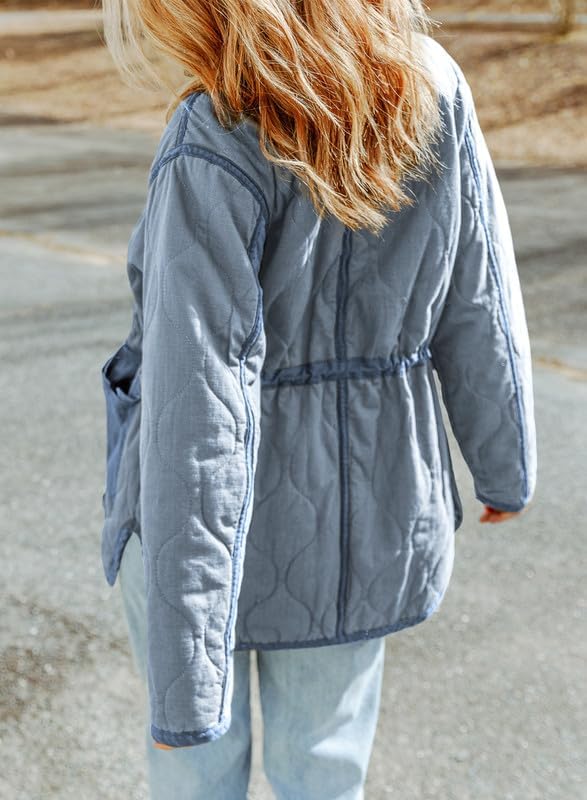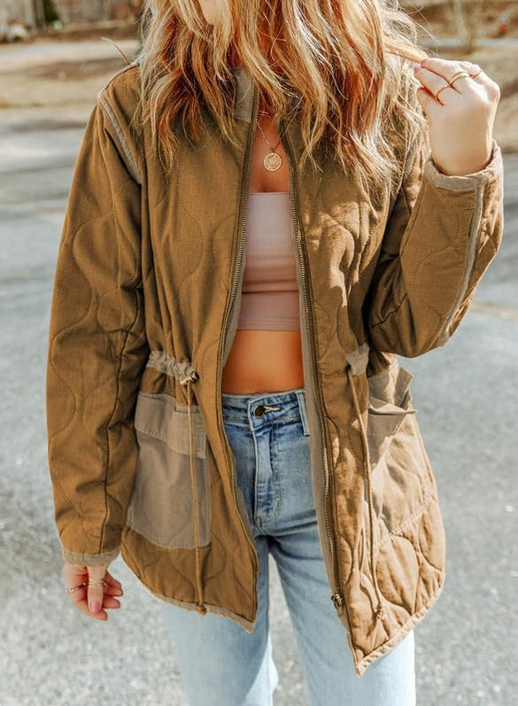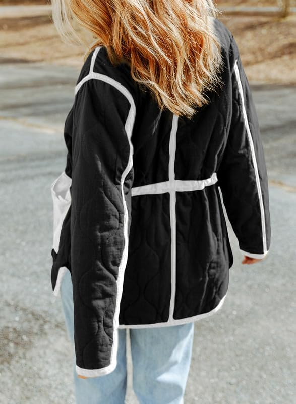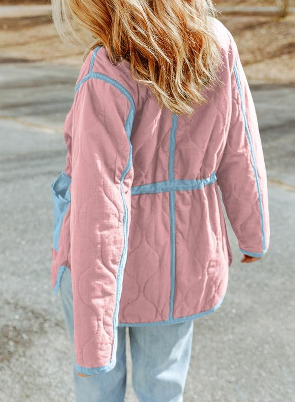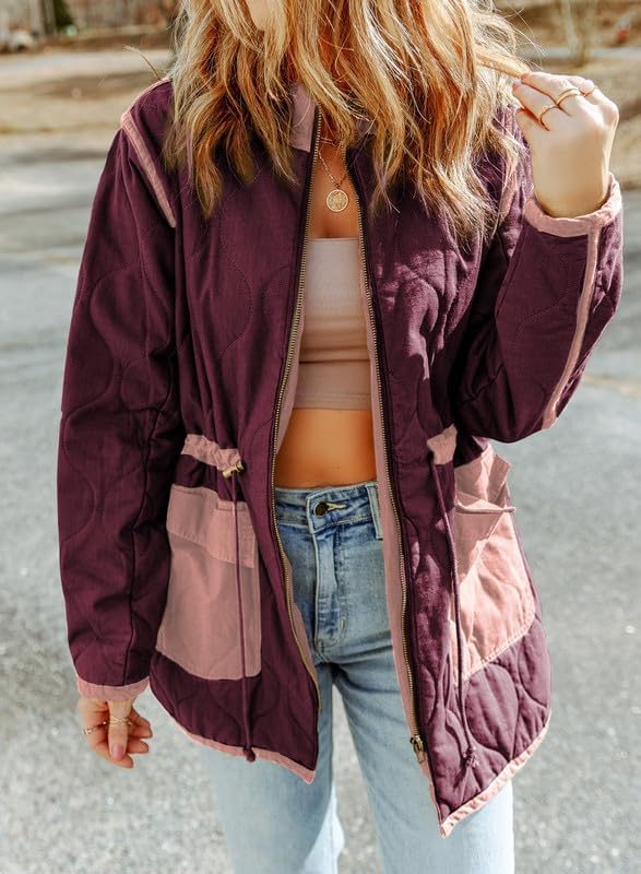 Dokotoo Womens Winter Quilted Jacket Stand Collar Zip Up Long Sleeve Drawstring Waist Contrast Coat with Pockets