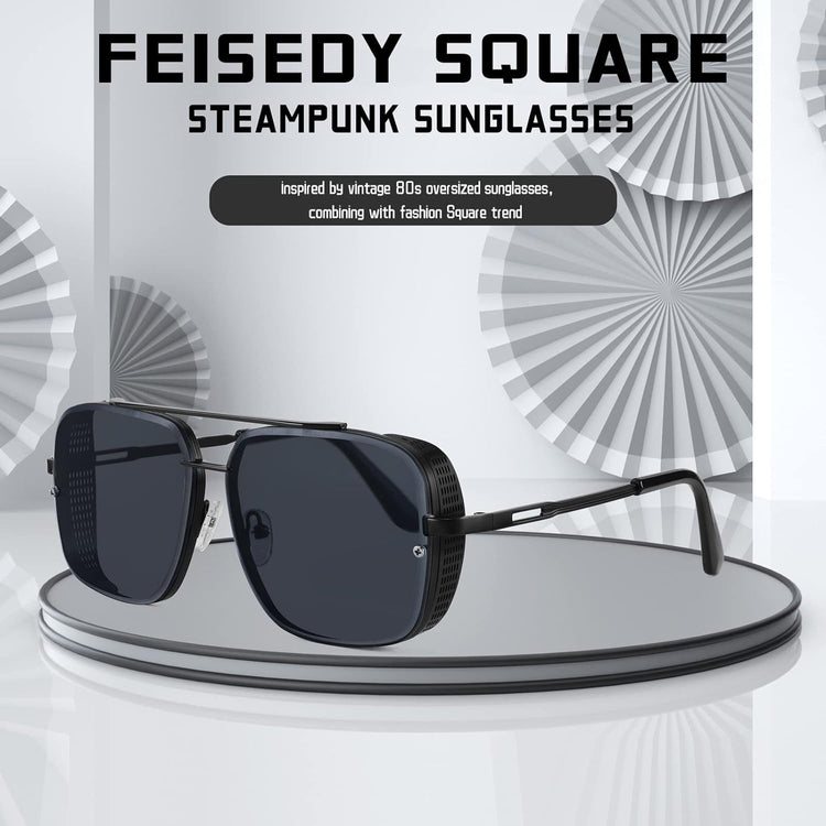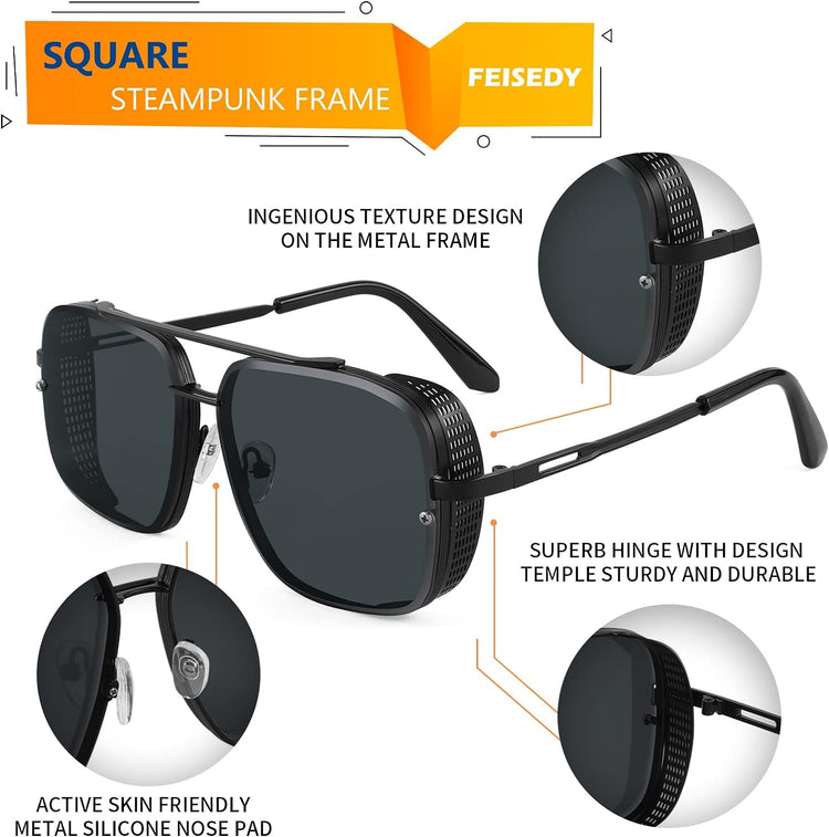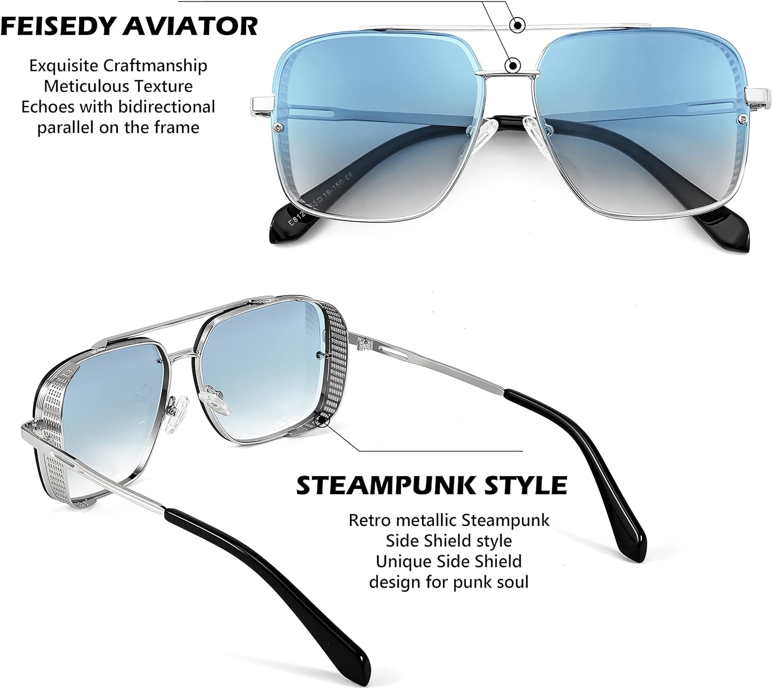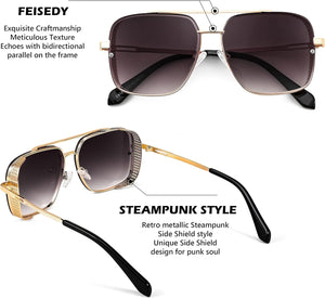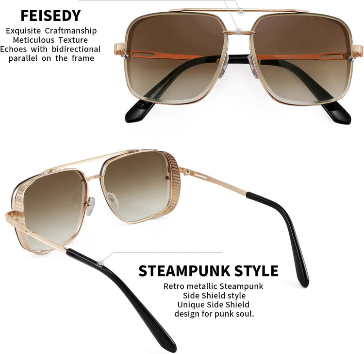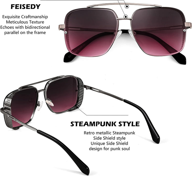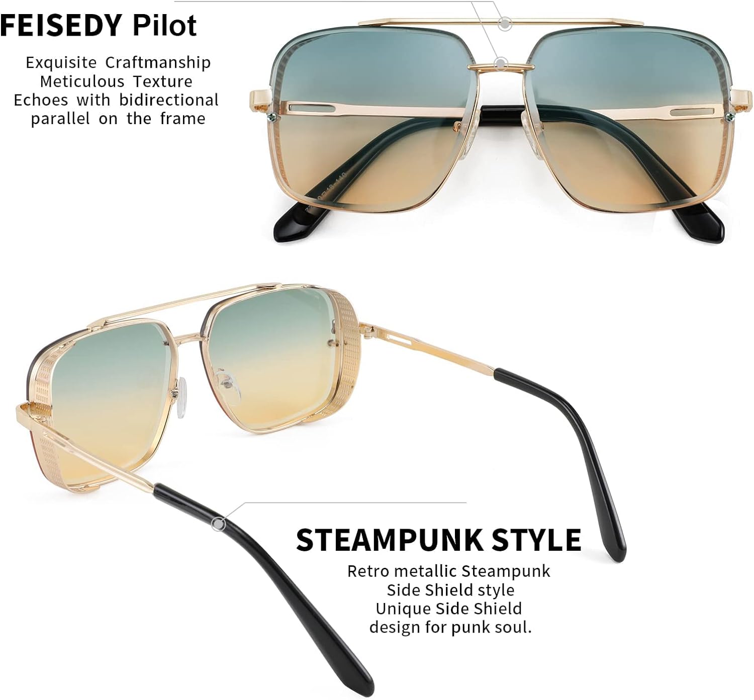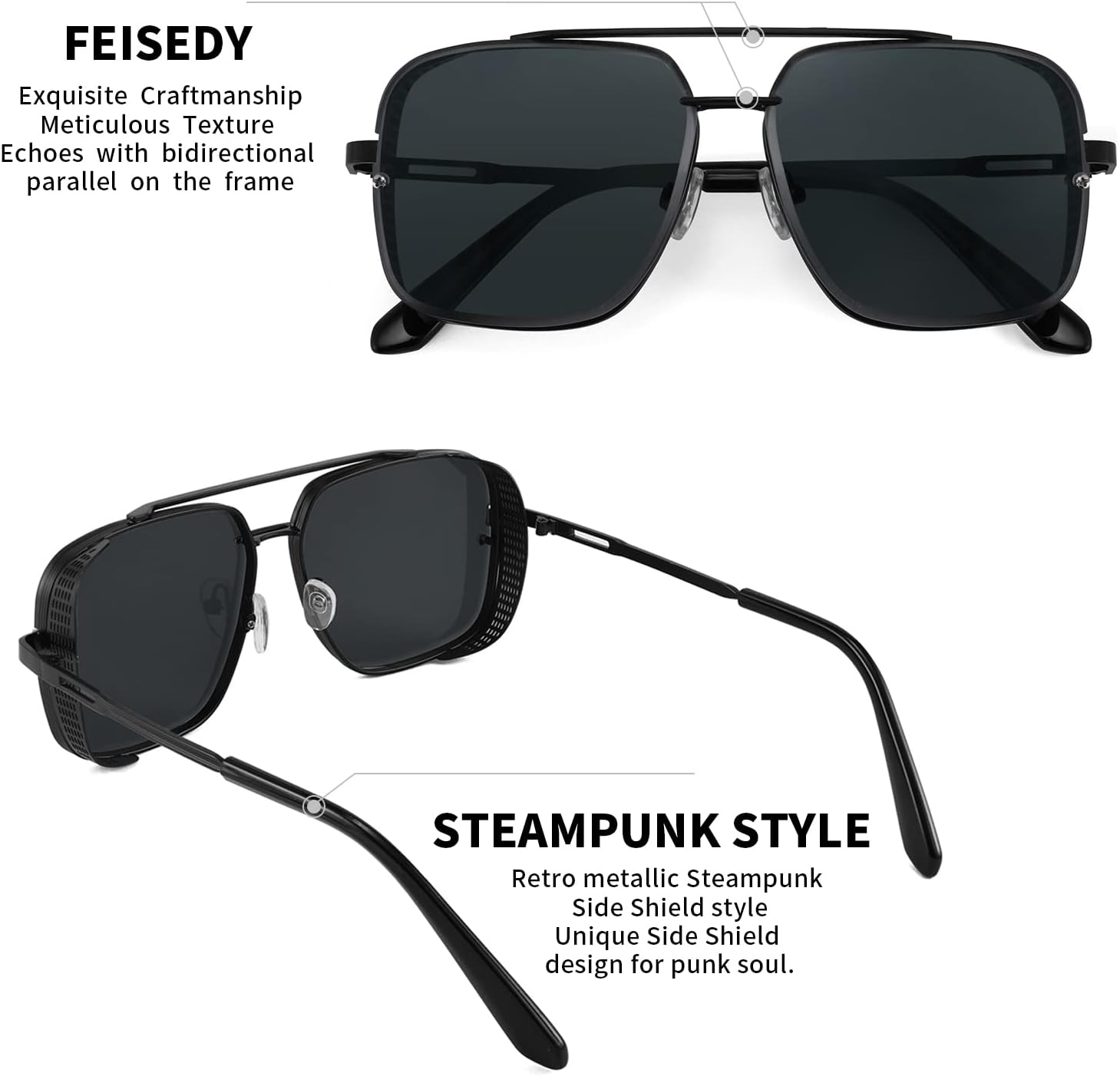 FEISEDY Square Pilot Steampunk Sunglasses Men Vintage Metal Side Shield Oversized Sun Glasses B2894