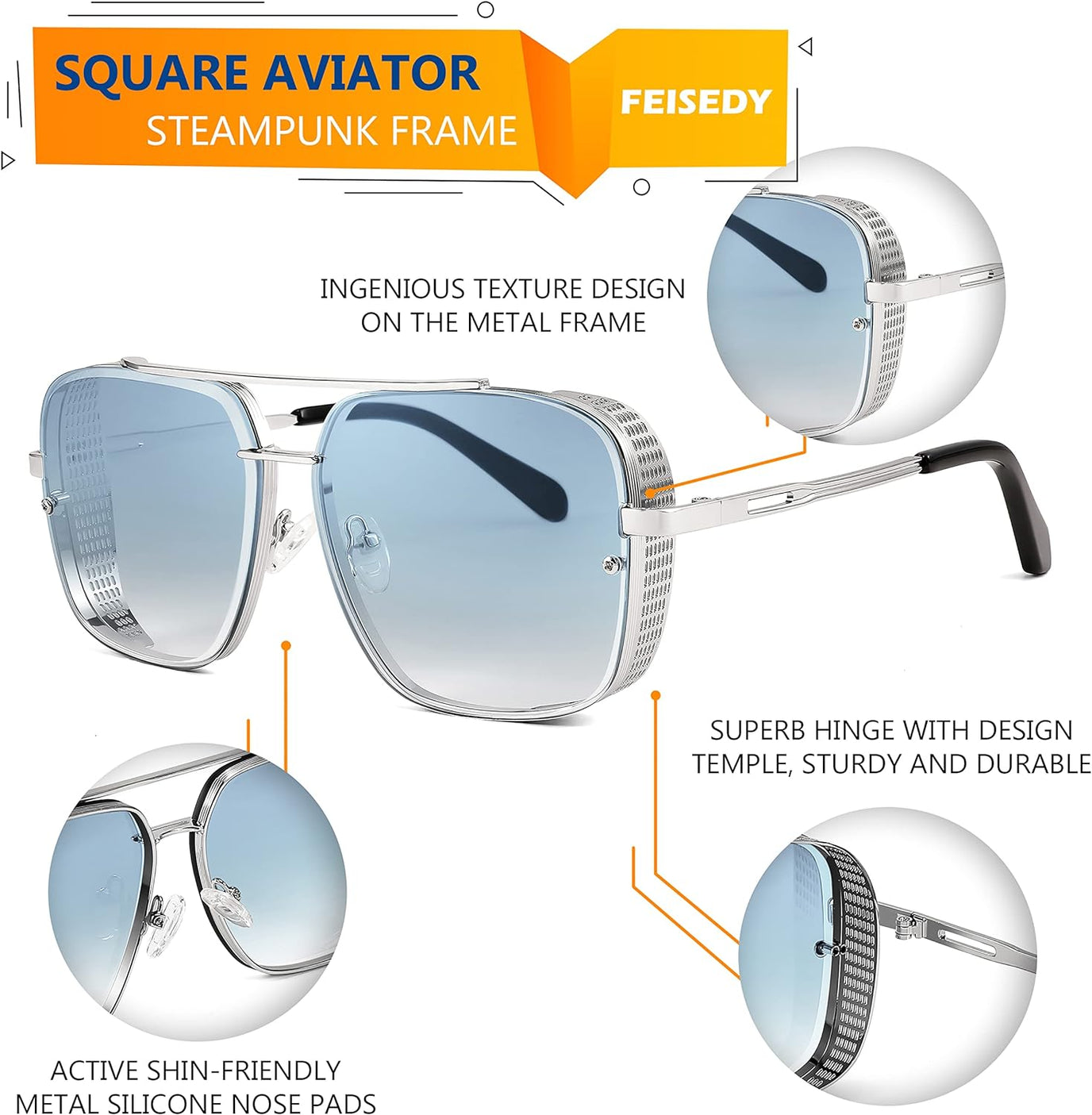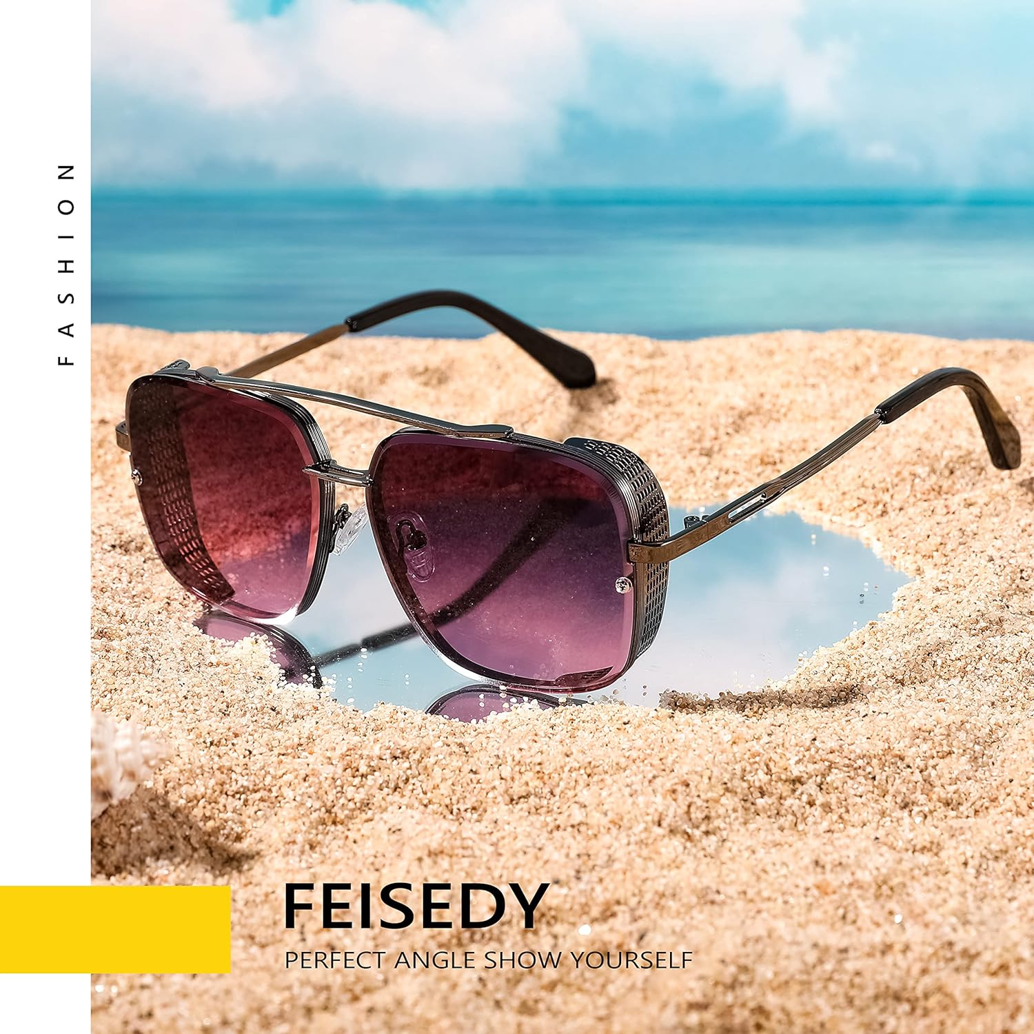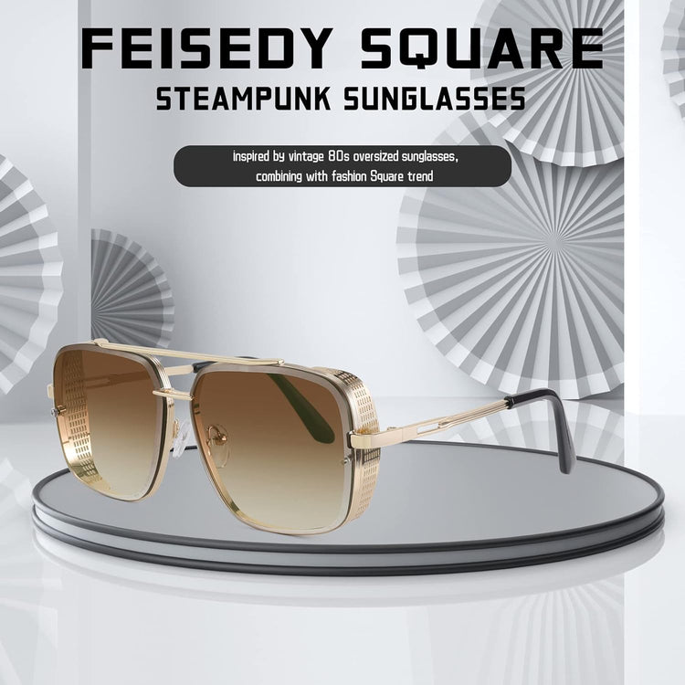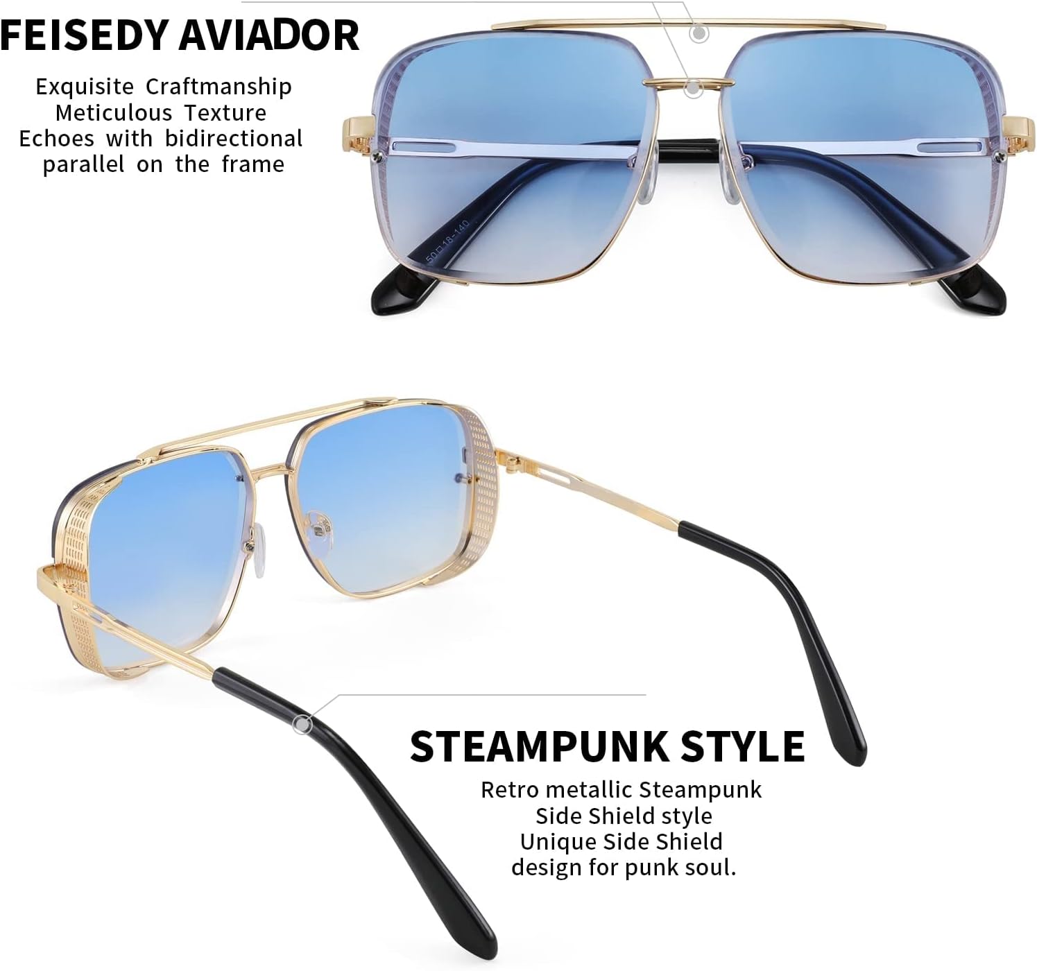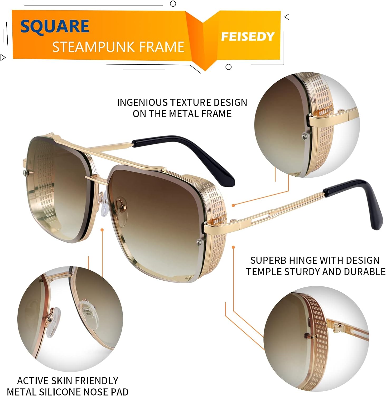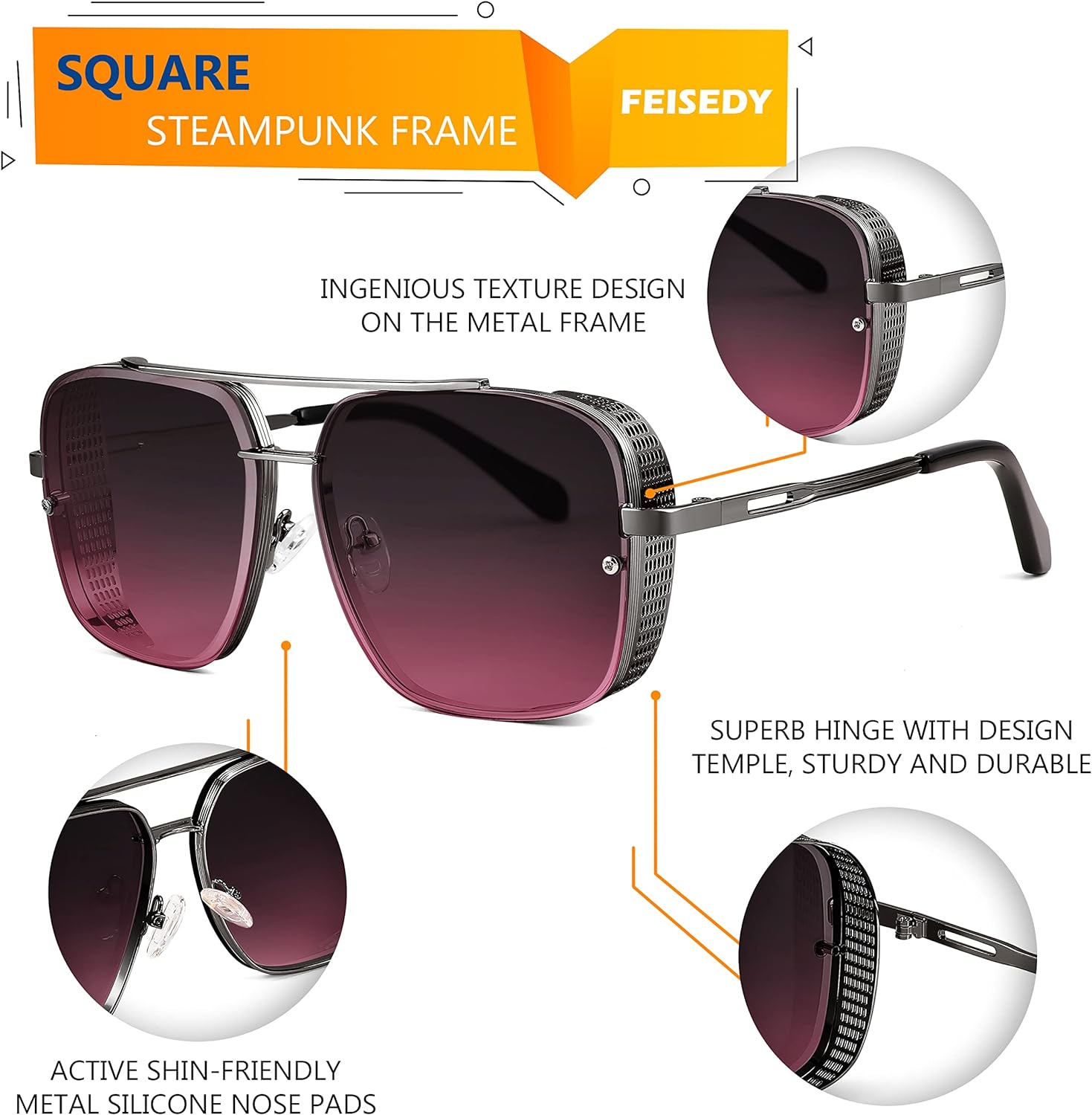 FEISEDY Square Pilot Steampunk Sunglasses Men Vintage Metal Side Shield Oversized Sun Glasses B2894
