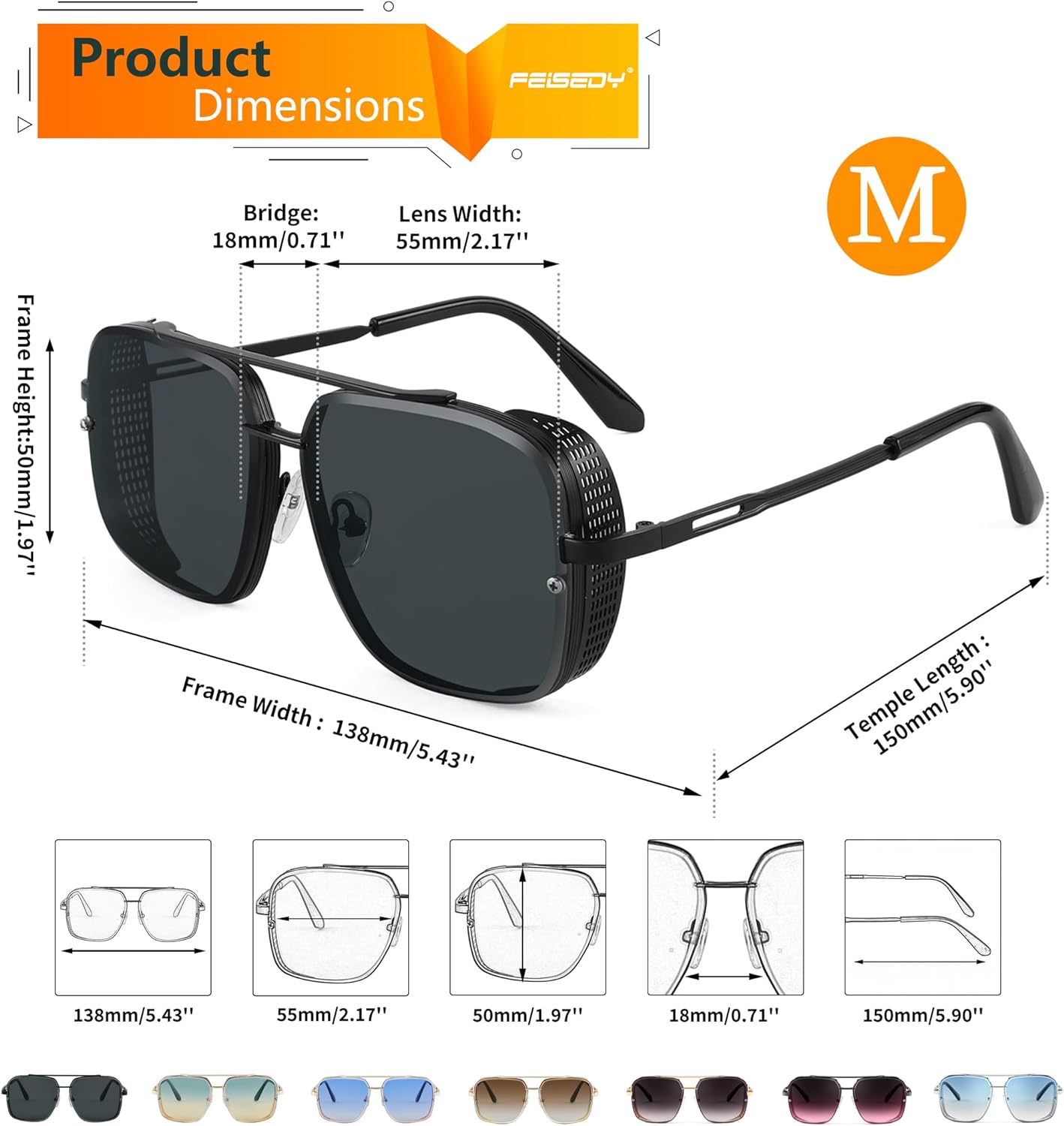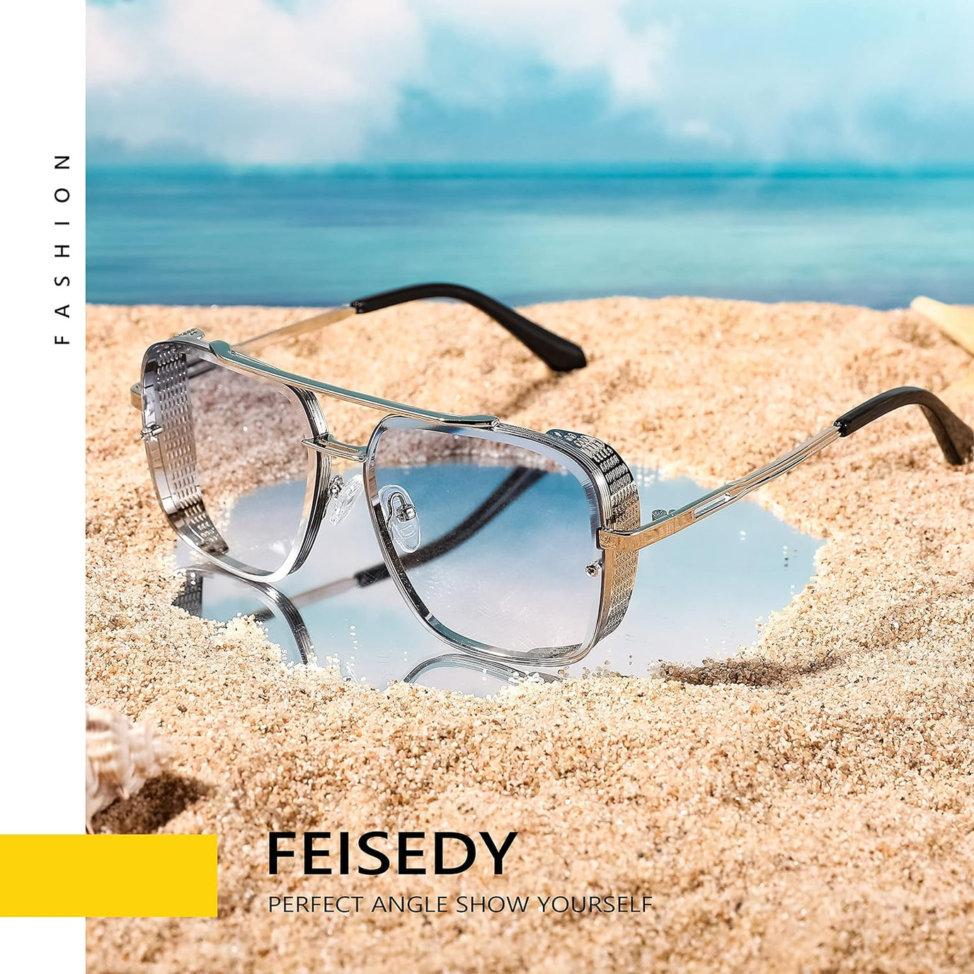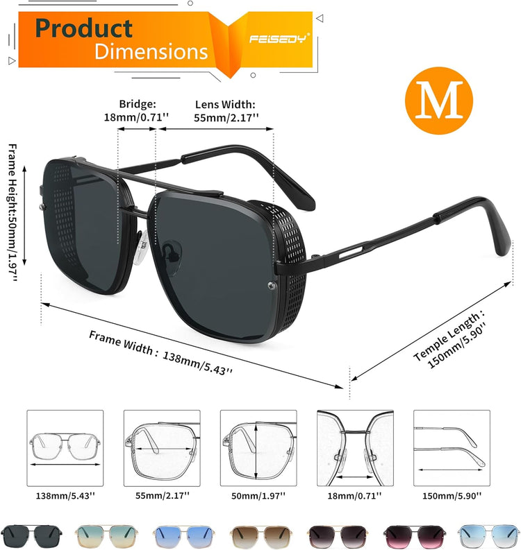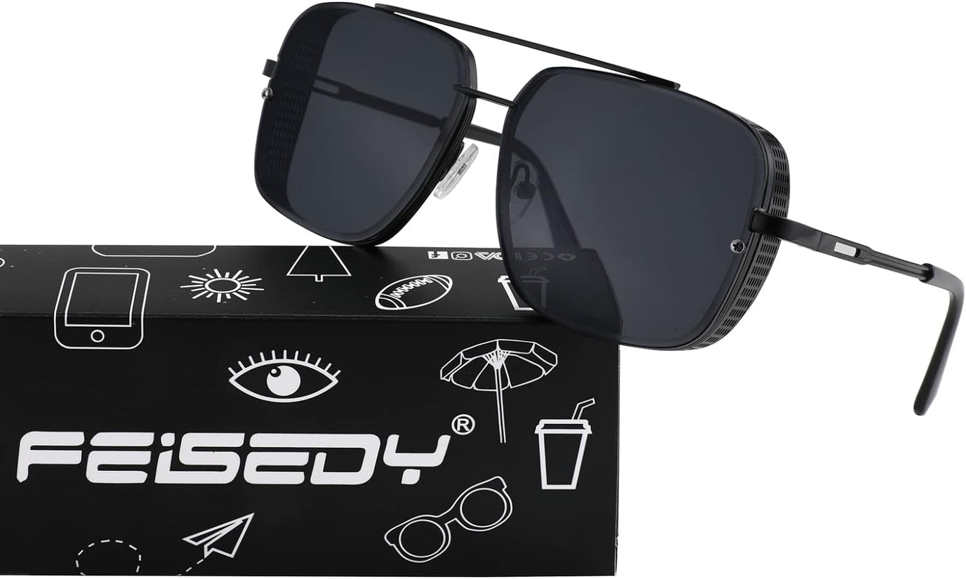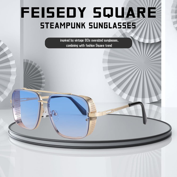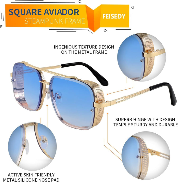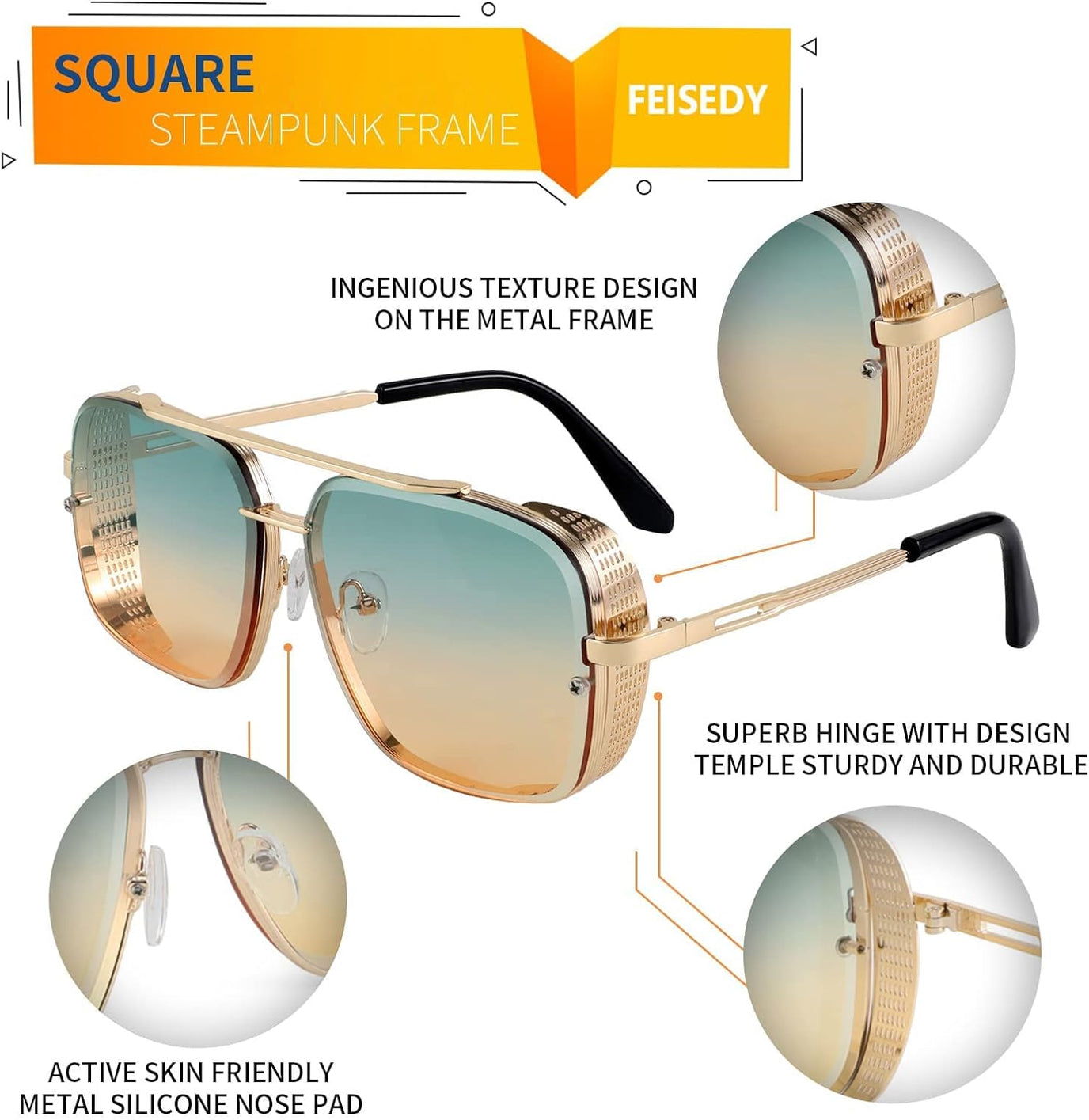 FEISEDY Square Pilot Steampunk Sunglasses Men Vintage Metal Side Shield Oversized Sun Glasses B2894