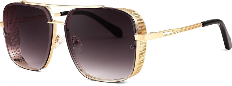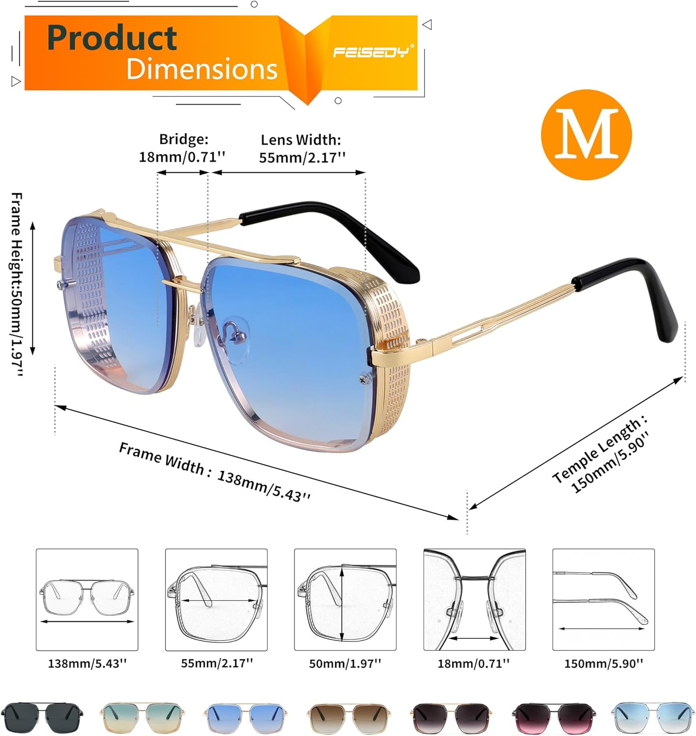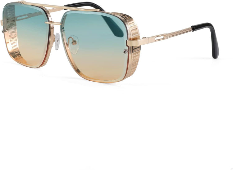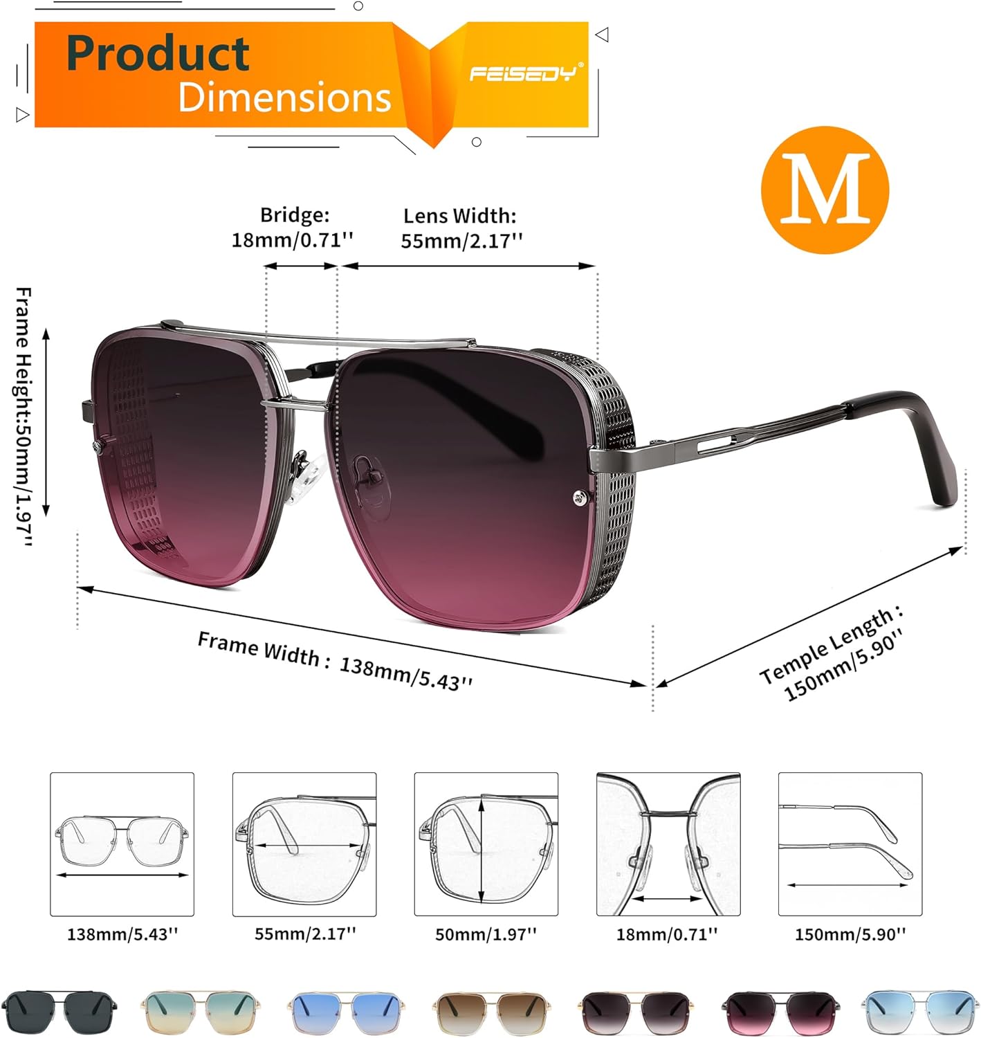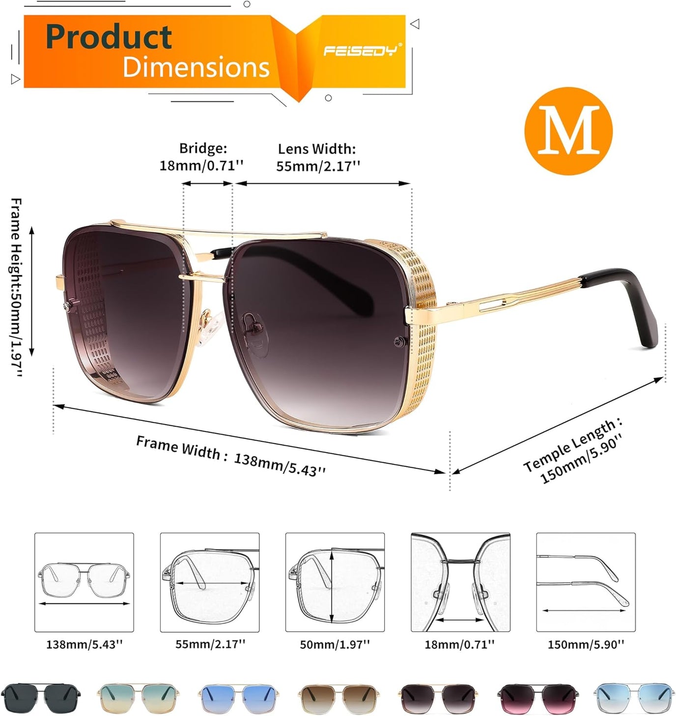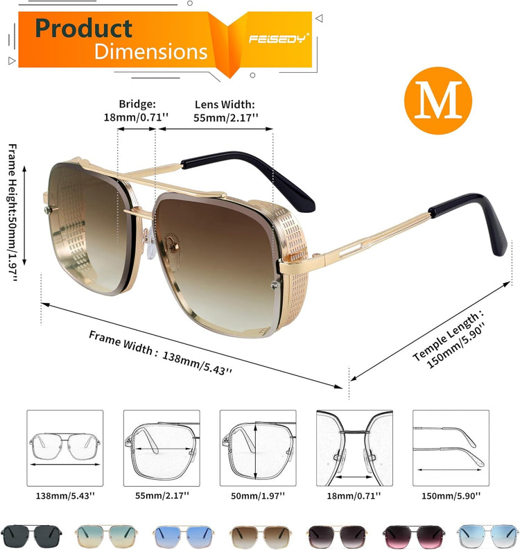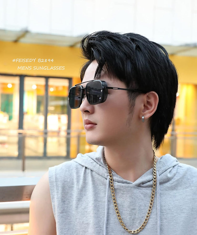 FEISEDY Square Pilot Steampunk Sunglasses Men Vintage Metal Side Shield Oversized Sun Glasses B2894