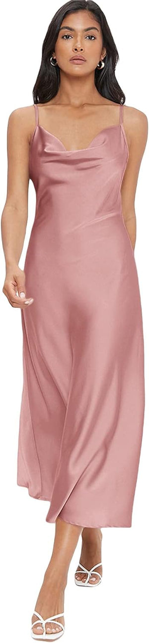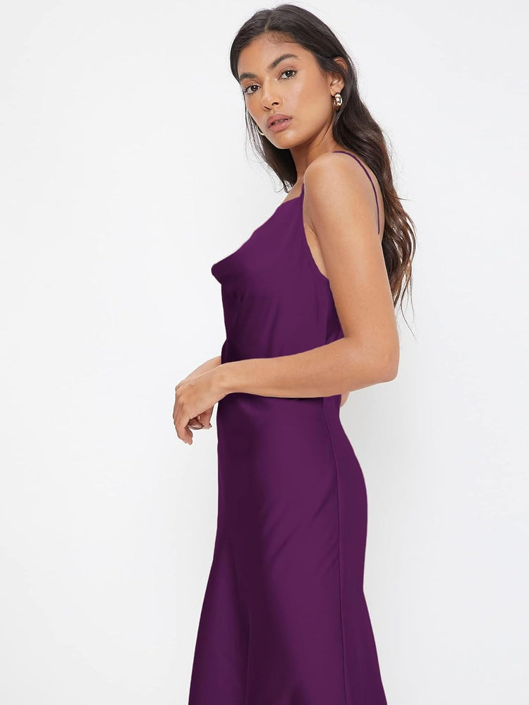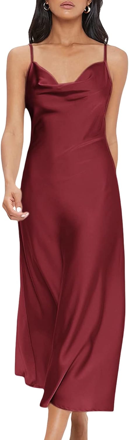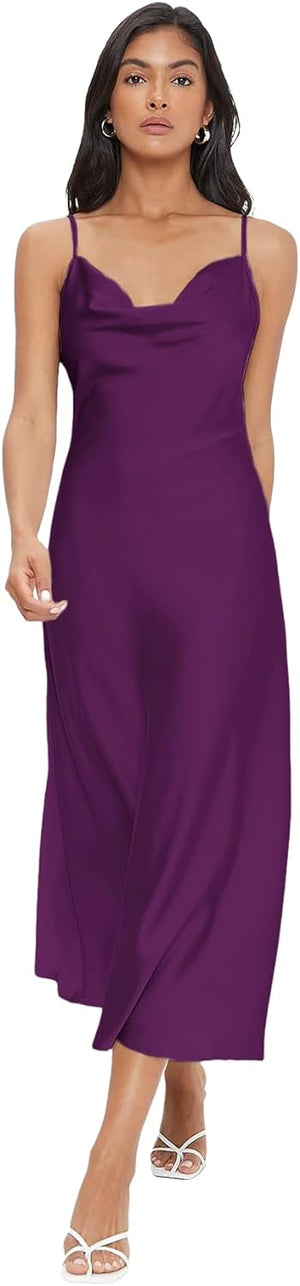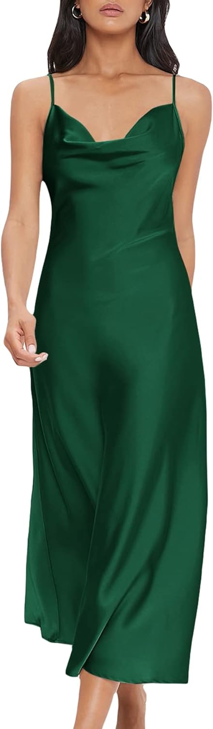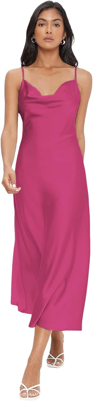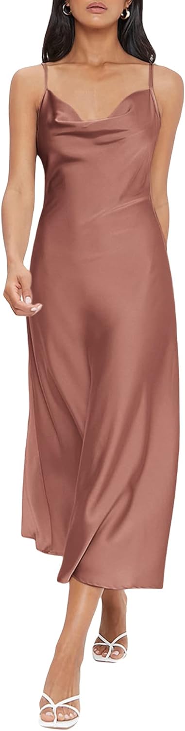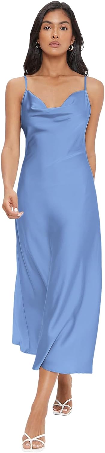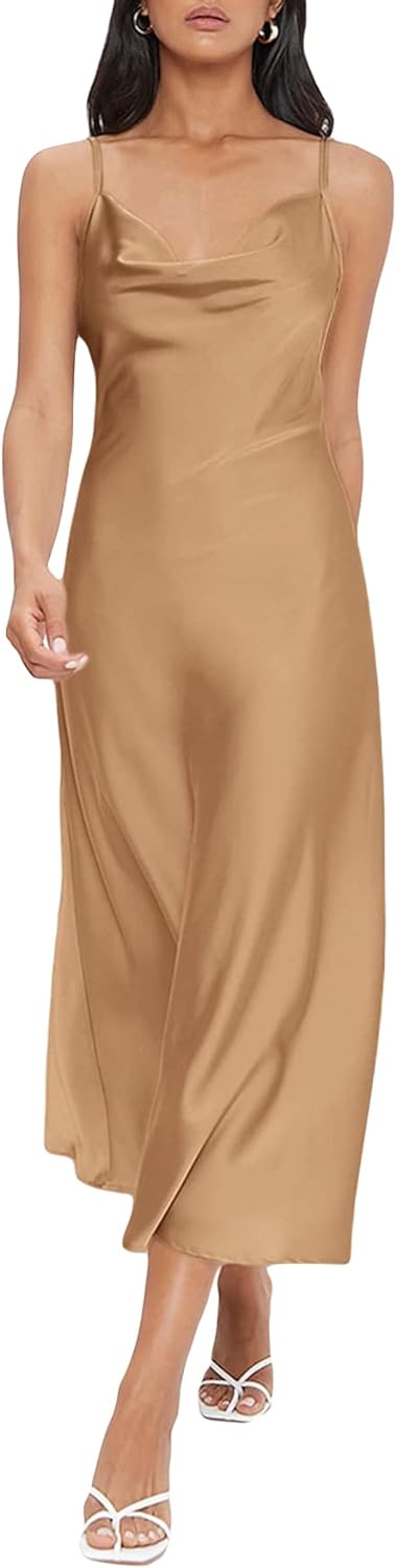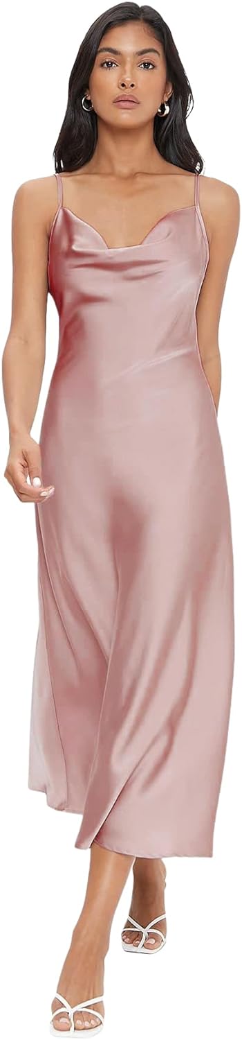 Floerns Women's Spaghetti Strap Cowl Neck Long Slip Satin Silk Midi Dress
