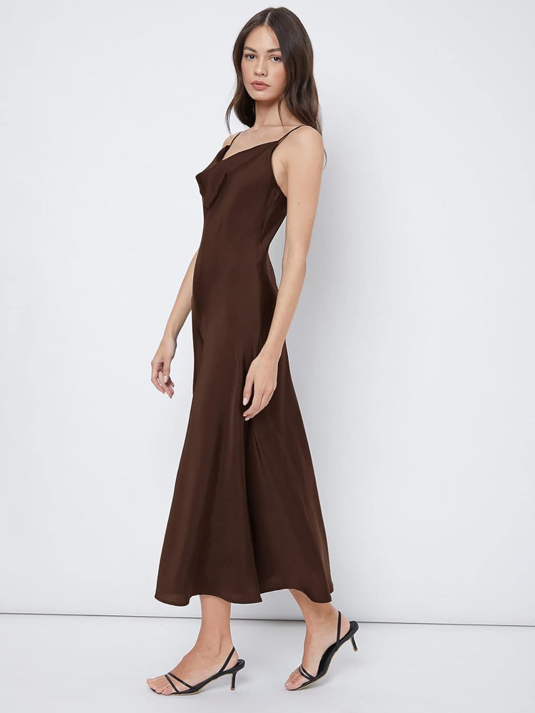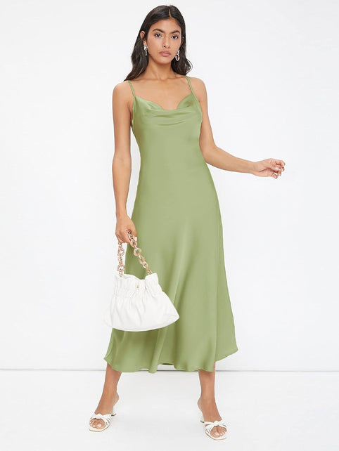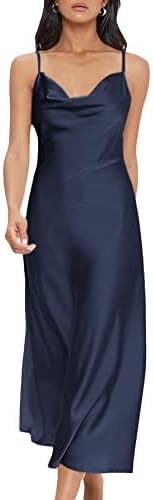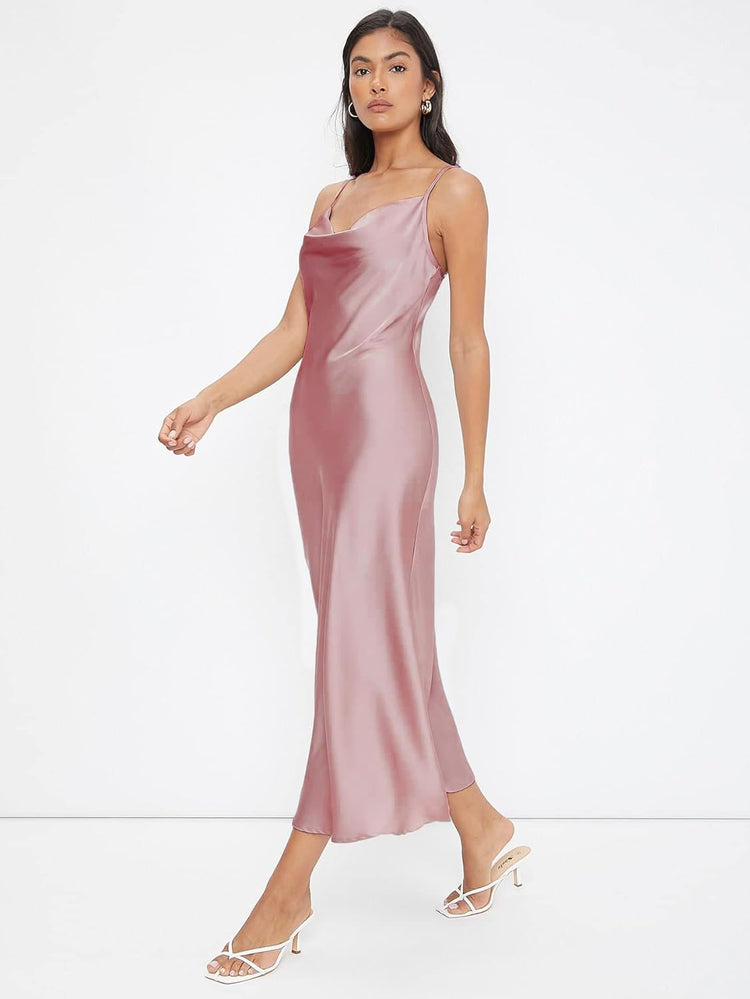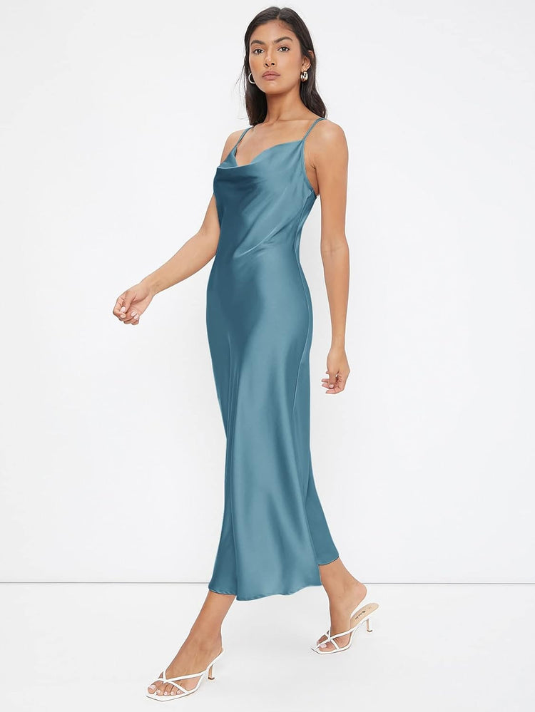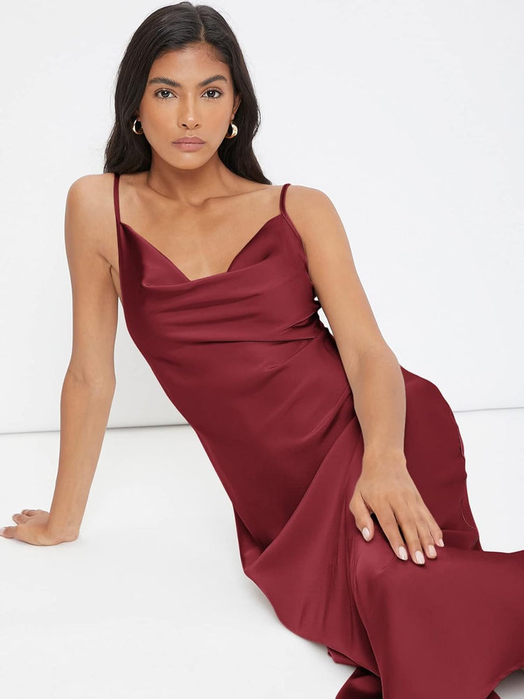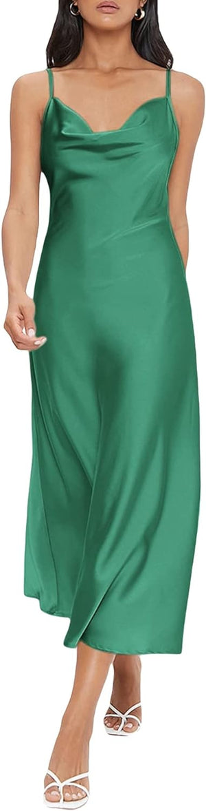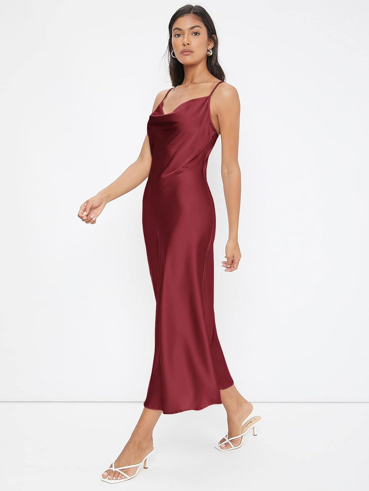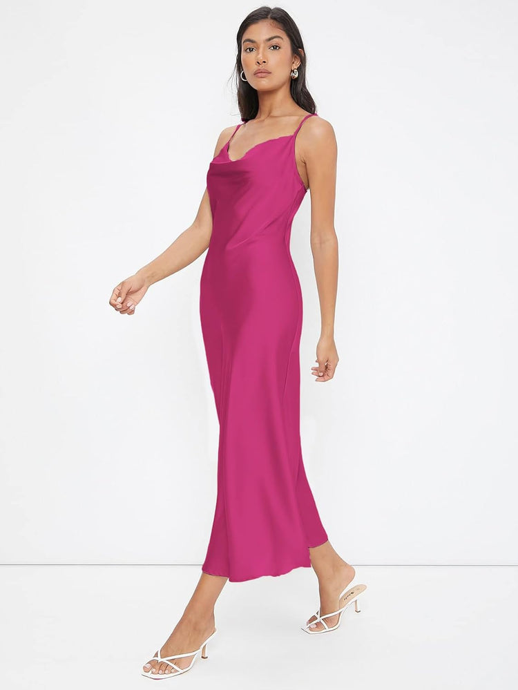 Floerns Women's Spaghetti Strap Cowl Neck Long Slip Satin Silk Midi Dress