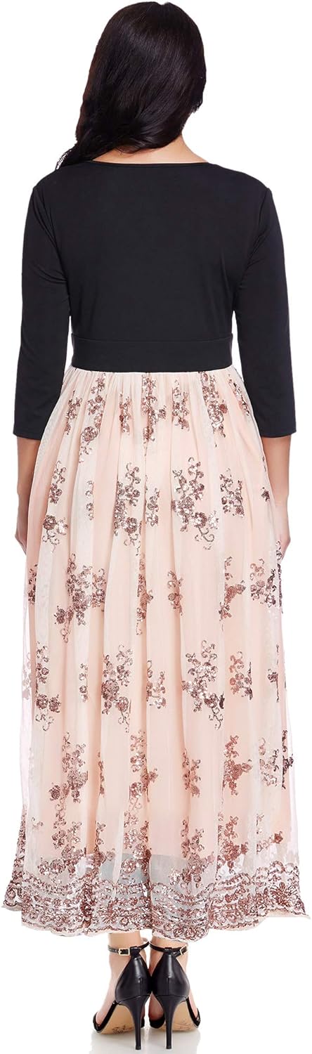Haven't decided what to wear in your coming evening party? This sequin long dress will be your choice. It features 3/4 sleeves, surplice neckline and empire waist design. Differs from its solid bodice, its skirt has sequins detailing, all form into fit and flare shape and show off your charming silhouette. You can style it with high heels. This maxi dress will be perfect for evening party, formal, club or other special occasions.