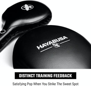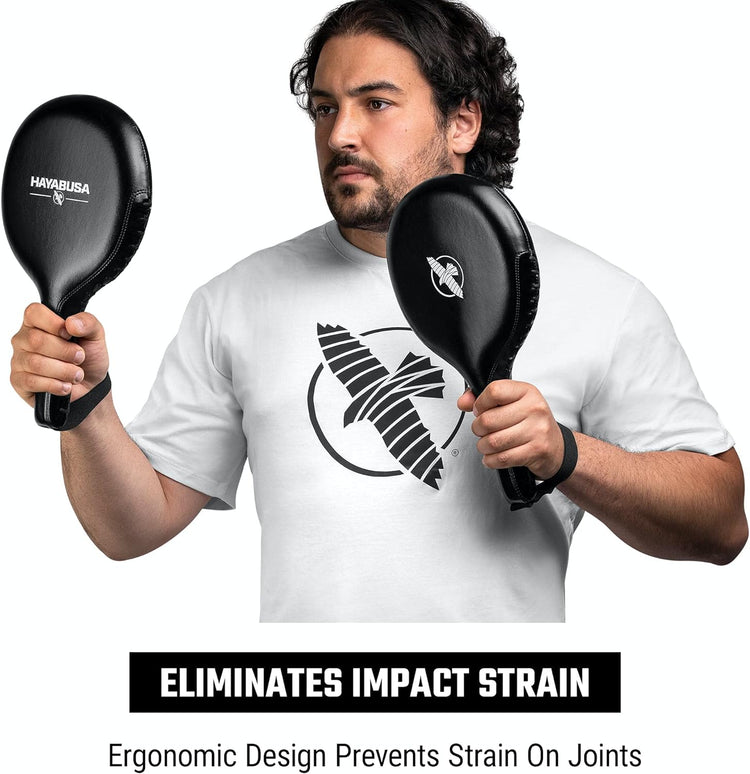 The Hayabusa Boxing Paddles are crafted to become coaches’ favorite training tool. The ergonomic grips feel natural in your hands and help to eliminate impact strain and withstand intense pad work with ease. Ideal for high-speed drills, these paddles offer perfectly balanced padding that delivers feedback to both coach and boxer with a satisfying pop when a punch hits the sweet spot. Features Specifications Ergonomic handle grips eliminate hand, wrist, & shoulder impact strain Perfectly balanced density & weight for high speed drills Flat striking surface delivers a satisfying pop on impact Compact design with striking targets for precision training Elastic loops secure to your wrists for a comfortable and effortless grip Reinforced double stitching provides incredible durability Length: 35 cm / 13.8 in Paddle width: 19 cm / 7.5 in Exterior: PU leather, reinforced stitching, elastic loops Interior: EVA foam padding with a sturdy acrylic spine Best for: Boxing, kickboxing, muay thai, Karate, Taekwondo