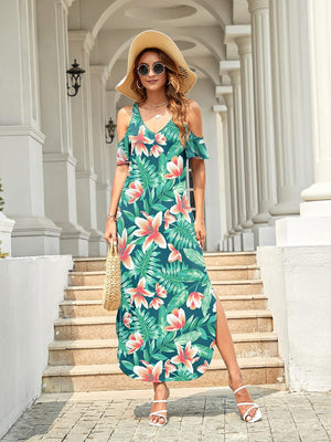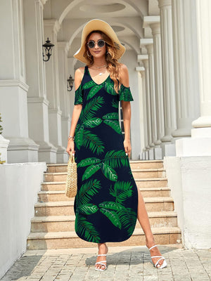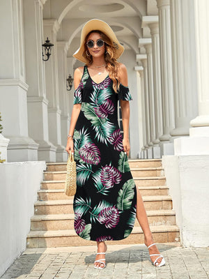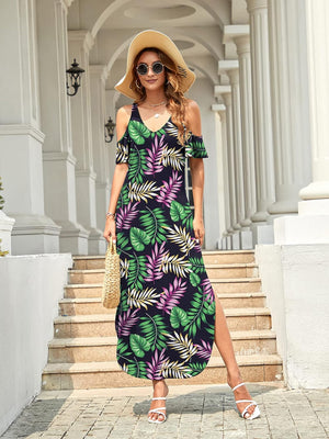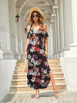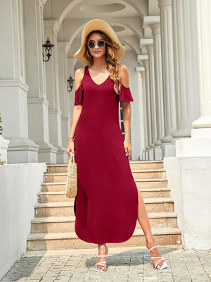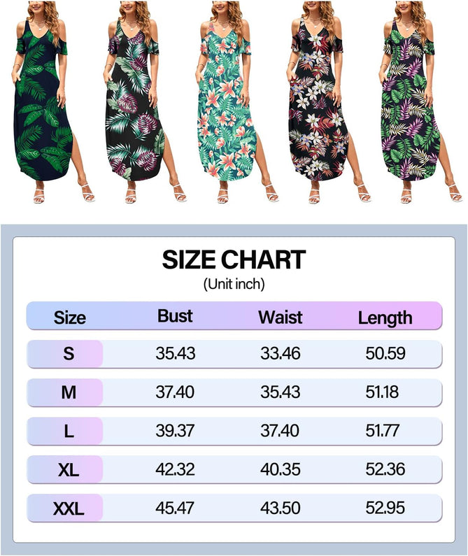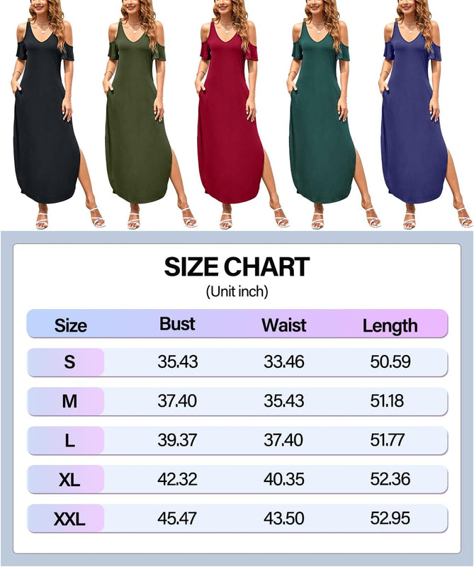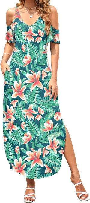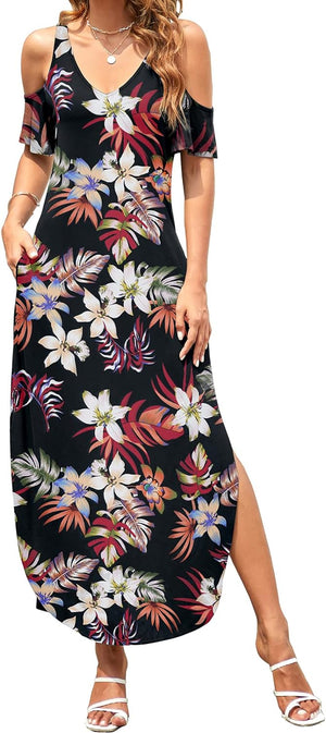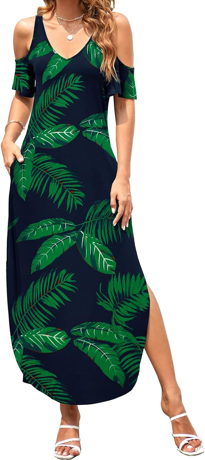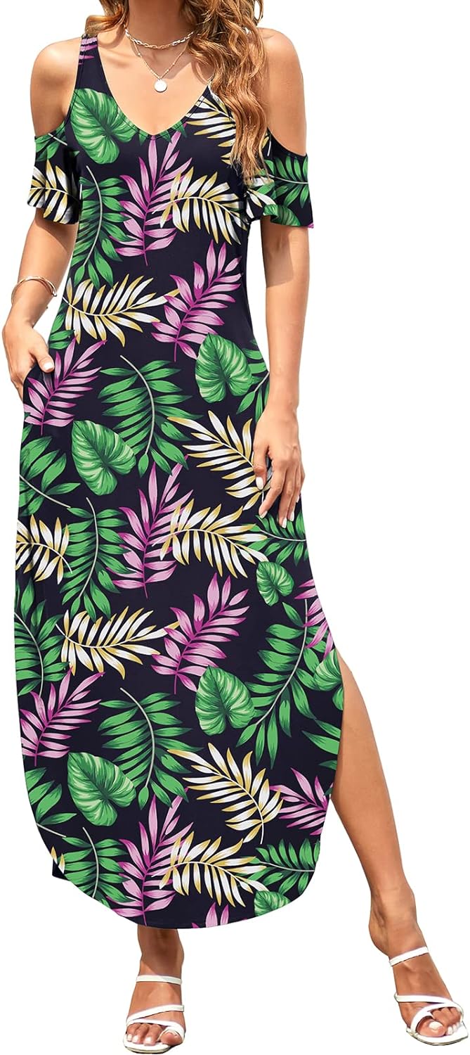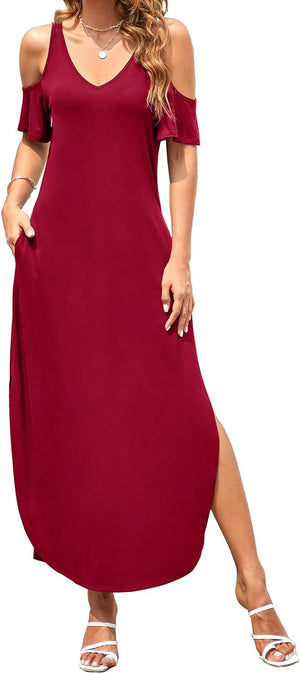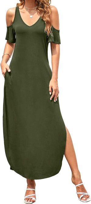 HUSKARY Women's Summer Maxi Dresses V Neck Cold Shoulder Short Sleeve Casual Loose Long Split Dress with Pocket