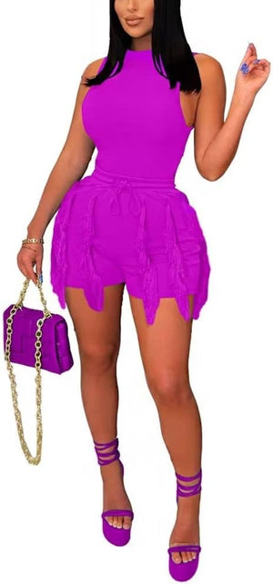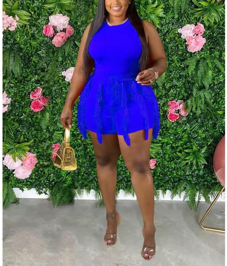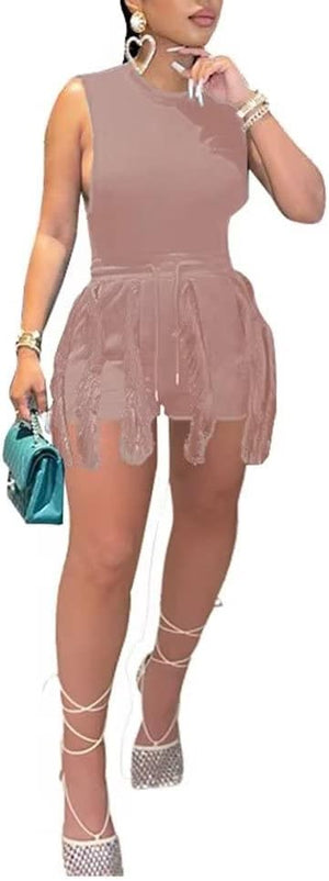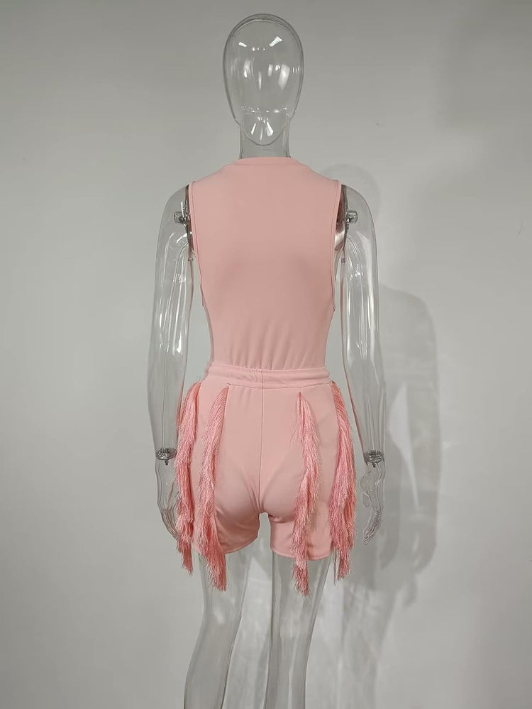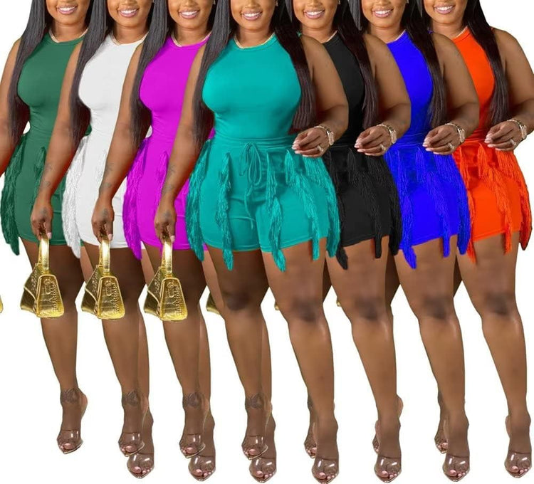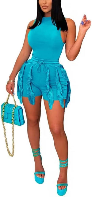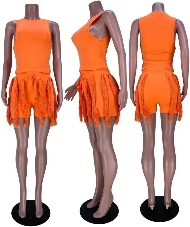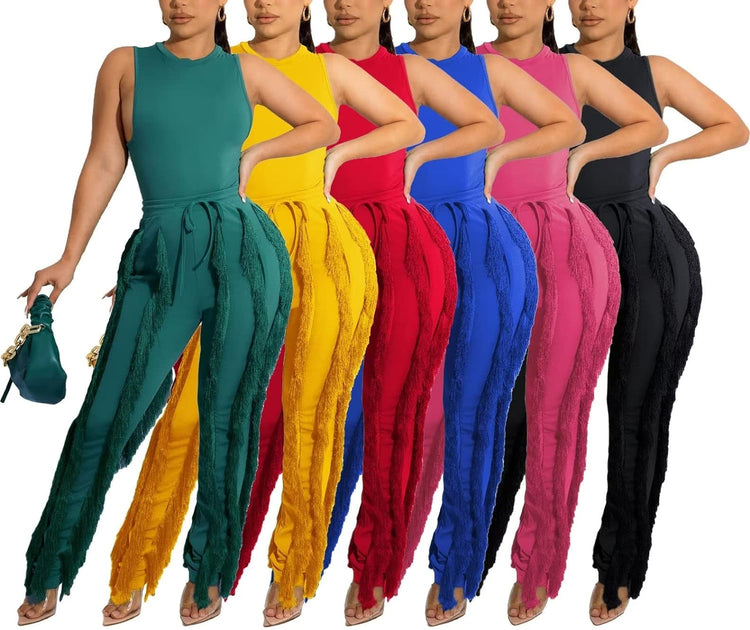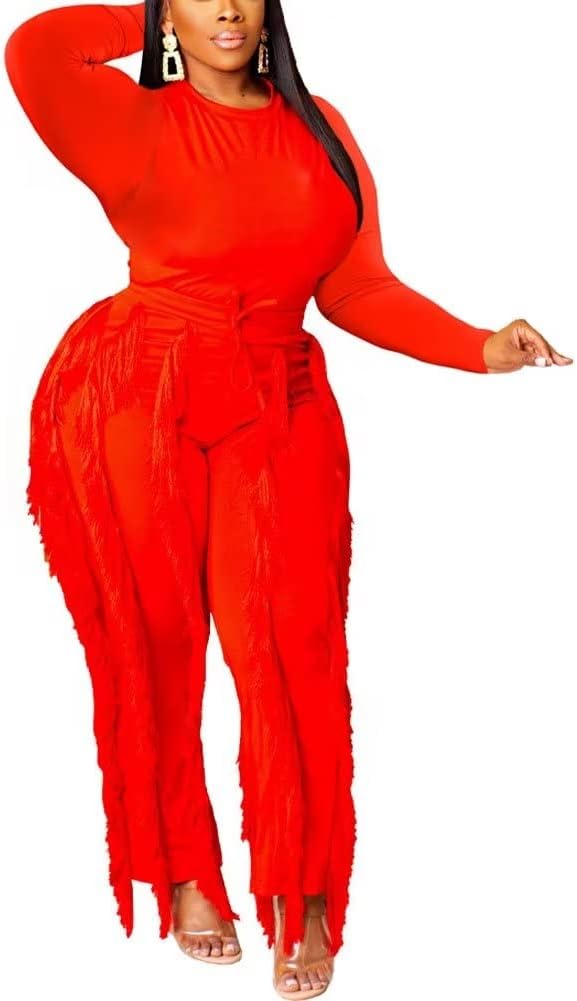IyMoo Two Piece Outfits for Women Long Sleeve Sleeveless Tank Tops Fringe Tassel Shorts Long Pants Set Clubwear S-3XL