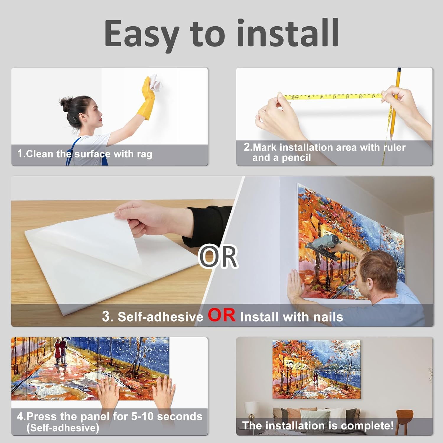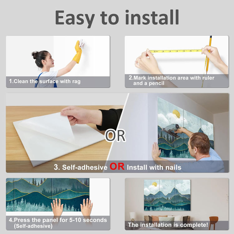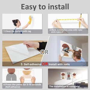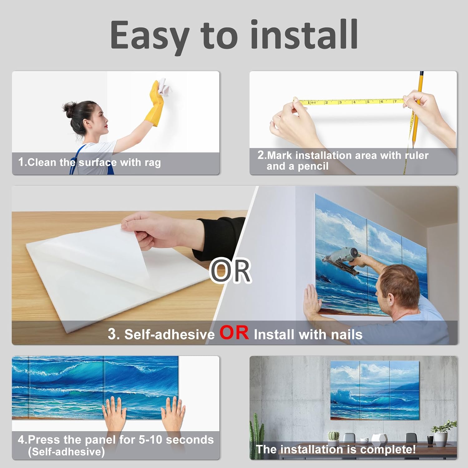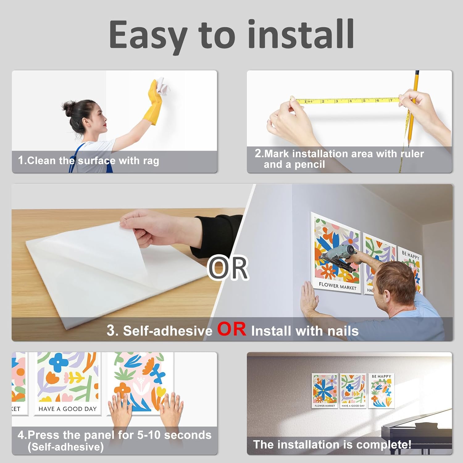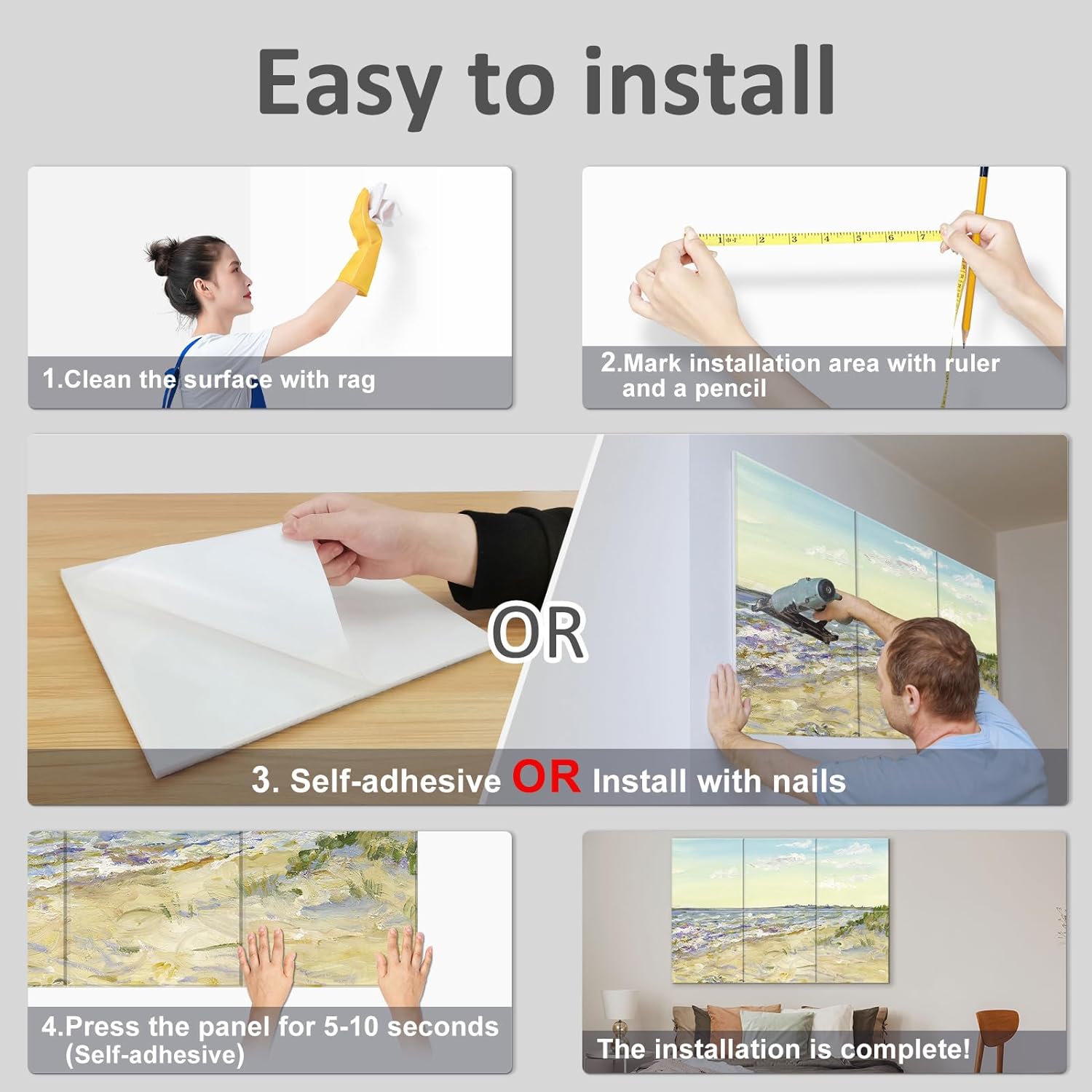 - 【Easy to Install】Our bedroom wall decor is self-adhesive. First, ensure that the wall is clean, dry, and structurally sound, free of dust, grease, oil or other debris. Then, mark the installation area with a tape measure and a pencil, tear off a layer of film behind the wall decorations, stick to the wall and press with your hands for 5-10 seconds to ensure the painting sticks tighter.