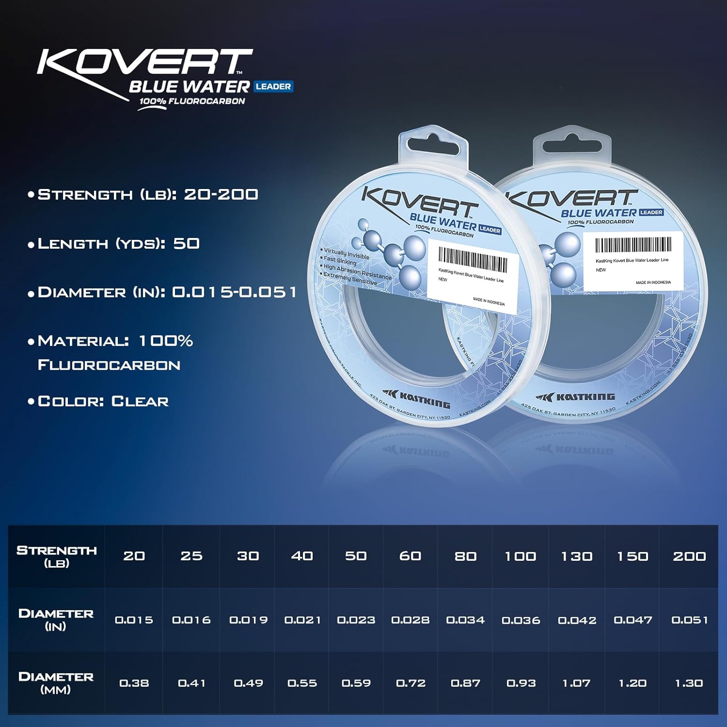 - 【100% FLUOROCARBON FISHING LEADER】KastKing Kovert Blue Water Fluorocarbon fishing leader is engineered using Japanese PVDF resin. Engineered for tough blue water fishing conditions, it has lower stretch and higher abrasion resistance. It is exceptional when used to be attached to your main fishing line.