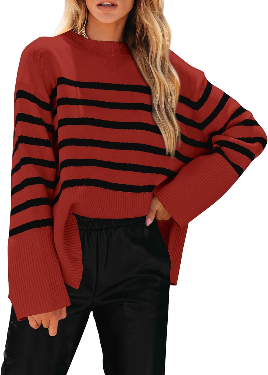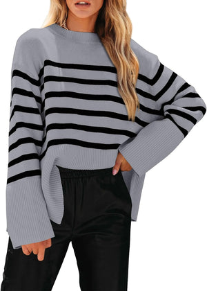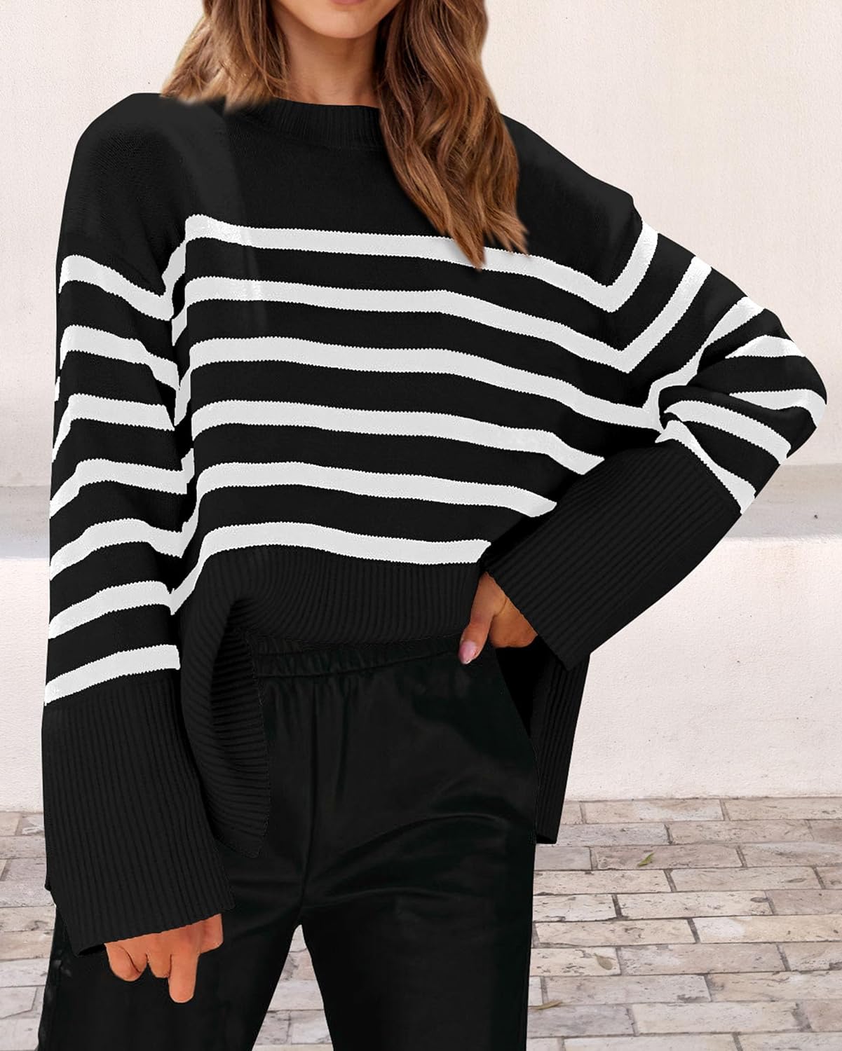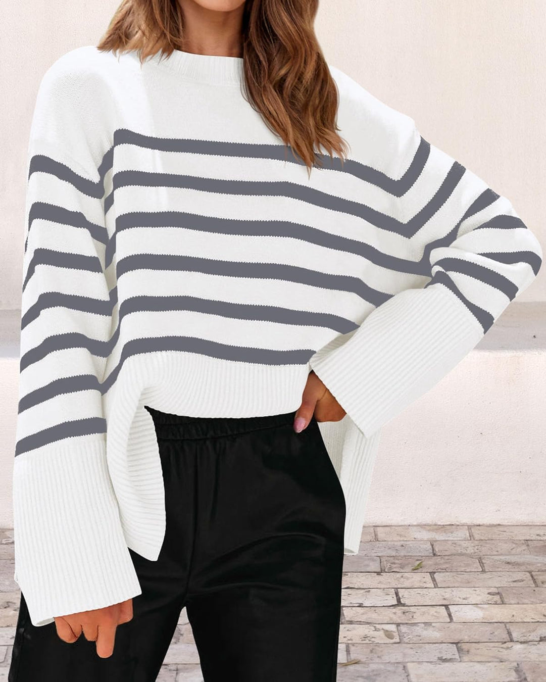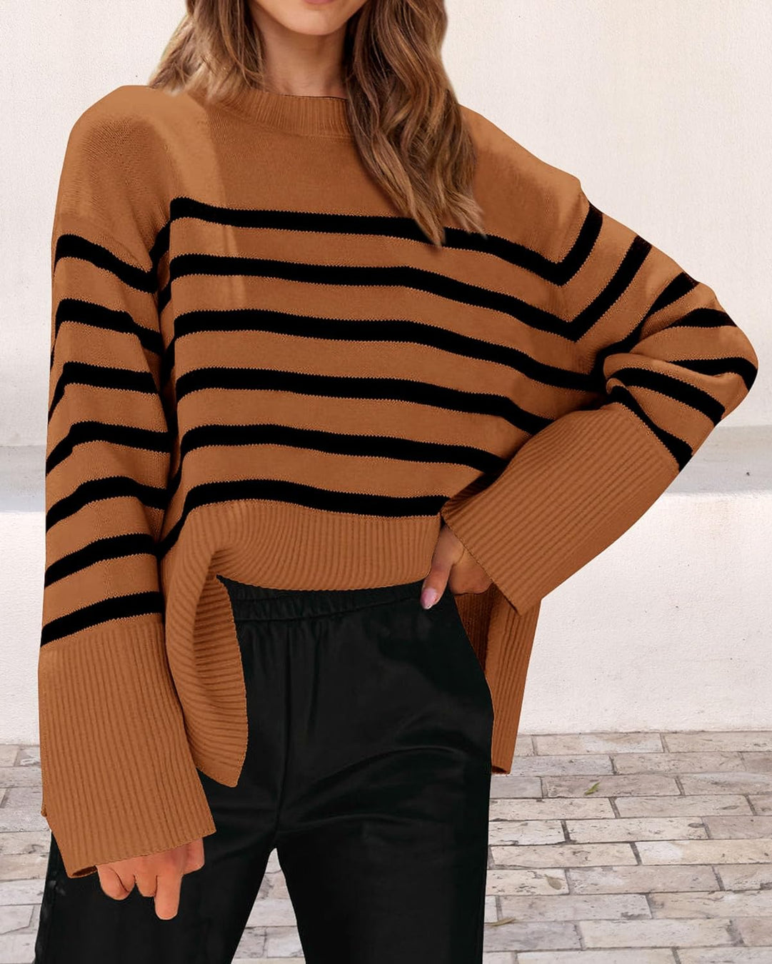 KIRUNDO Women's 2023 Fall Winter Casual Oversized Long Sleeve Striped Sweater Crew Neck Ribbed Knit Side Slit Pullover