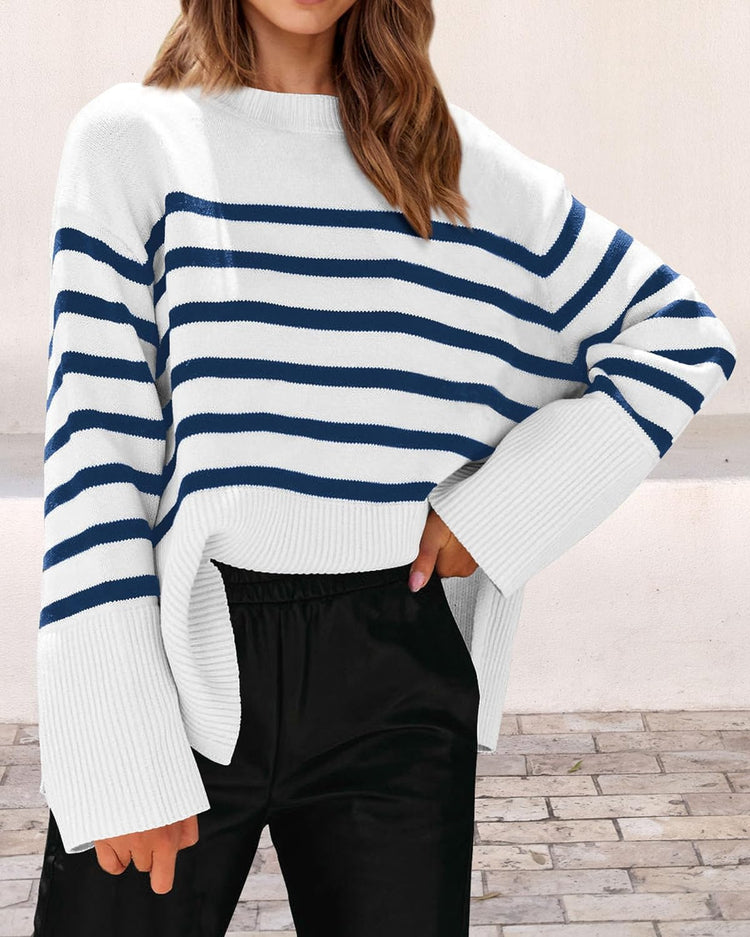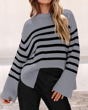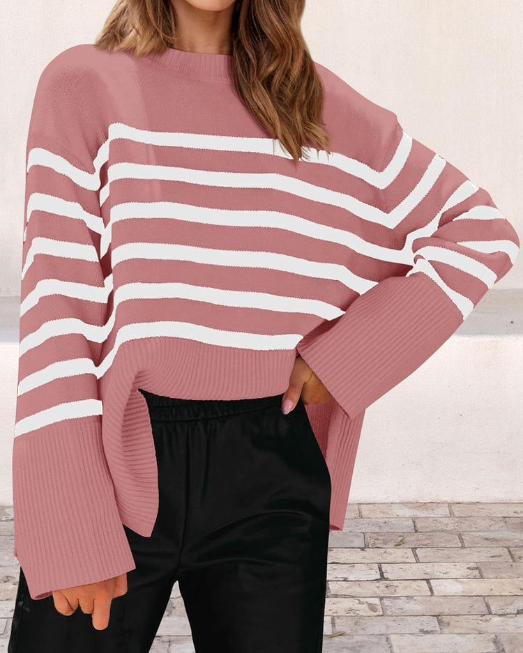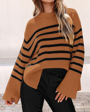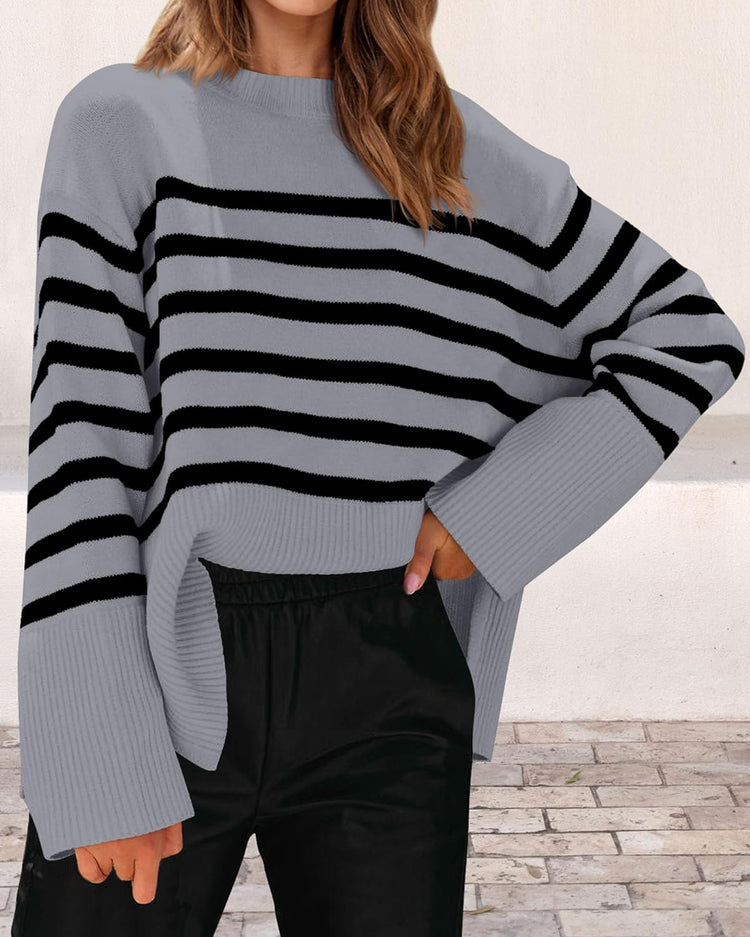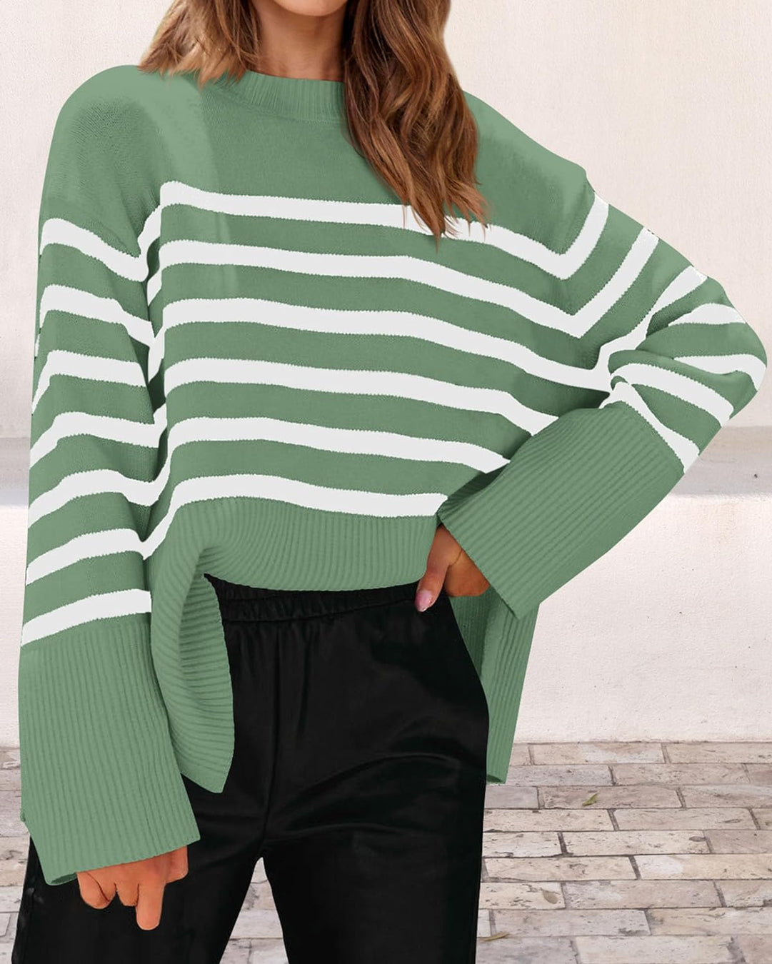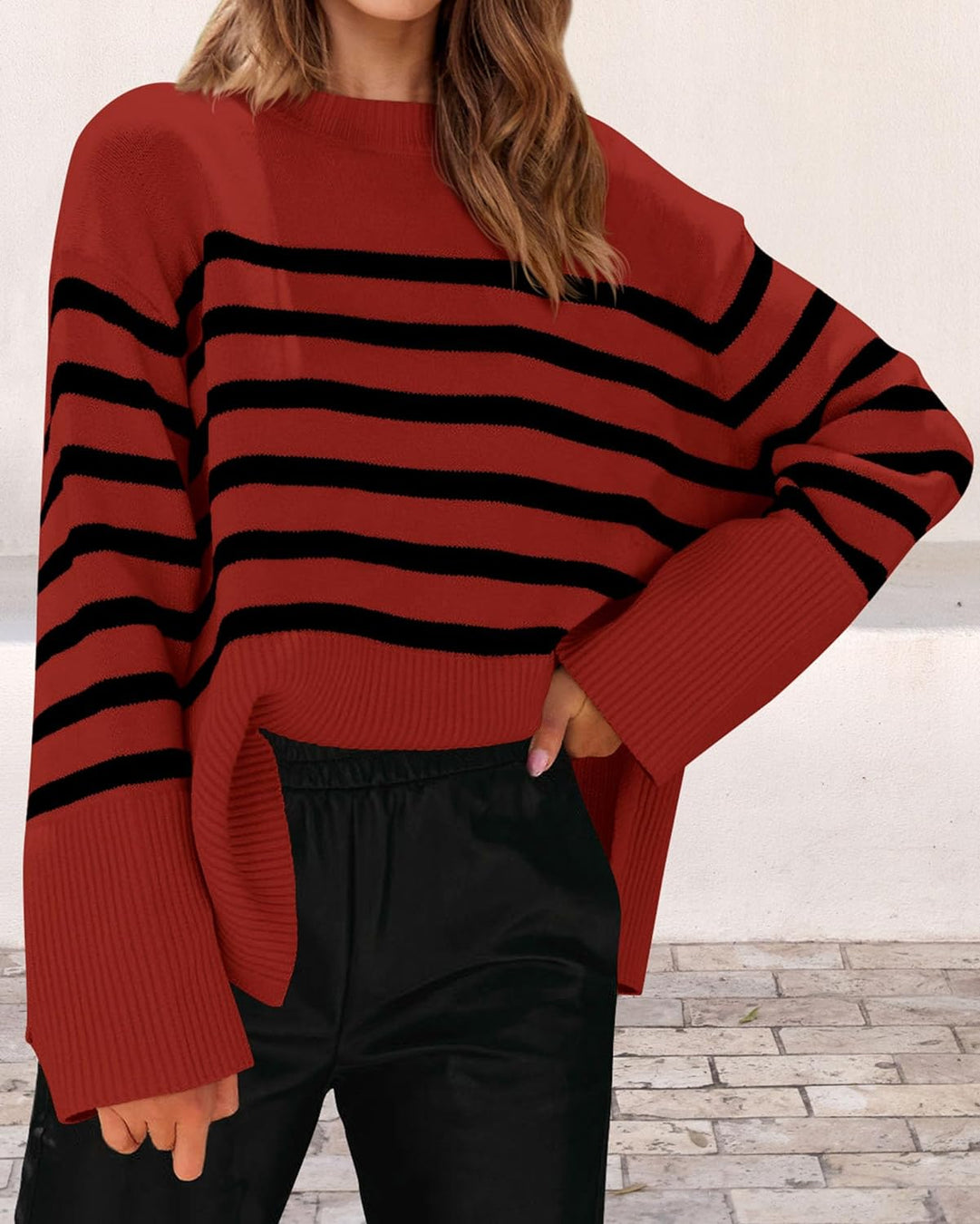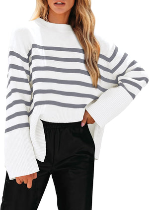 KIRUNDO Women's 2023 Fall Winter Casual Oversized Long Sleeve Striped Sweater Crew Neck Ribbed Knit Side Slit Pullover
