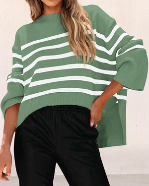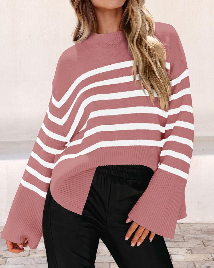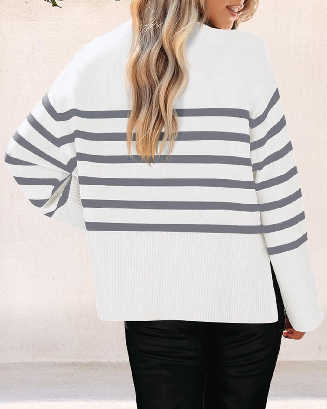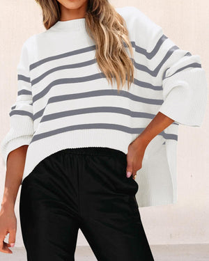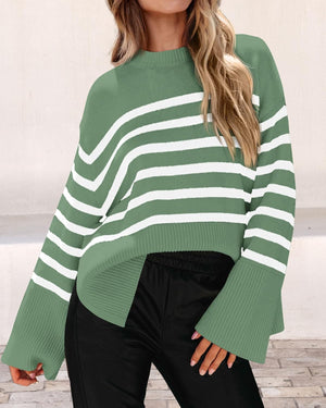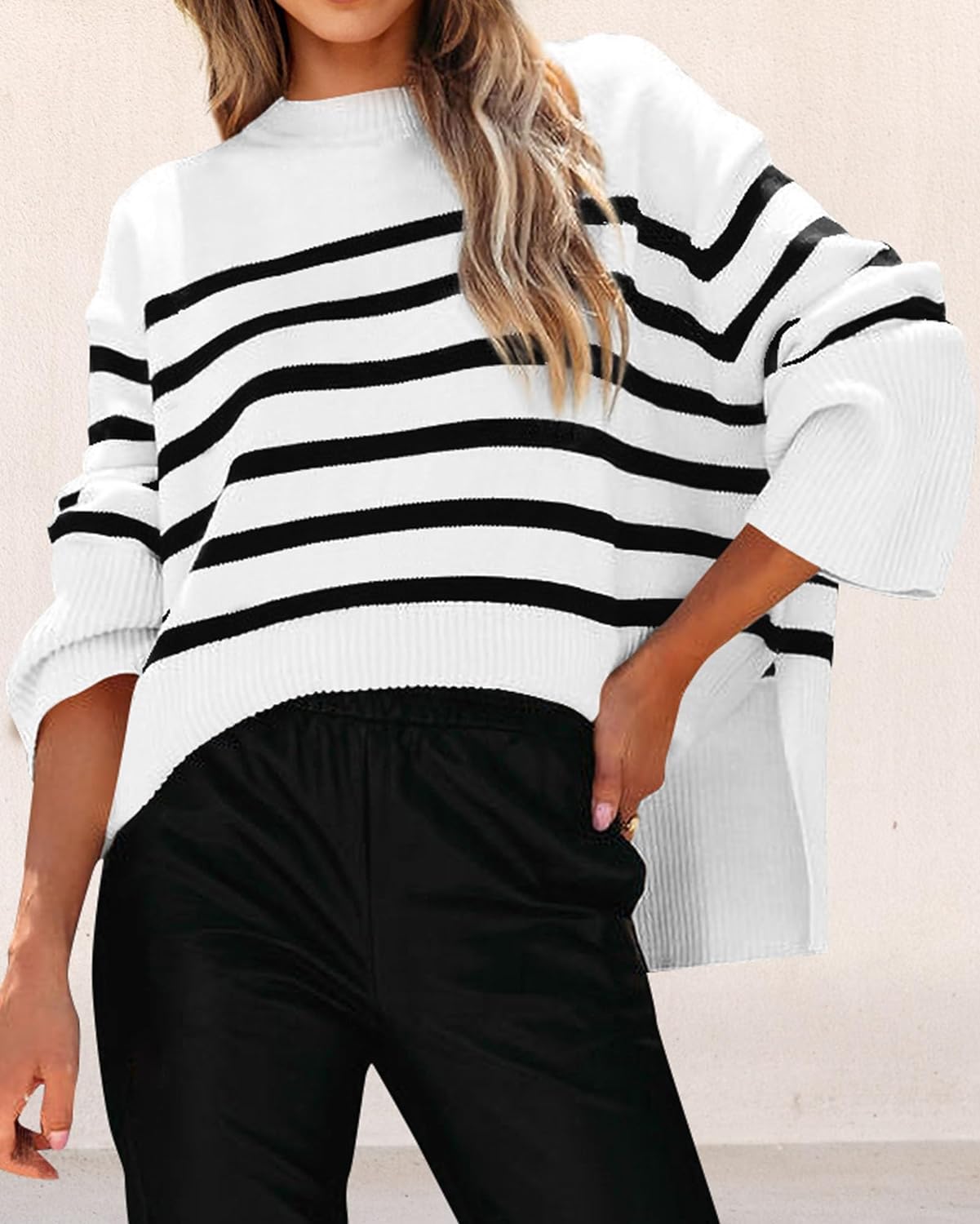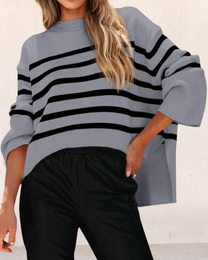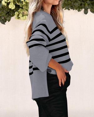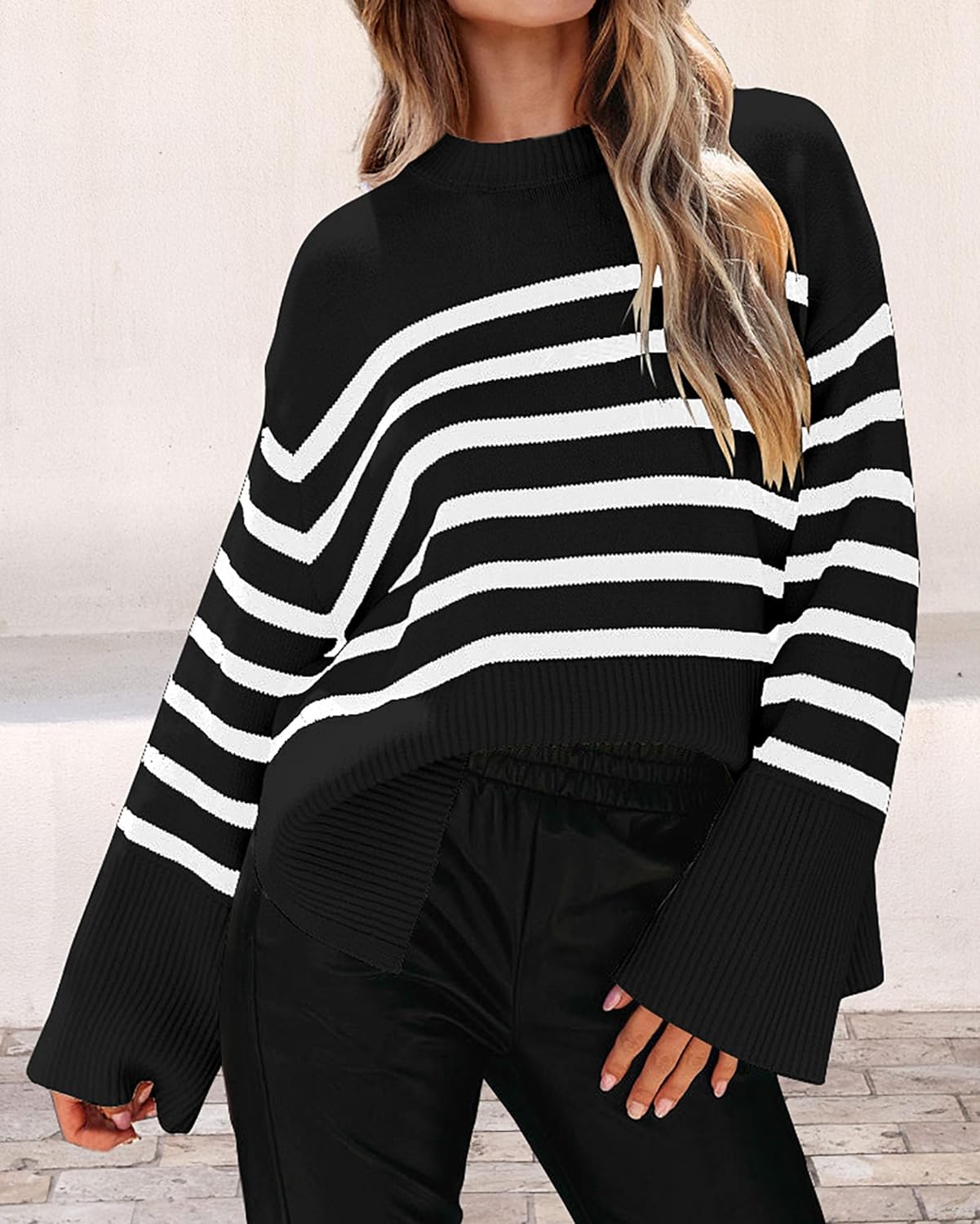KIRUNDO Women's 2023 Fall Winter Casual Oversized Long Sleeve Striped Sweater Crew Neck Ribbed Knit Side Slit Pullover