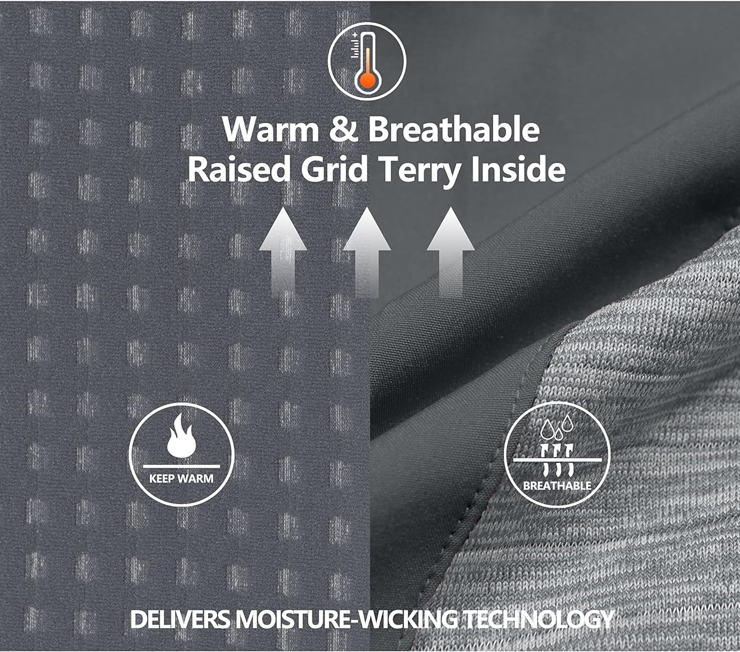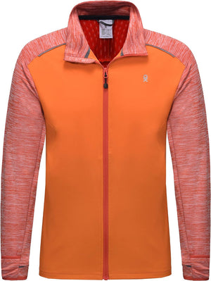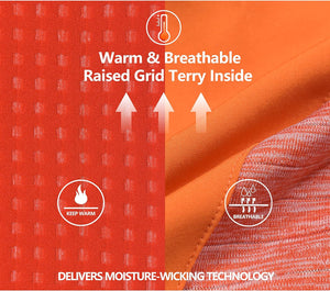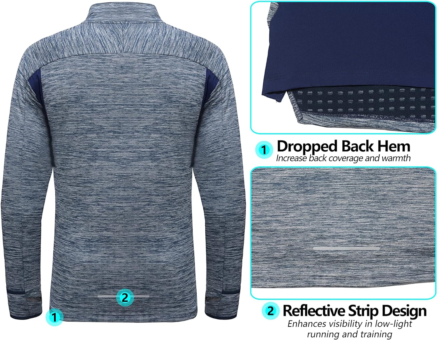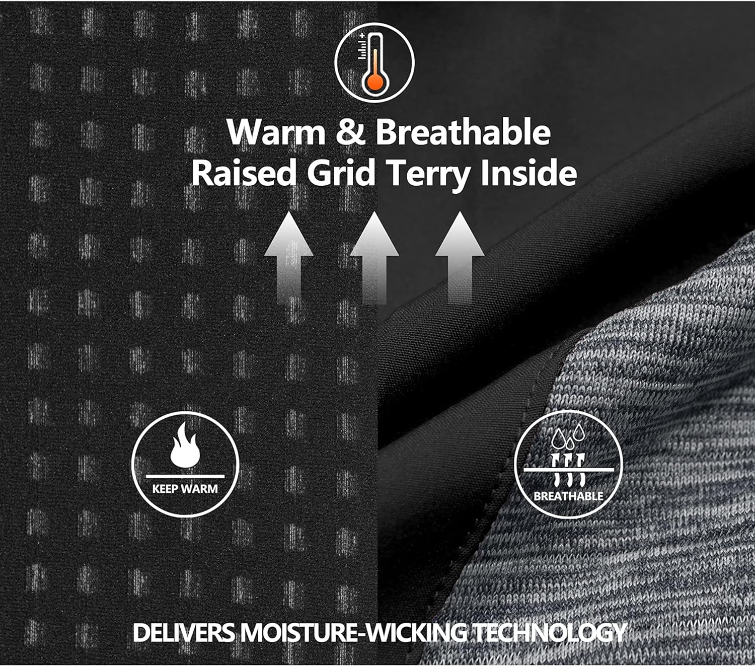 The mens full zip thermal running jacket has raised gird terry inside , built-in moisture-wicking technology, helps regulate breathability and dries out quickly, keep you warm and dry when the temps drop. Dropped back hem and Thumbholes with foldover mittens adds coverage and warmth. Comfort-stretch fabric with quick-drying performance helps you stay dry, comfortable and easy feel