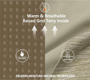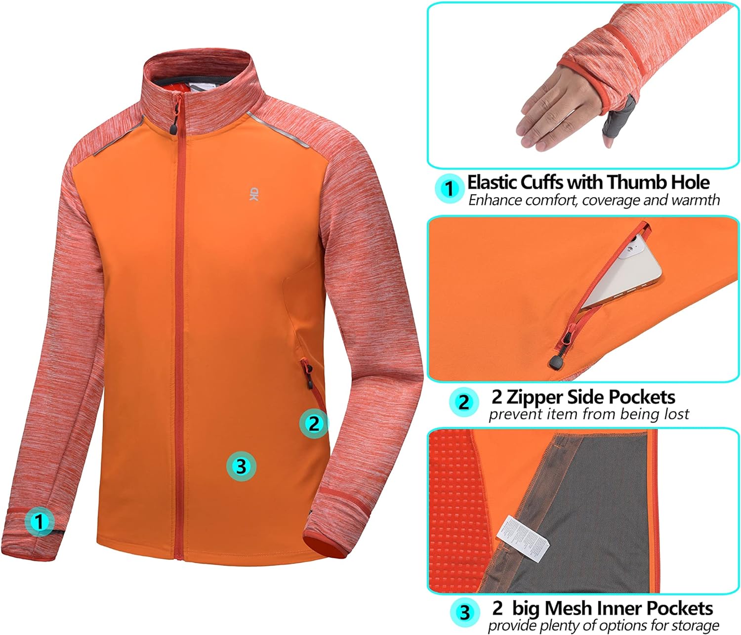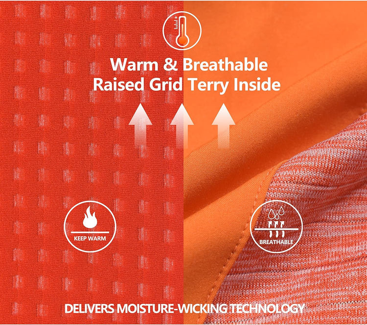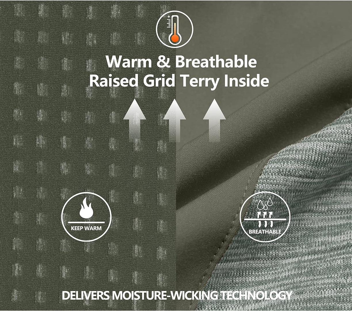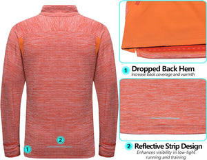 The mens full zip thermal running jacket has raised gird terry inside , built-in moisture-wicking technology, helps regulate breathability and dries out quickly, keep you warm and dry when the temps drop. Dropped back hem and Thumbholes with foldover mittens adds coverage and warmth. Comfort-stretch fabric with quick-drying performance helps you stay dry, comfortable and easy feel