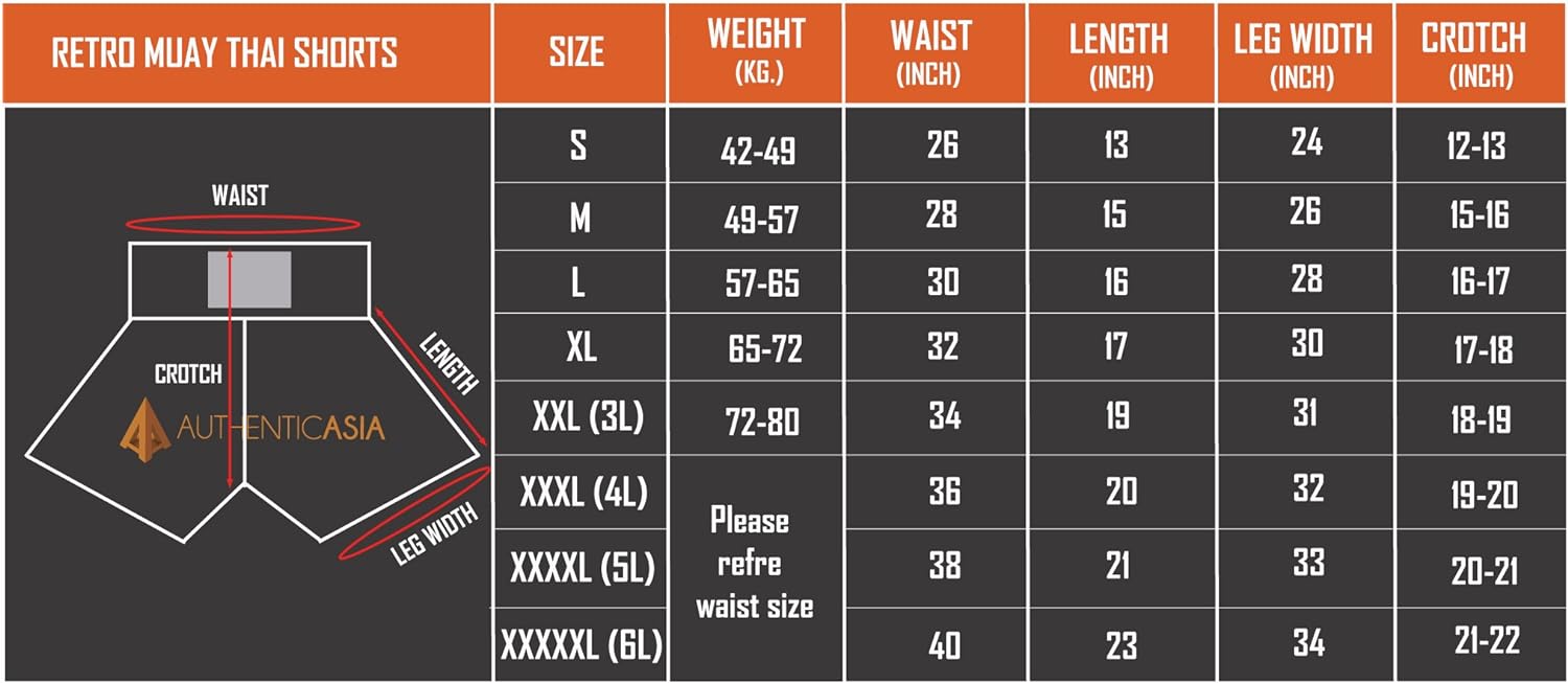These shorts are designed and cut to suit contact sports including Kick Boxing, Also suitable for workouts & other sports The design features ensure that shorts are not a hindrance in contact sports & do not restrict kicks and splits LUMPINEE the original brand from Lumpinee stadium, LUMPINEE Muay Thai Shorts provide you with both comfort and a stylish flair. They feature an extra wide cut in the leg area so as to allow the very most freedom of movement when kicking, performing knee strikes, and defensively checking kicks. They are ideal for both training and competition. LUMPINEE is a common sight at many Thailand training camps, gyms & stadiums. You will find them worn by both the best, seasoned Muay Thai Fighters as well as new students just starting. These Thai Boxing Shorts are 100% polyester satin, using the highest quality embroidery techniques and come from the epicenter of Muay Thai Fighting, Thailand. M-28", L-30" , XL-32" , XXL-34" , XXXL-36", 4XL-38", 5XL-40"-44" *****RECOMMENDED TO MEASURING SIZE BY WEIGHT*****