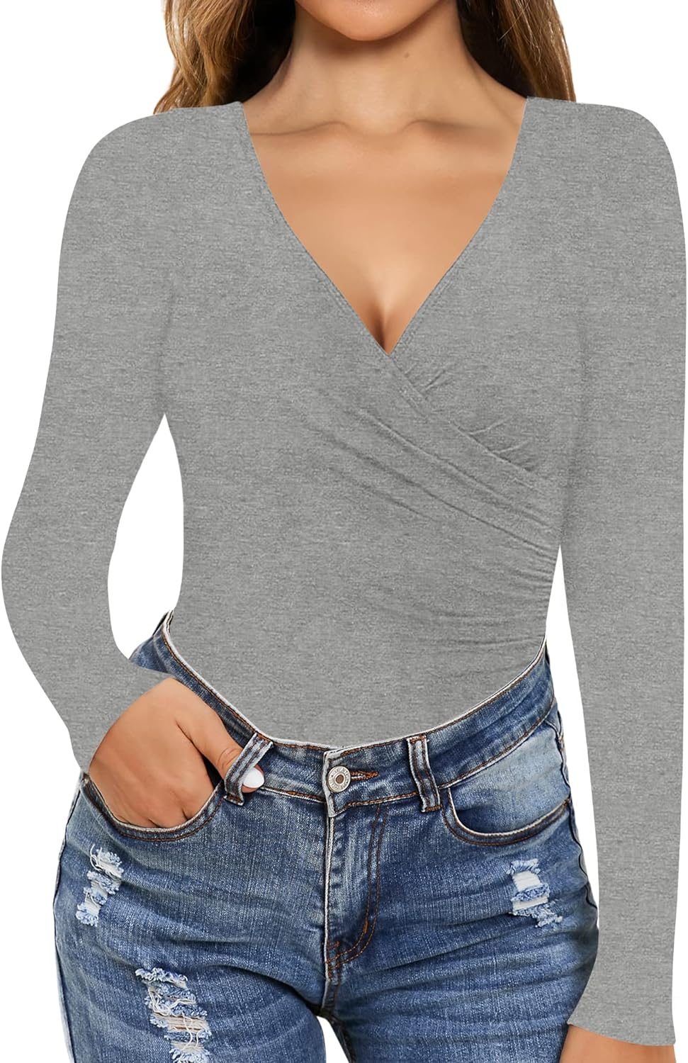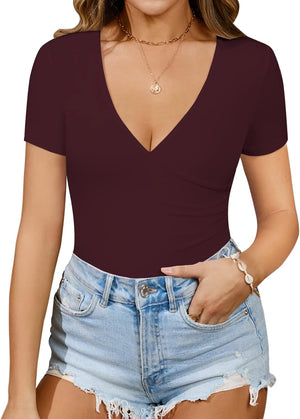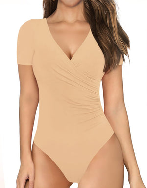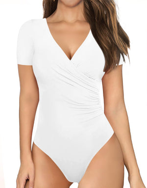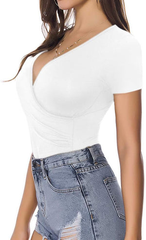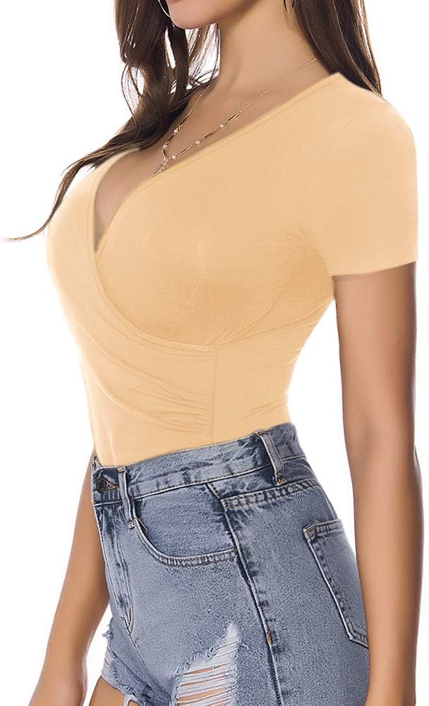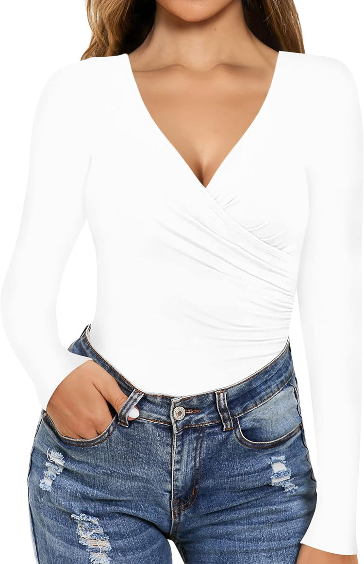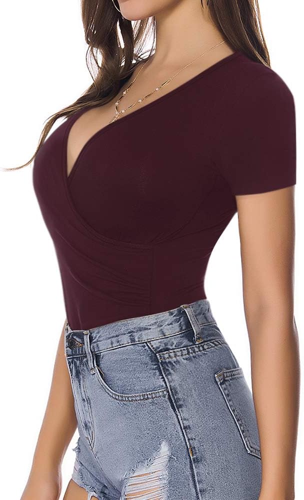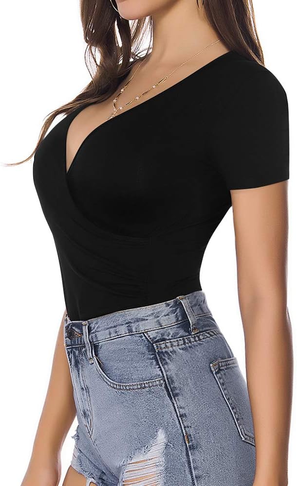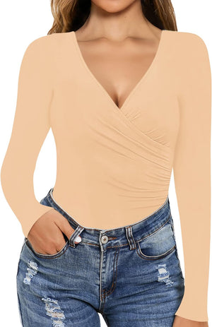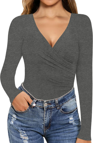 MANGOPOP Women's Cross Wrap Ruched Plunge Neck Deep V Long Sleeve Short Sleeve Bodysuits