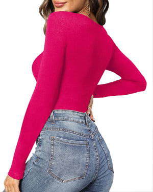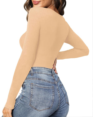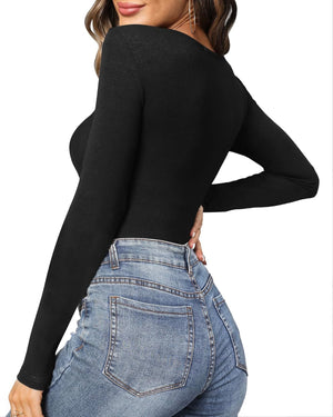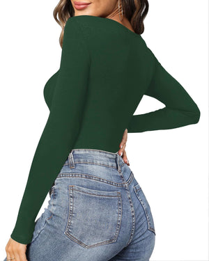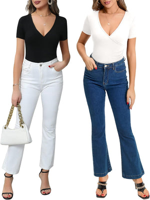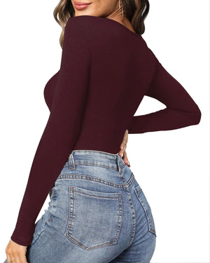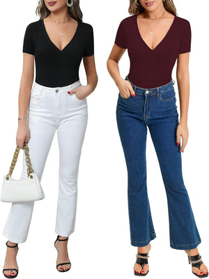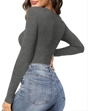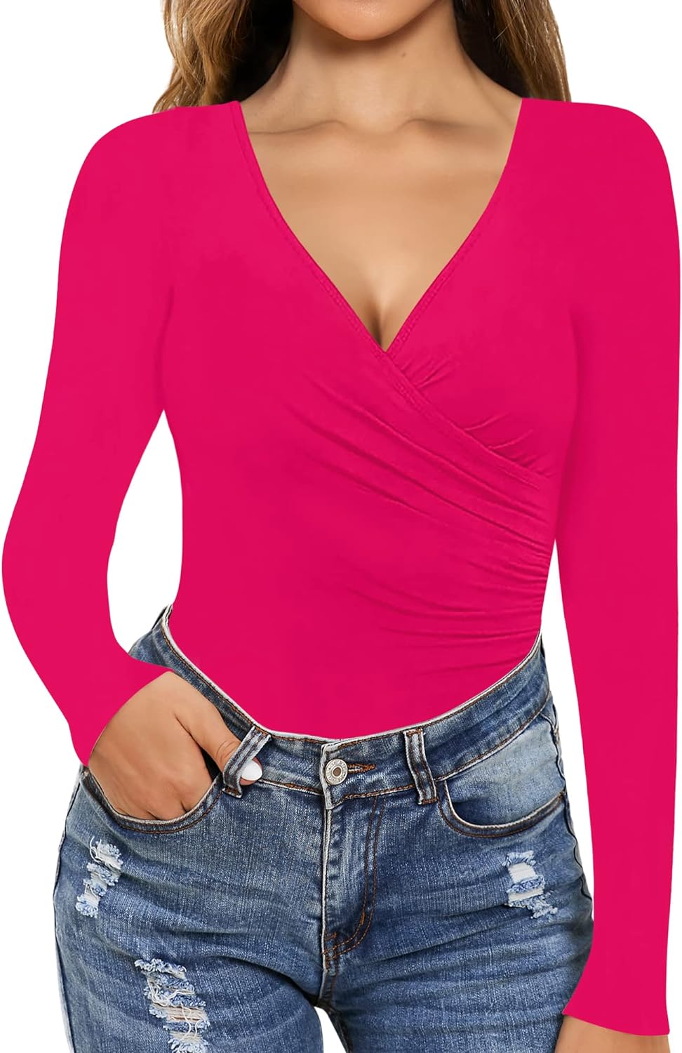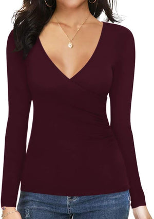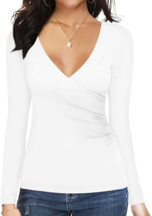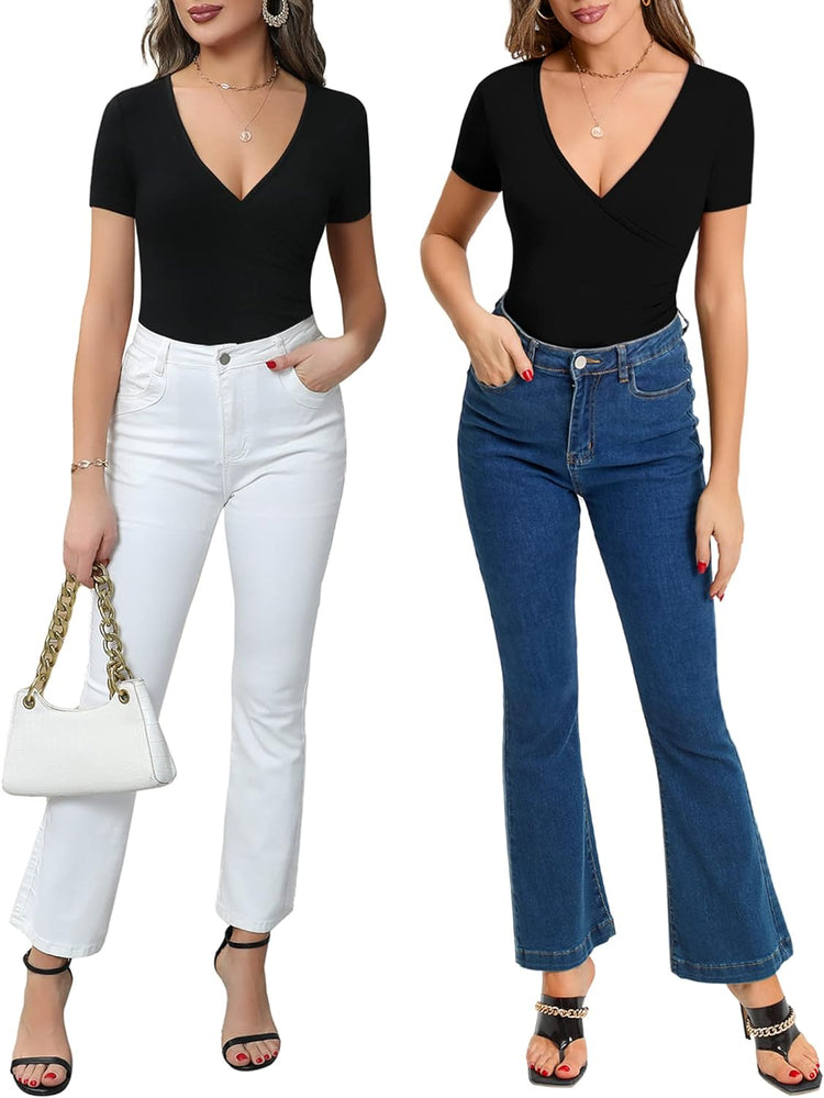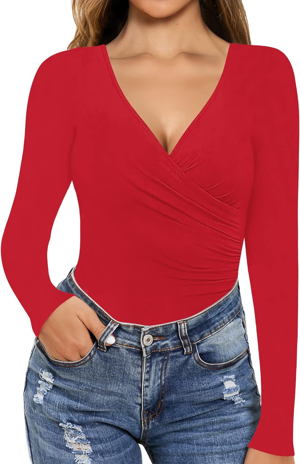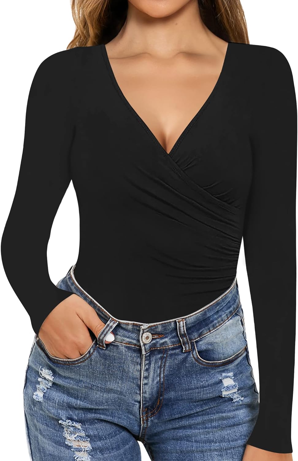 MANGOPOP Women's Cross Wrap Ruched Plunge Neck Deep V Long Sleeve Short Sleeve Bodysuits
