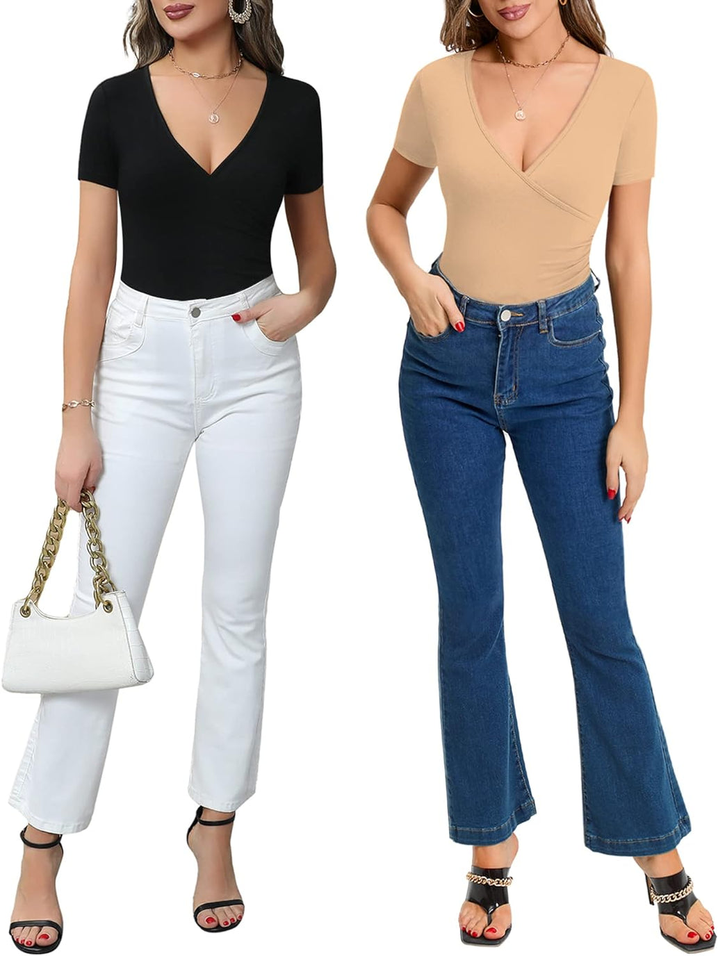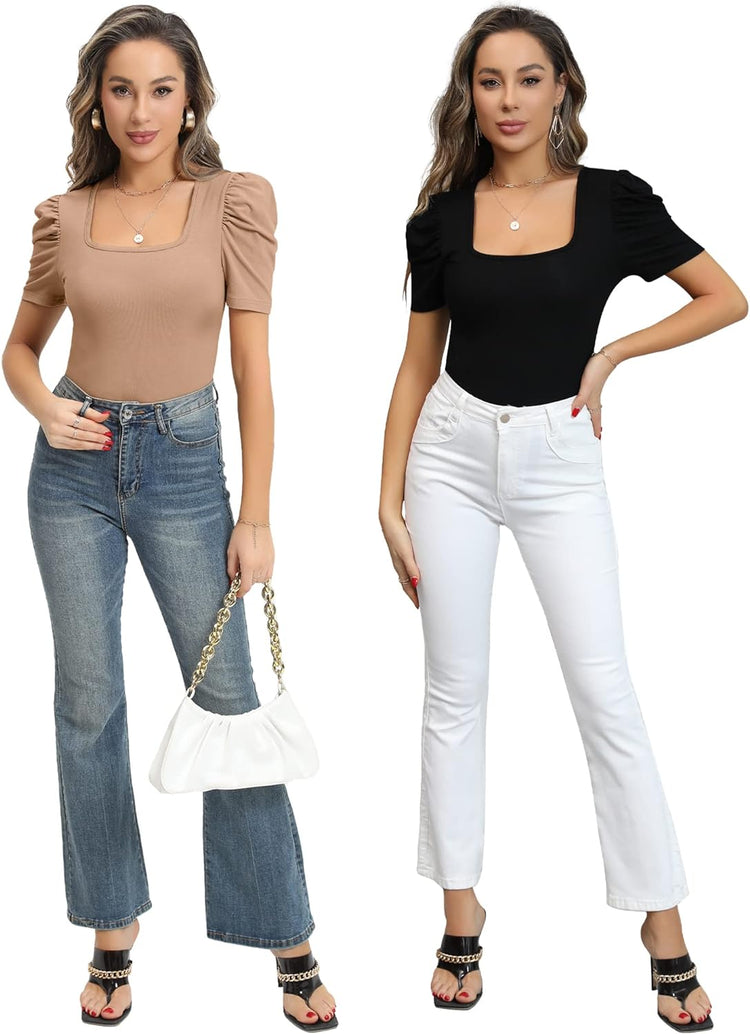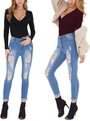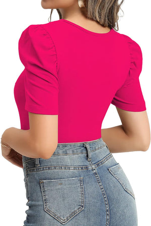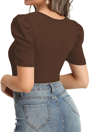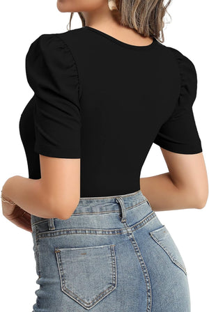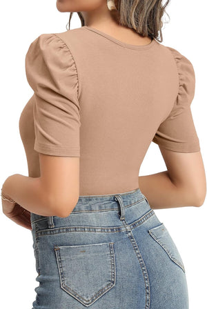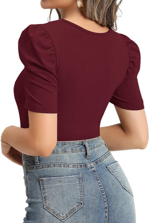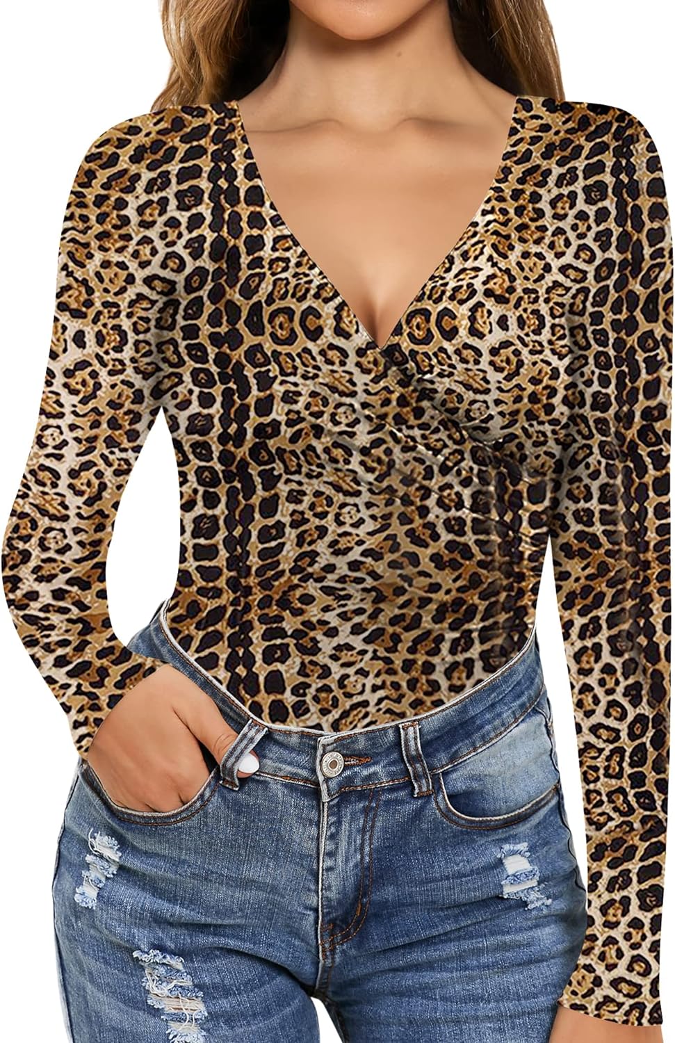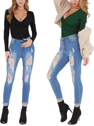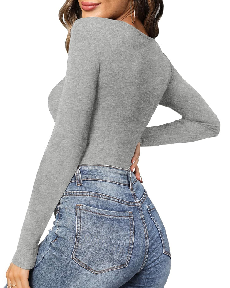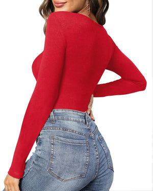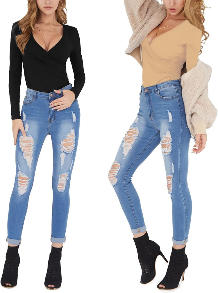 MANGOPOP Women's Cross Wrap Ruched Plunge Neck Deep V Long Sleeve Short Sleeve Bodysuits
