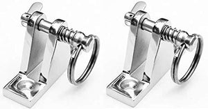 Two Stainless Steel Top Bimini Deck Hinges with Pin and Ring . Deck hinge features a flat base for deck mounting and Spring-loaded stainless steel pin for easy top removal All welded seams are smooth and surface has a highly polished finish. Length is 2-1/4", wodth is 3/4". Pin Diameter is 0.2". Installs with #5(M5) screws (sold separatedly)
