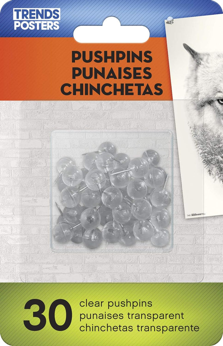 - INCLUDES 30 CLEAR PLASTIC PUSH PINS with steel needle points to easily hang your poster or other lightweight objects such as photos, papers, or artwork to a wall, cork board, bulletin board, and more