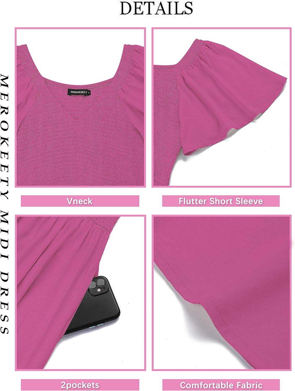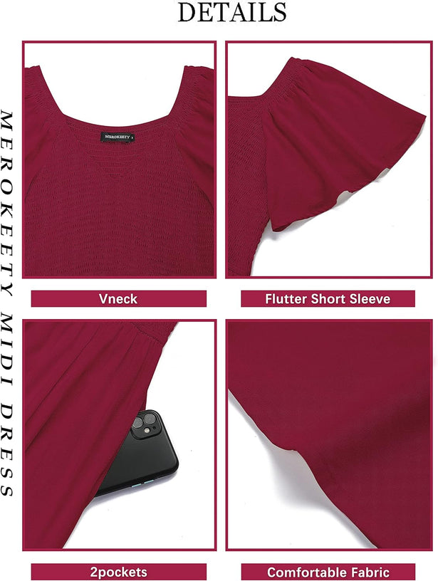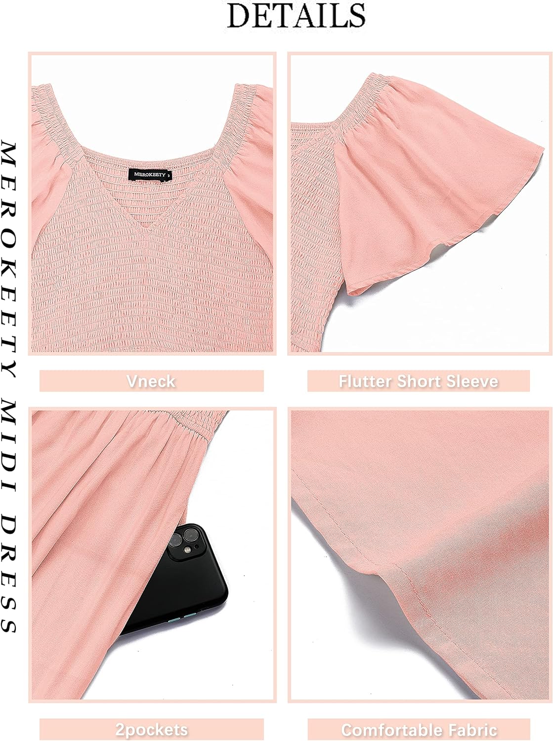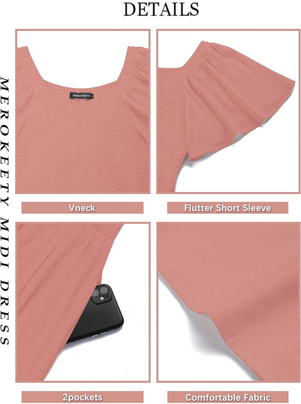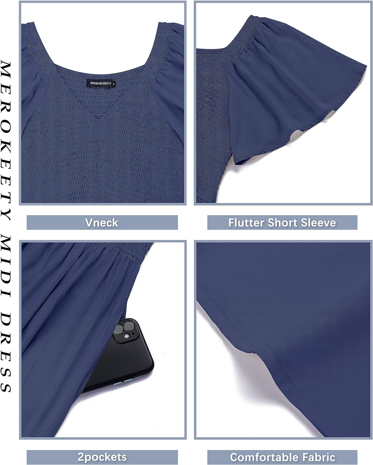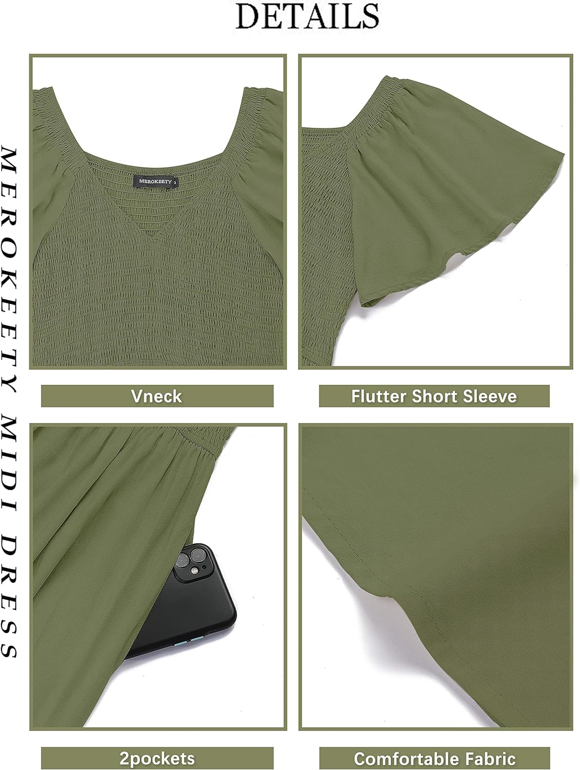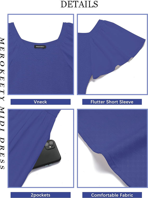 MEROKEETY Womens Summer Casual V Neck Ruffle Sleeve Smocked High Waist Midi Dress with Pockets