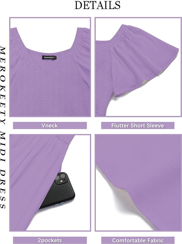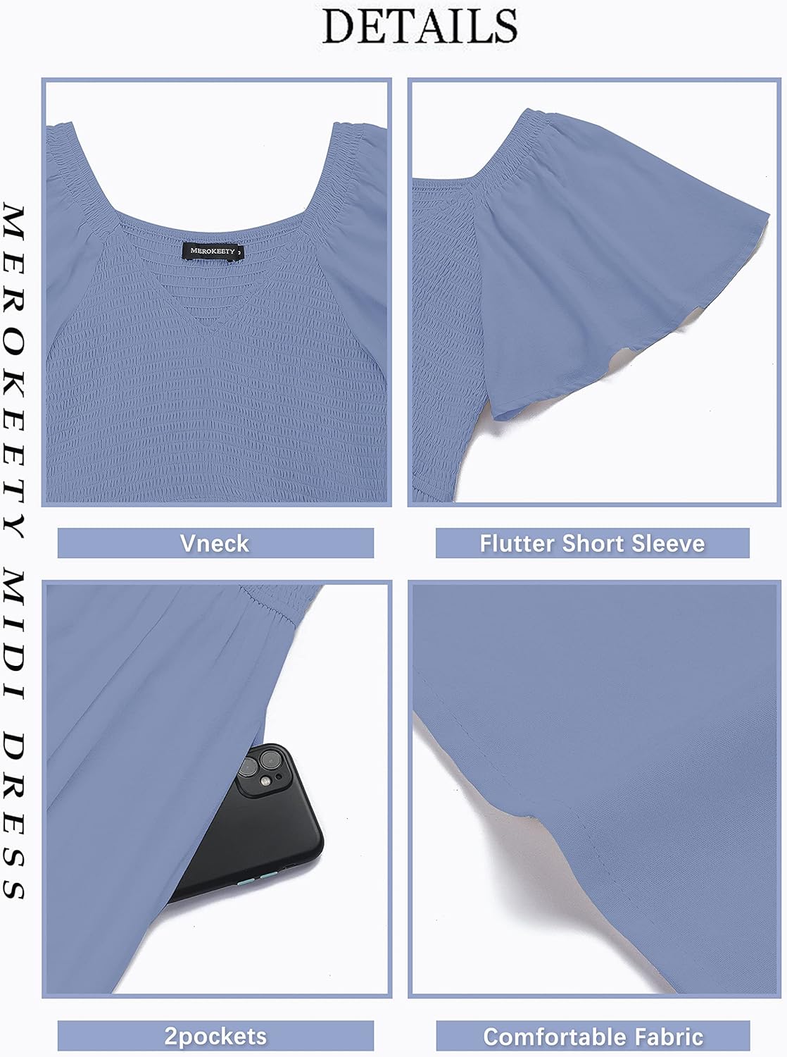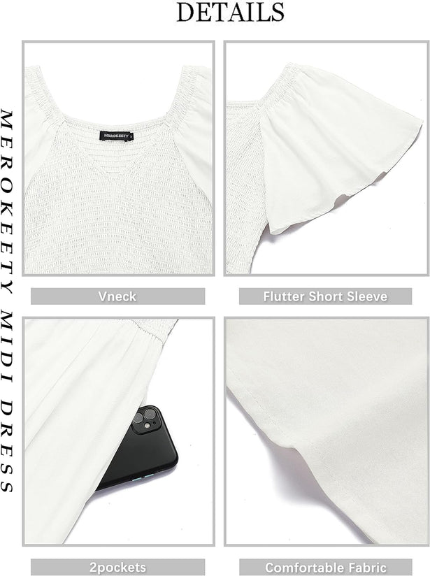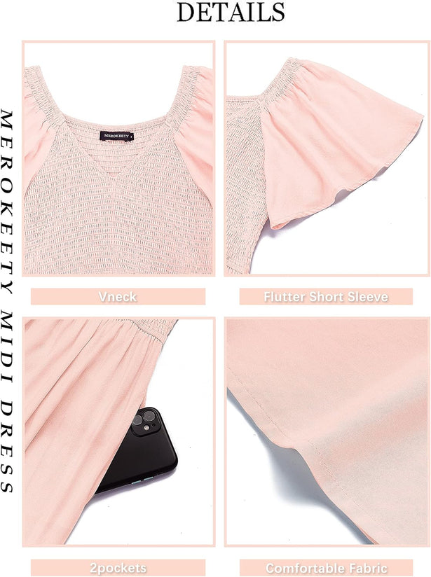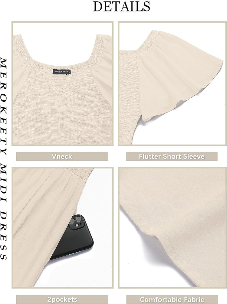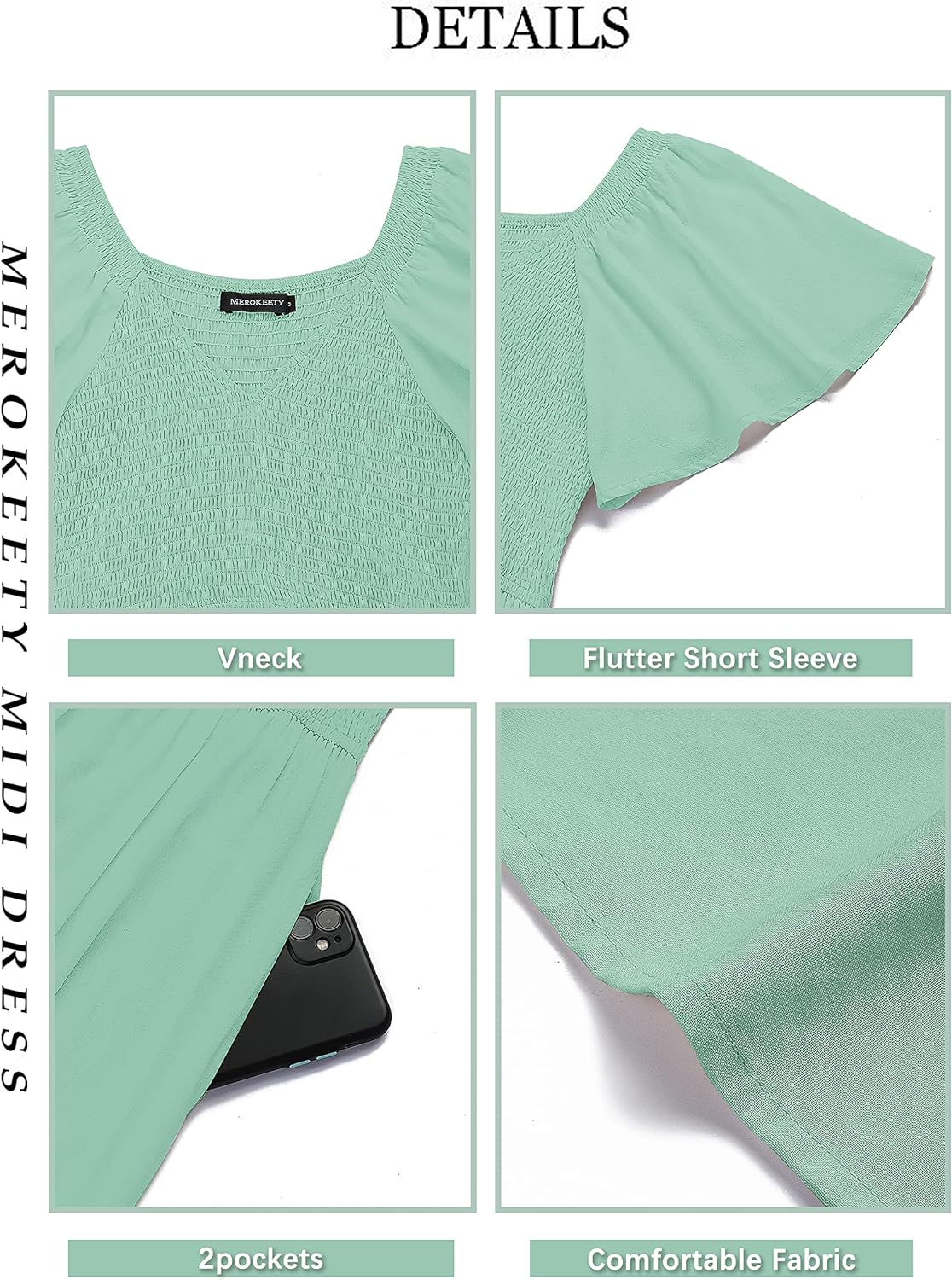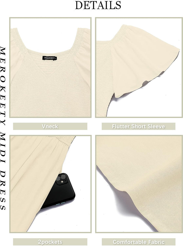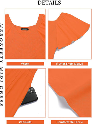 MEROKEETY Womens Summer Casual V Neck Ruffle Sleeve Smocked High Waist Midi Dress with Pockets