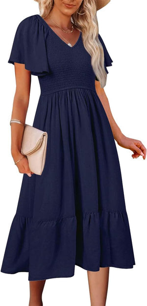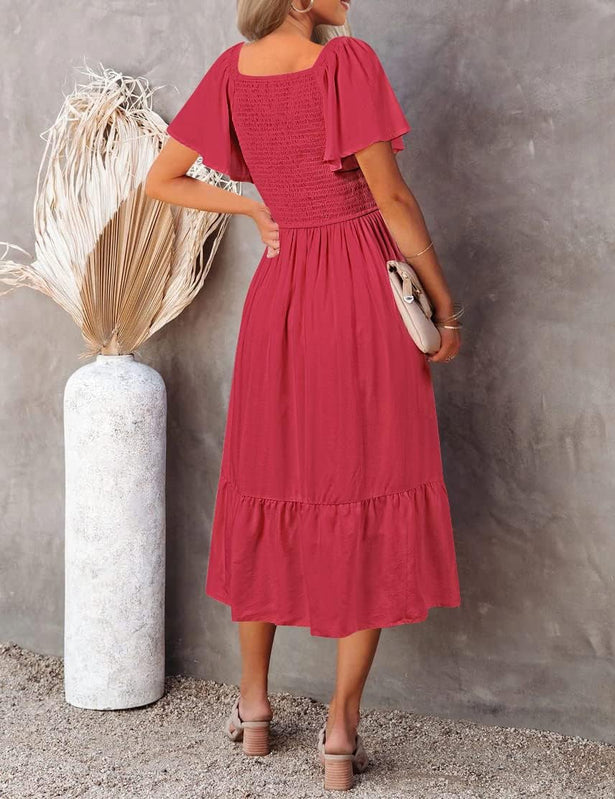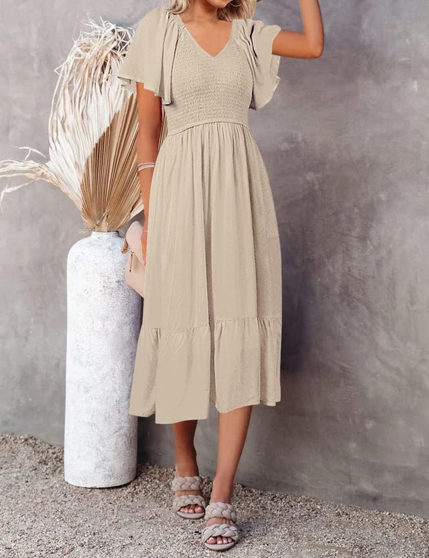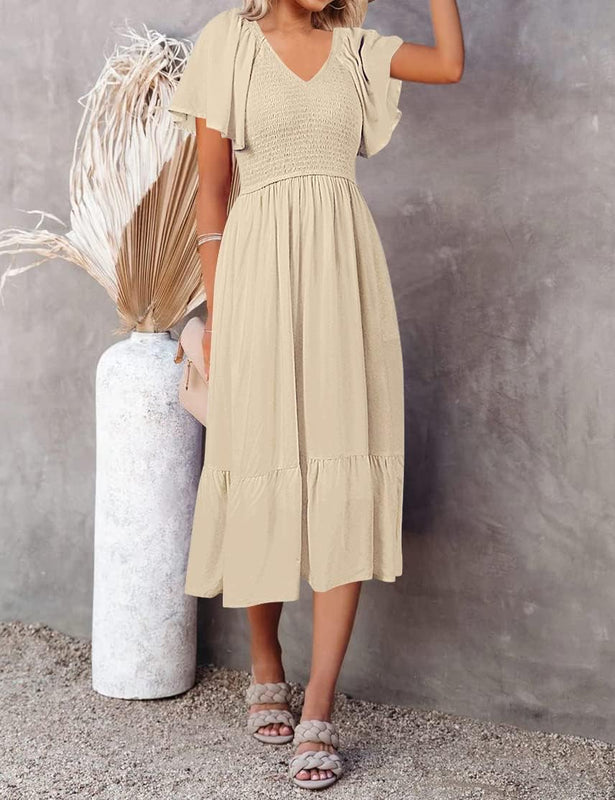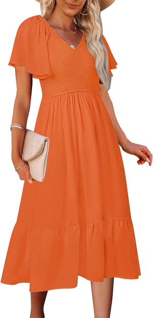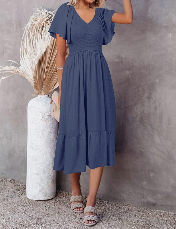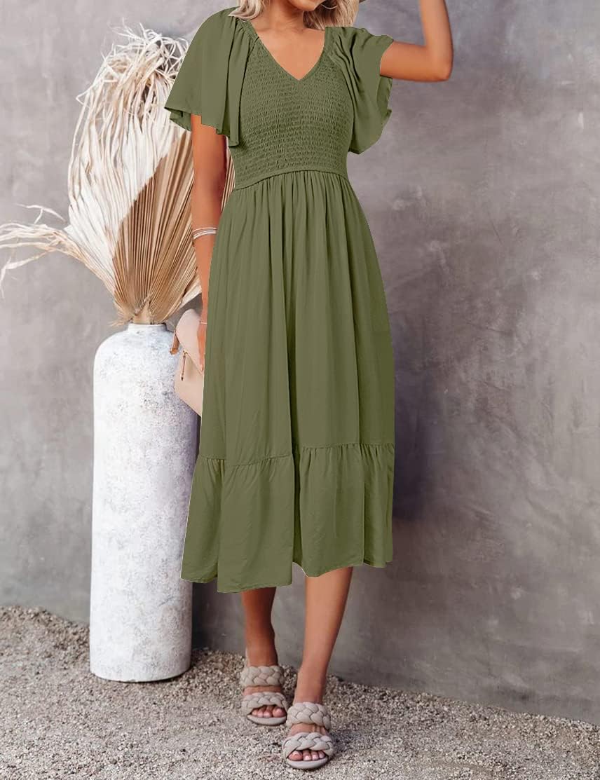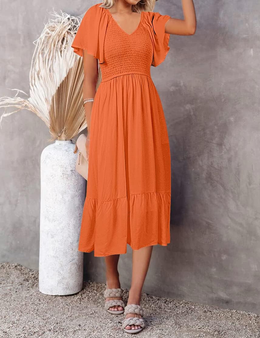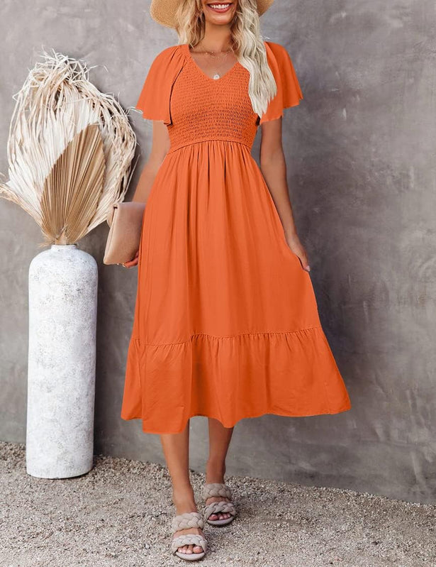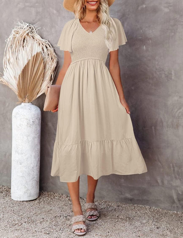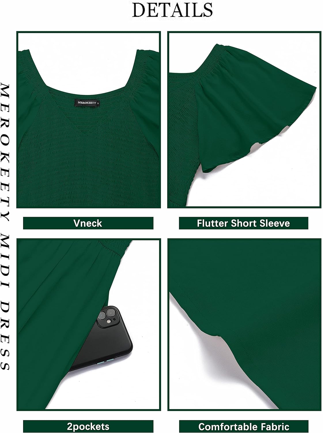 MEROKEETY Womens Summer Casual V Neck Ruffle Sleeve Smocked High Waist Midi Dress with Pockets