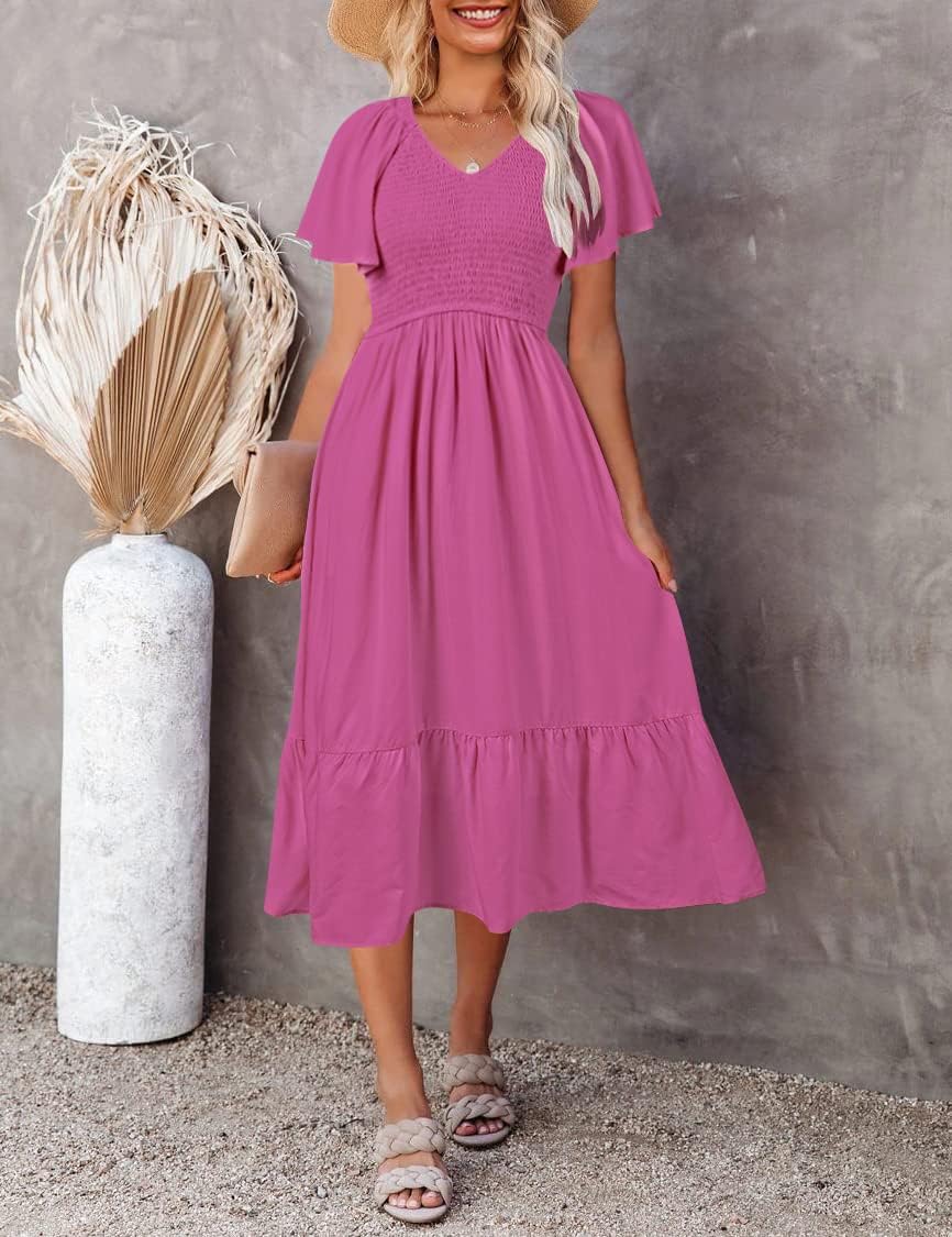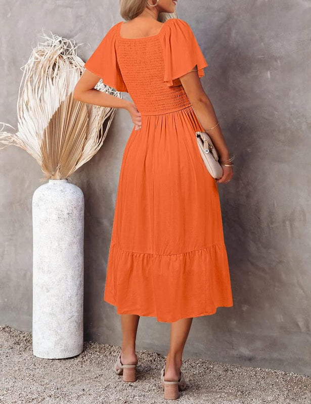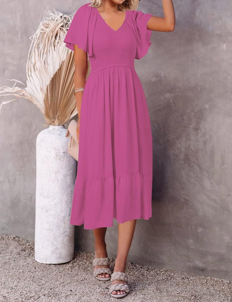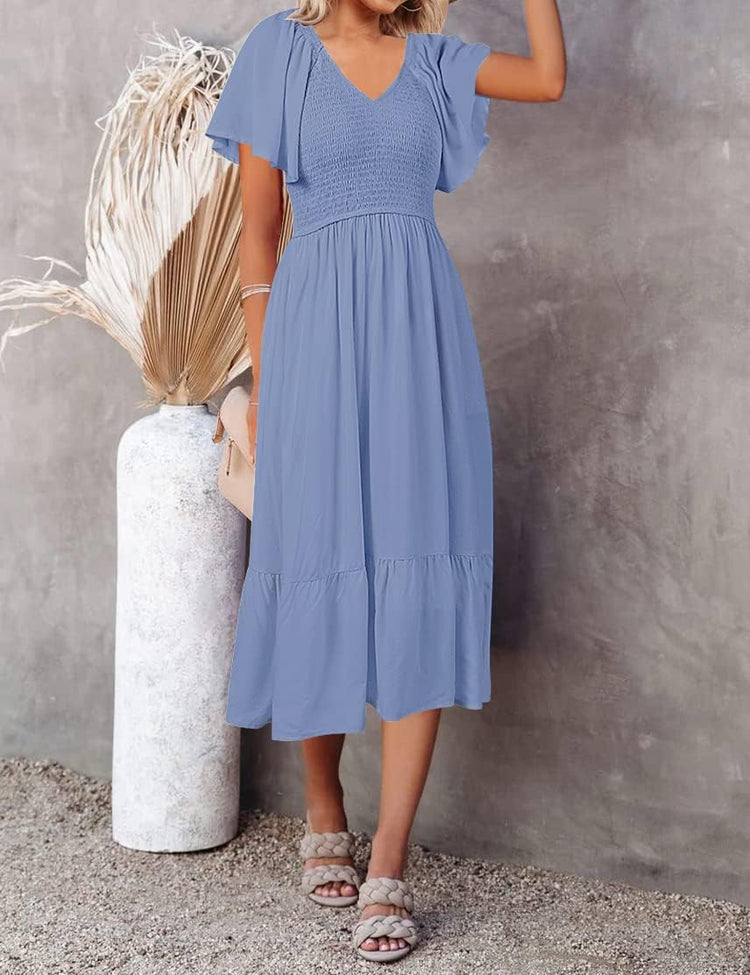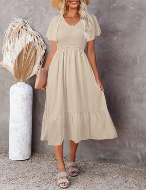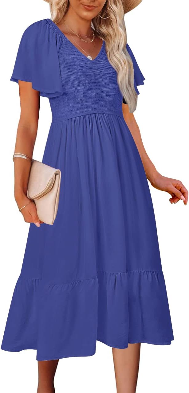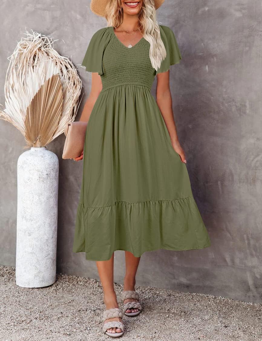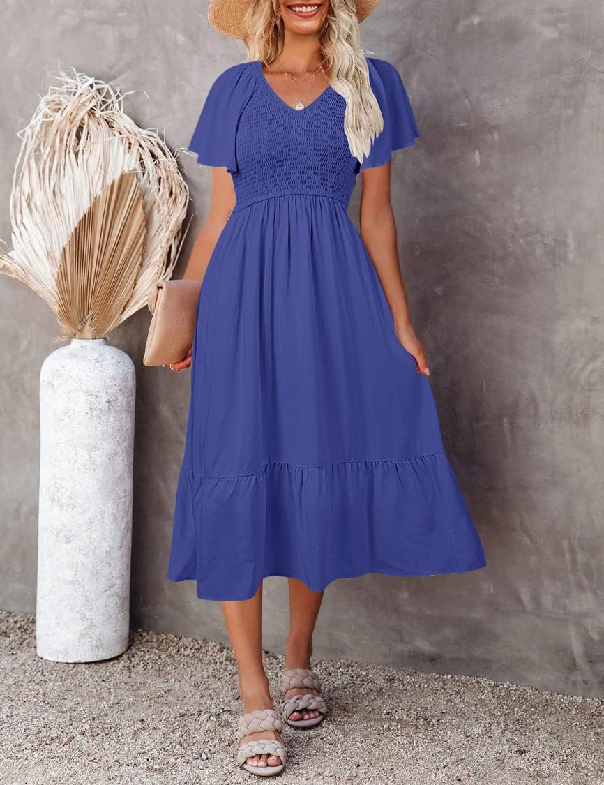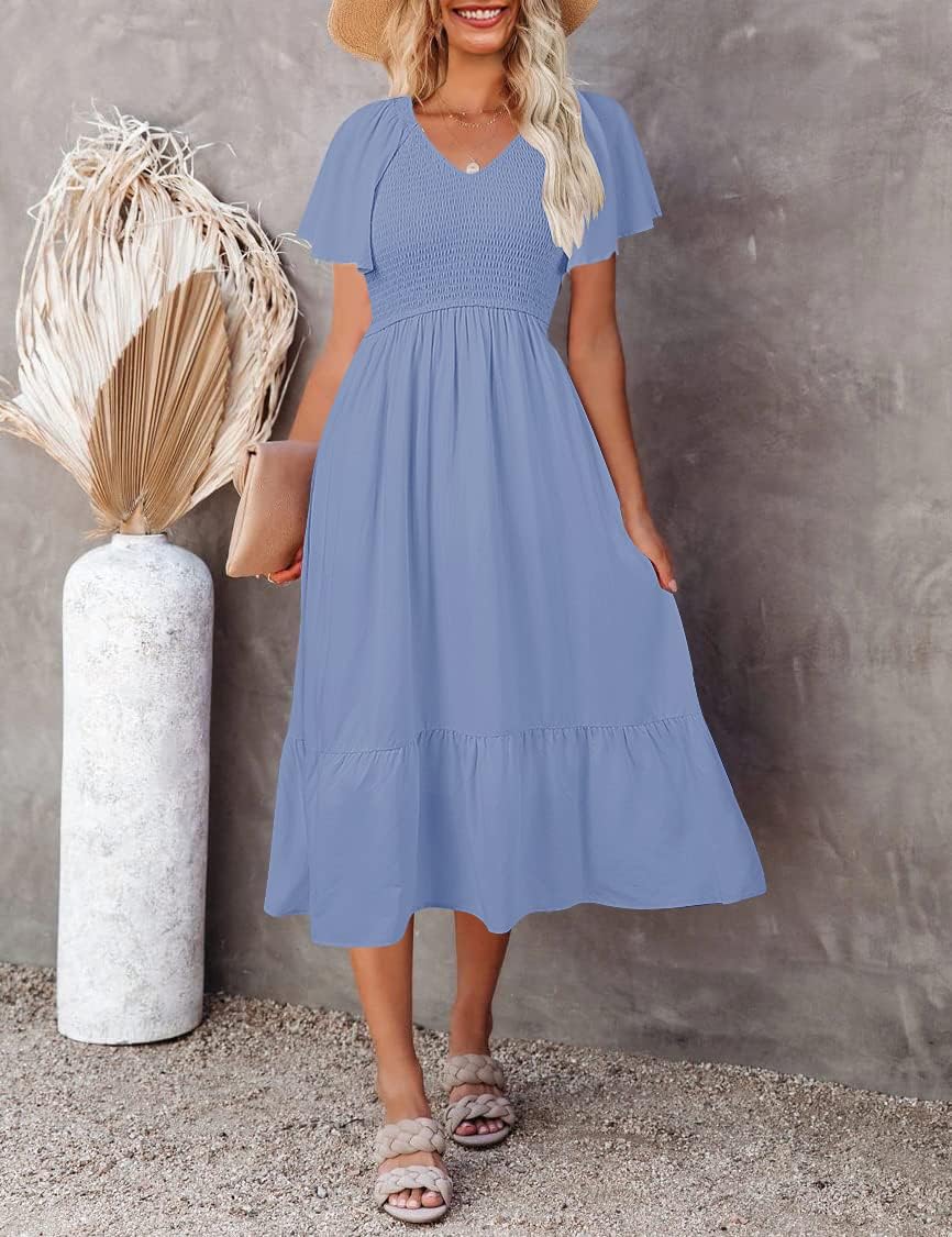 MEROKEETY Womens Summer Casual V Neck Ruffle Sleeve Smocked High Waist Midi Dress with Pockets