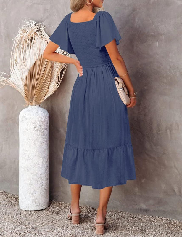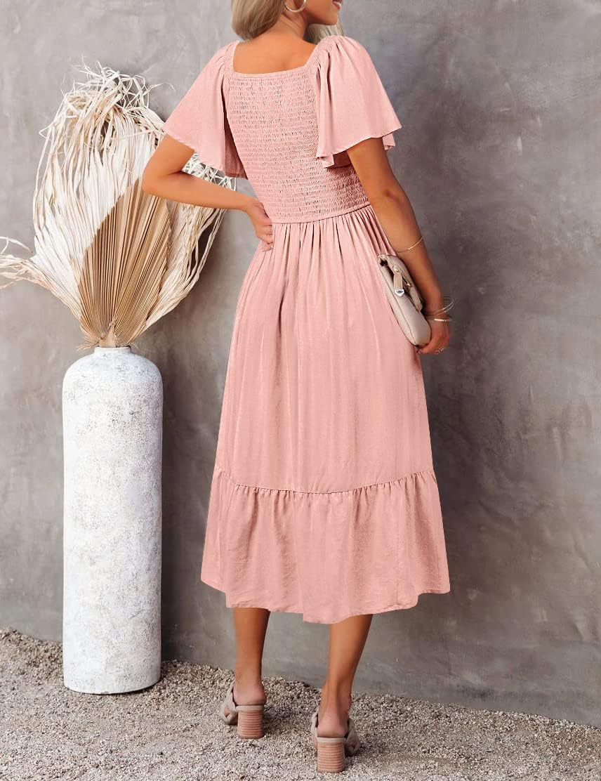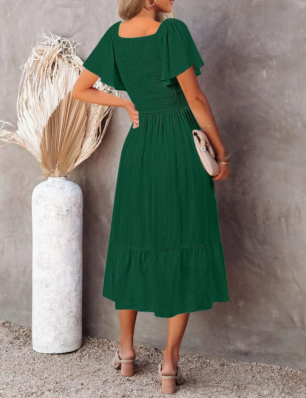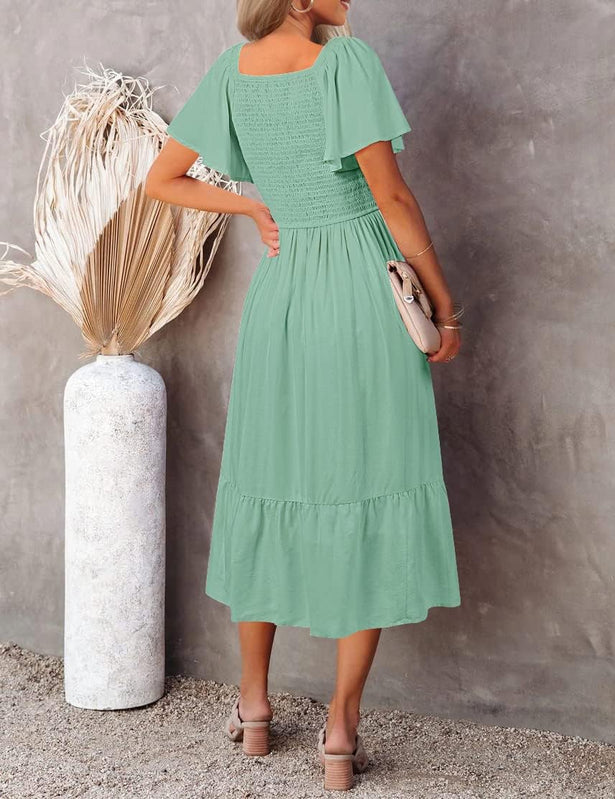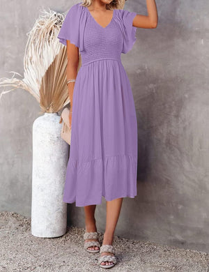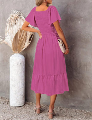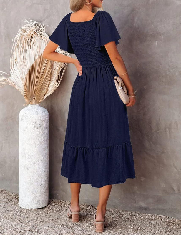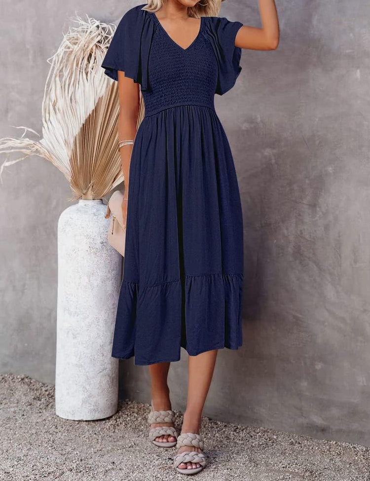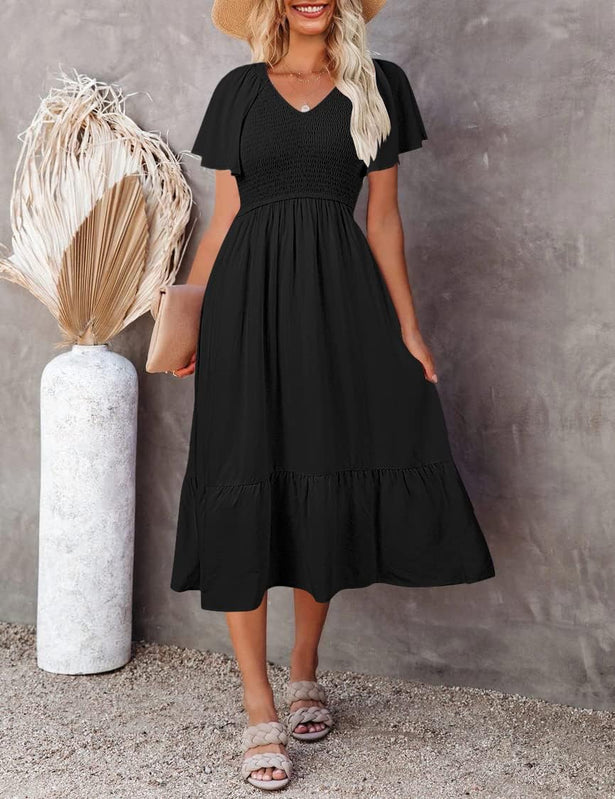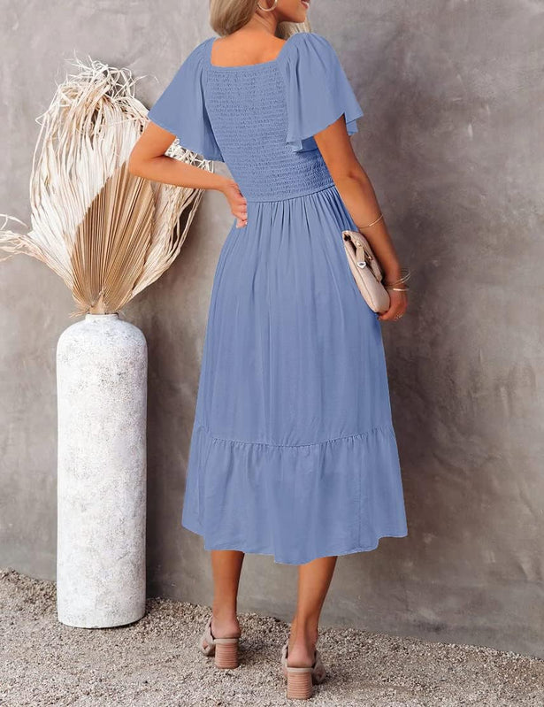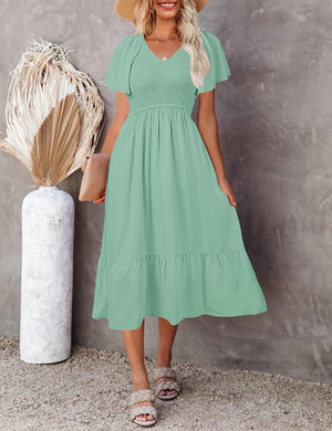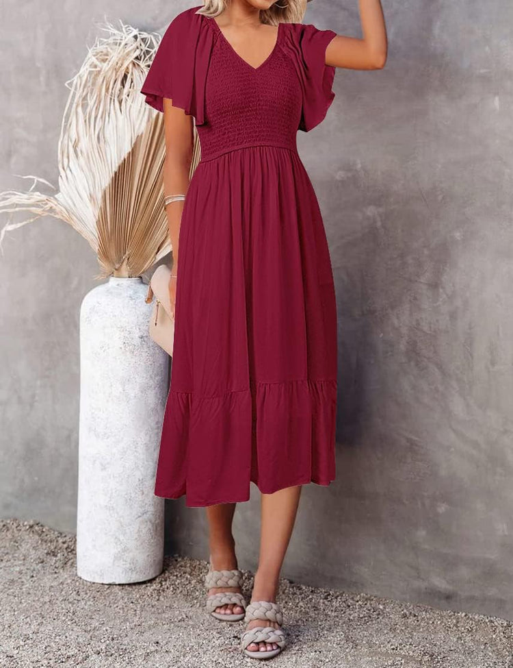 MEROKEETY Womens Summer Casual V Neck Ruffle Sleeve Smocked High Waist Midi Dress with Pockets