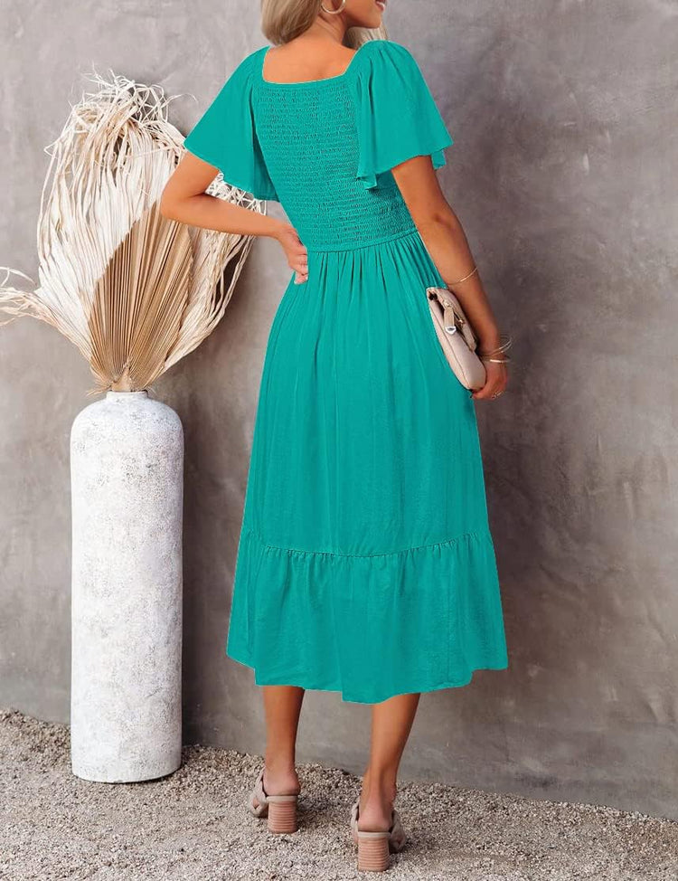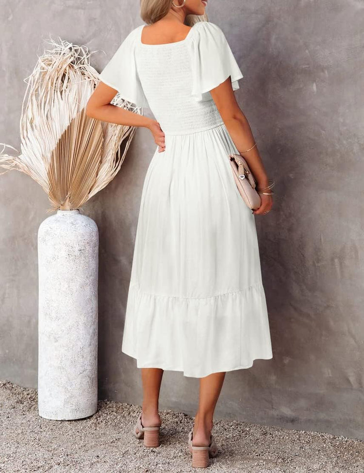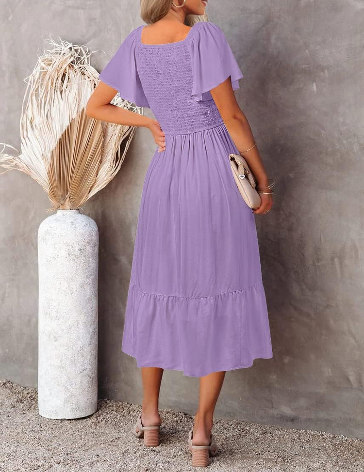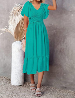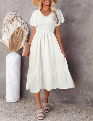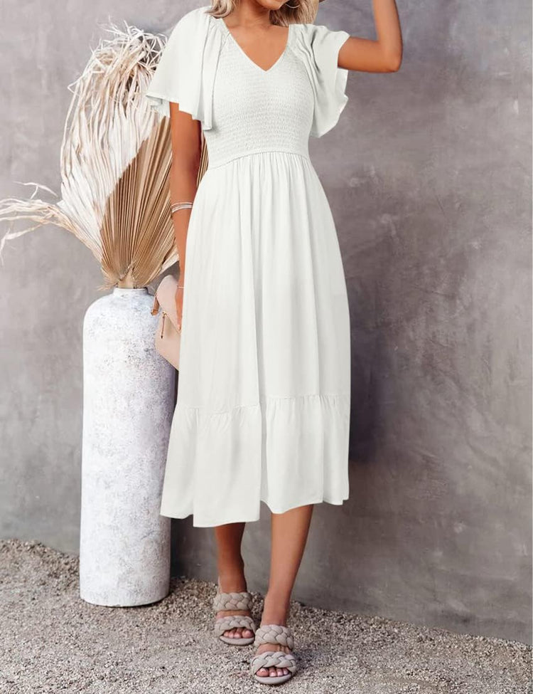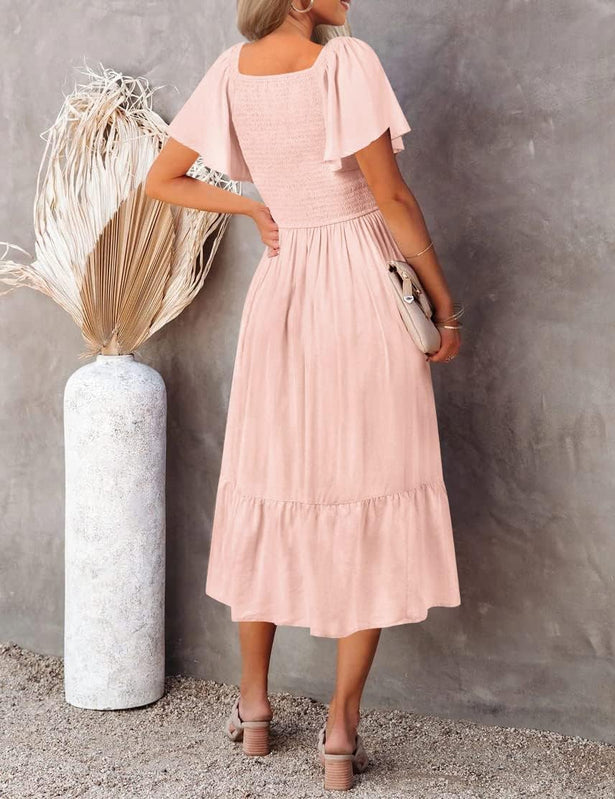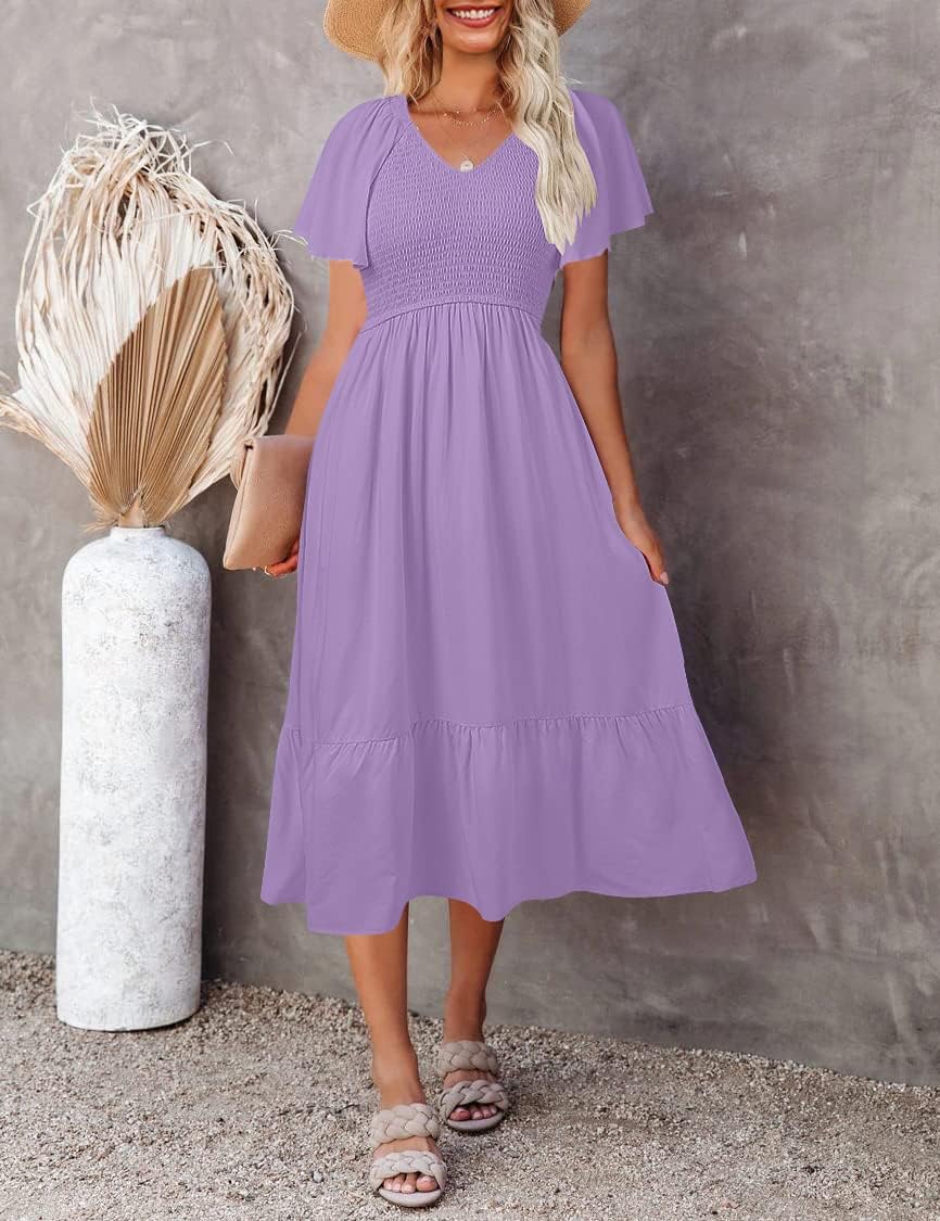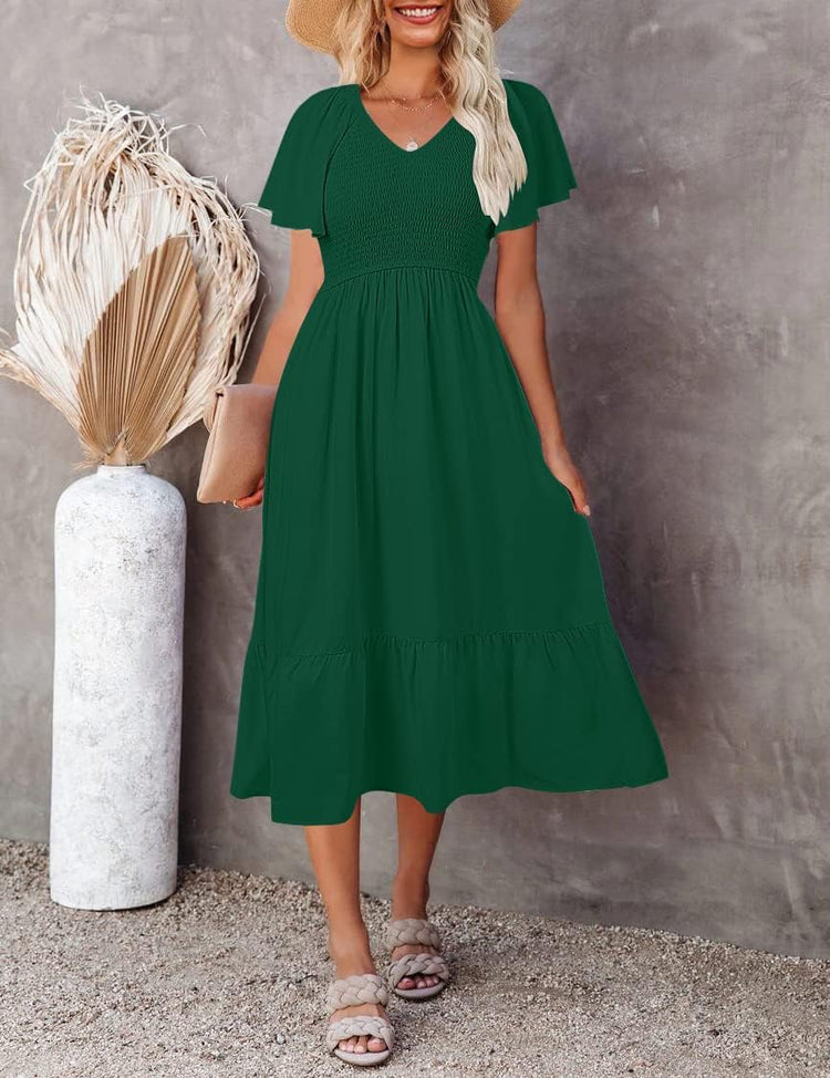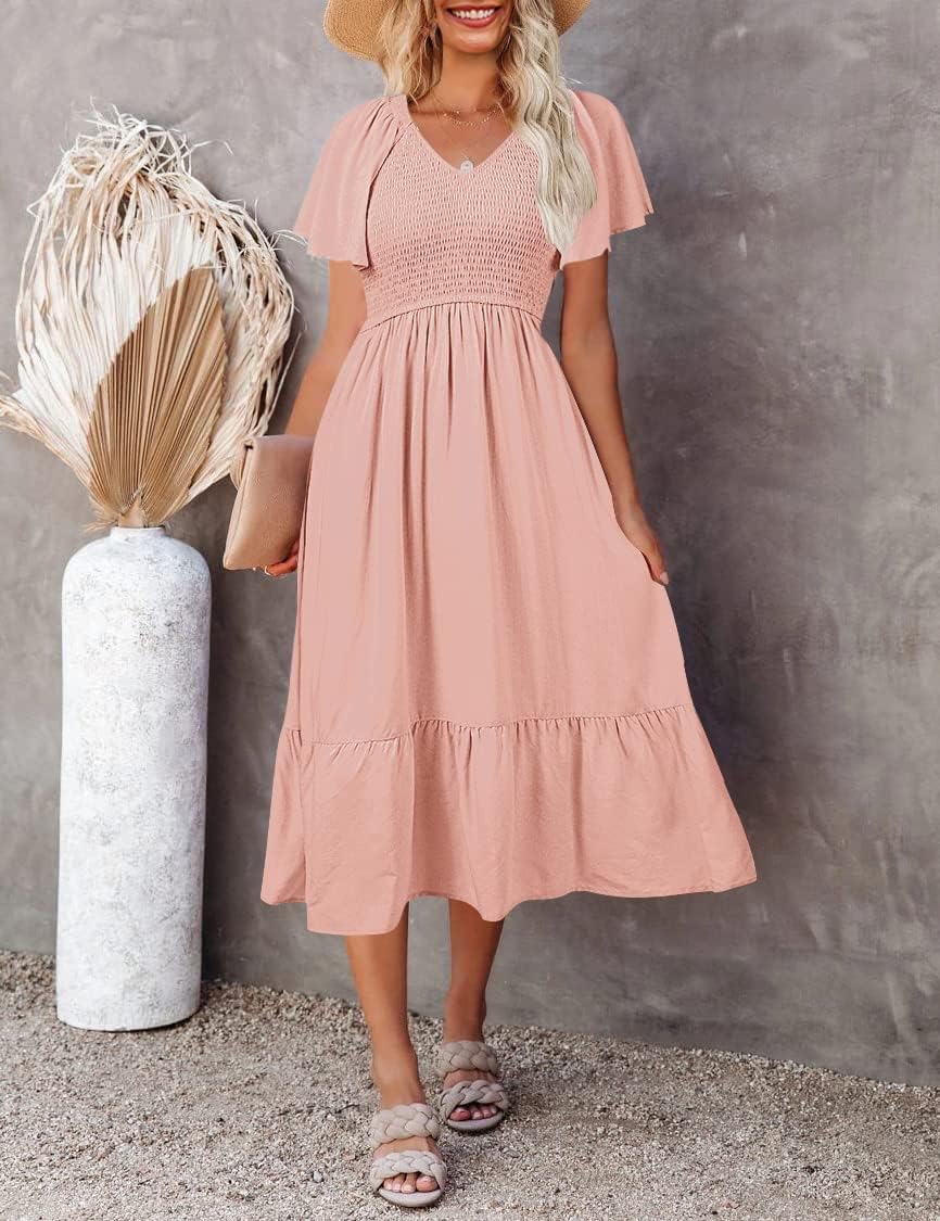 MEROKEETY Womens Summer Casual V Neck Ruffle Sleeve Smocked High Waist Midi Dress with Pockets
